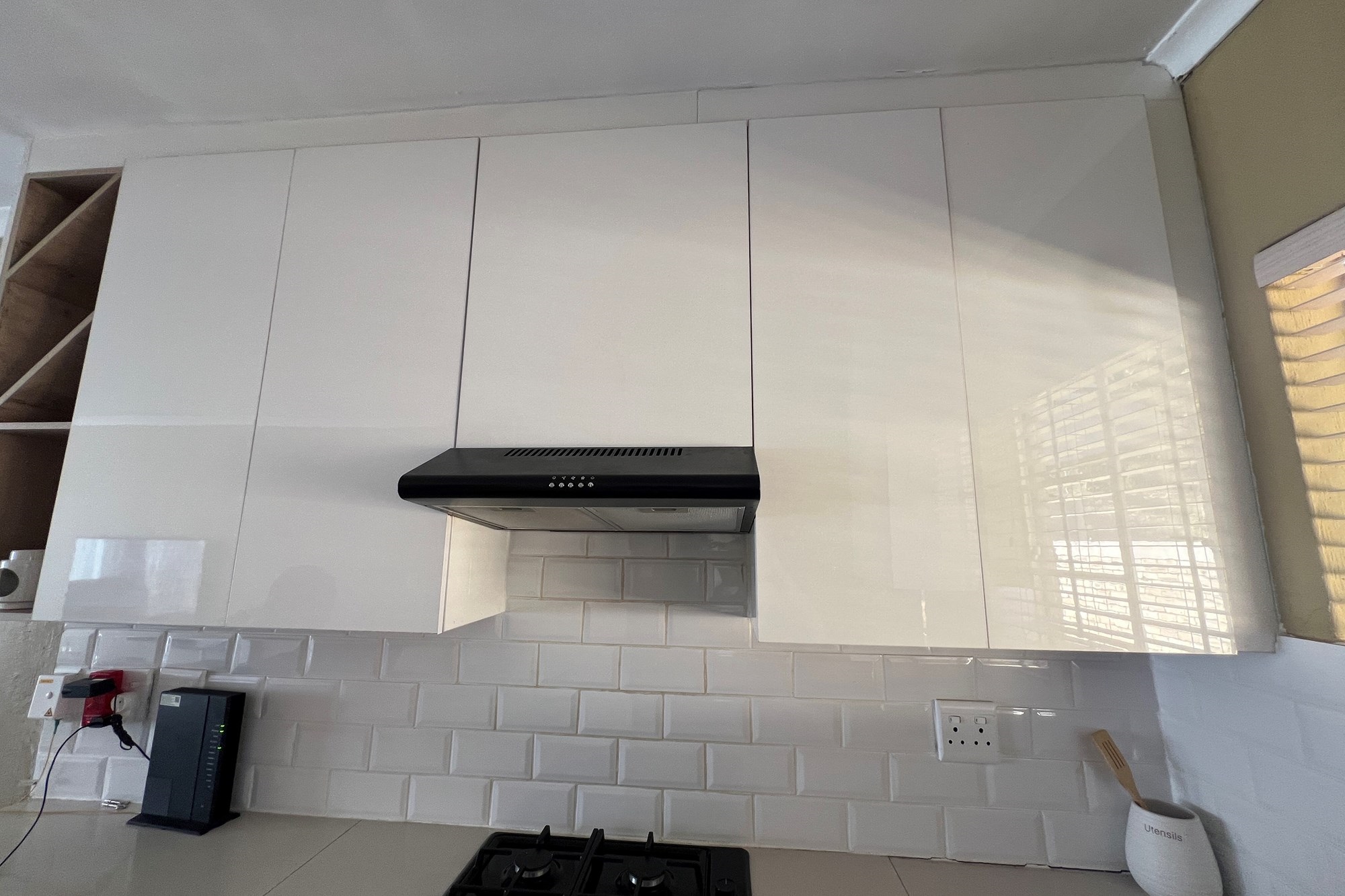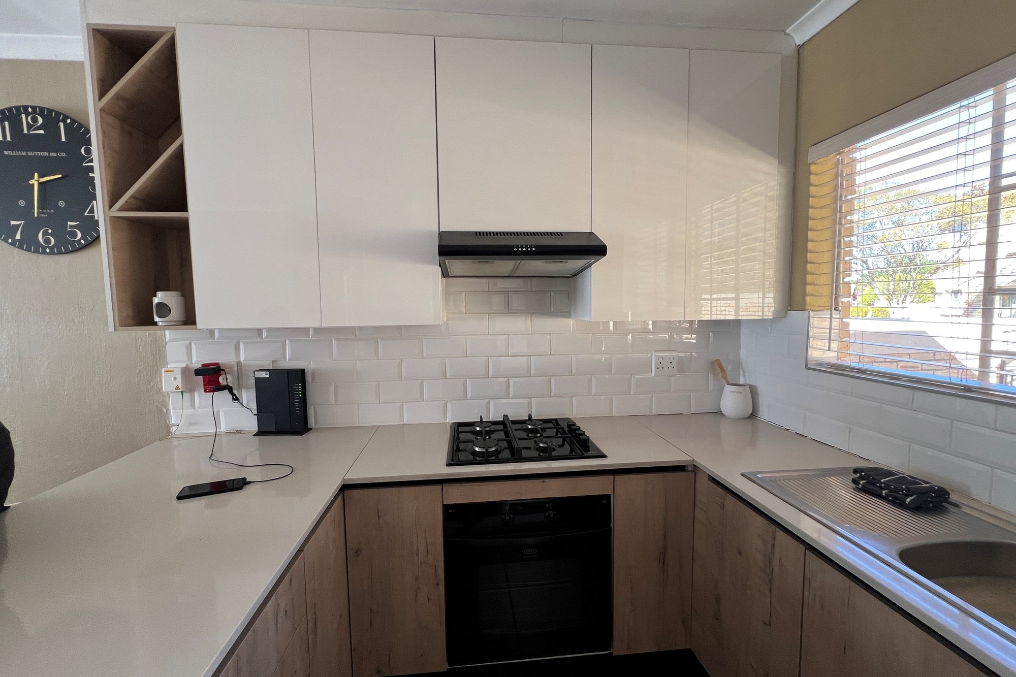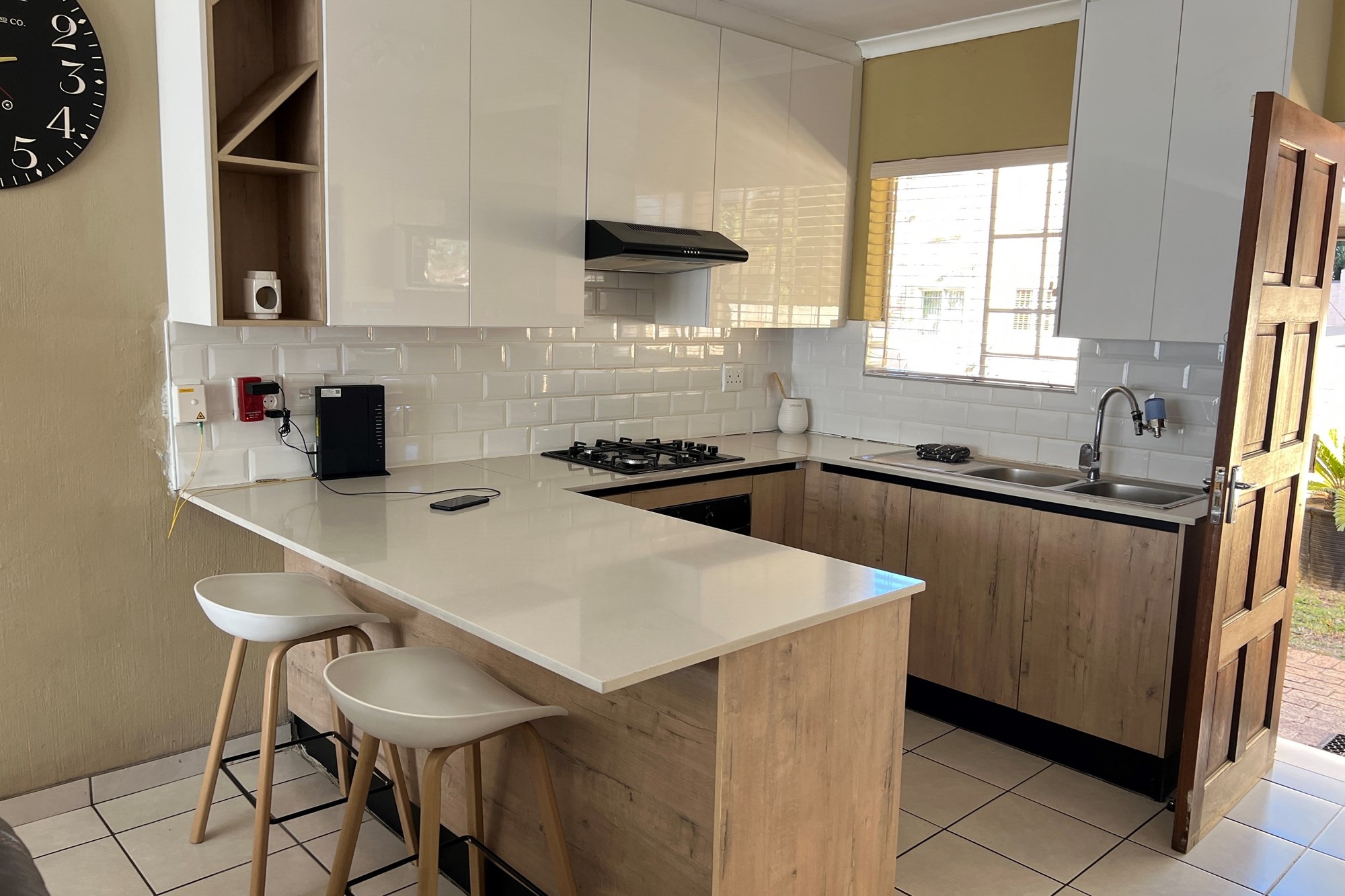 The home has an open-plan layout with a tiled living room and a modern kitchen fitted with built-in cupboards, a double sink, gas stove, oven, extractor fan, and a filter tap. All bedrooms include built-in cupboards and laminated floors, with two of the rooms having TV brackets installed.
