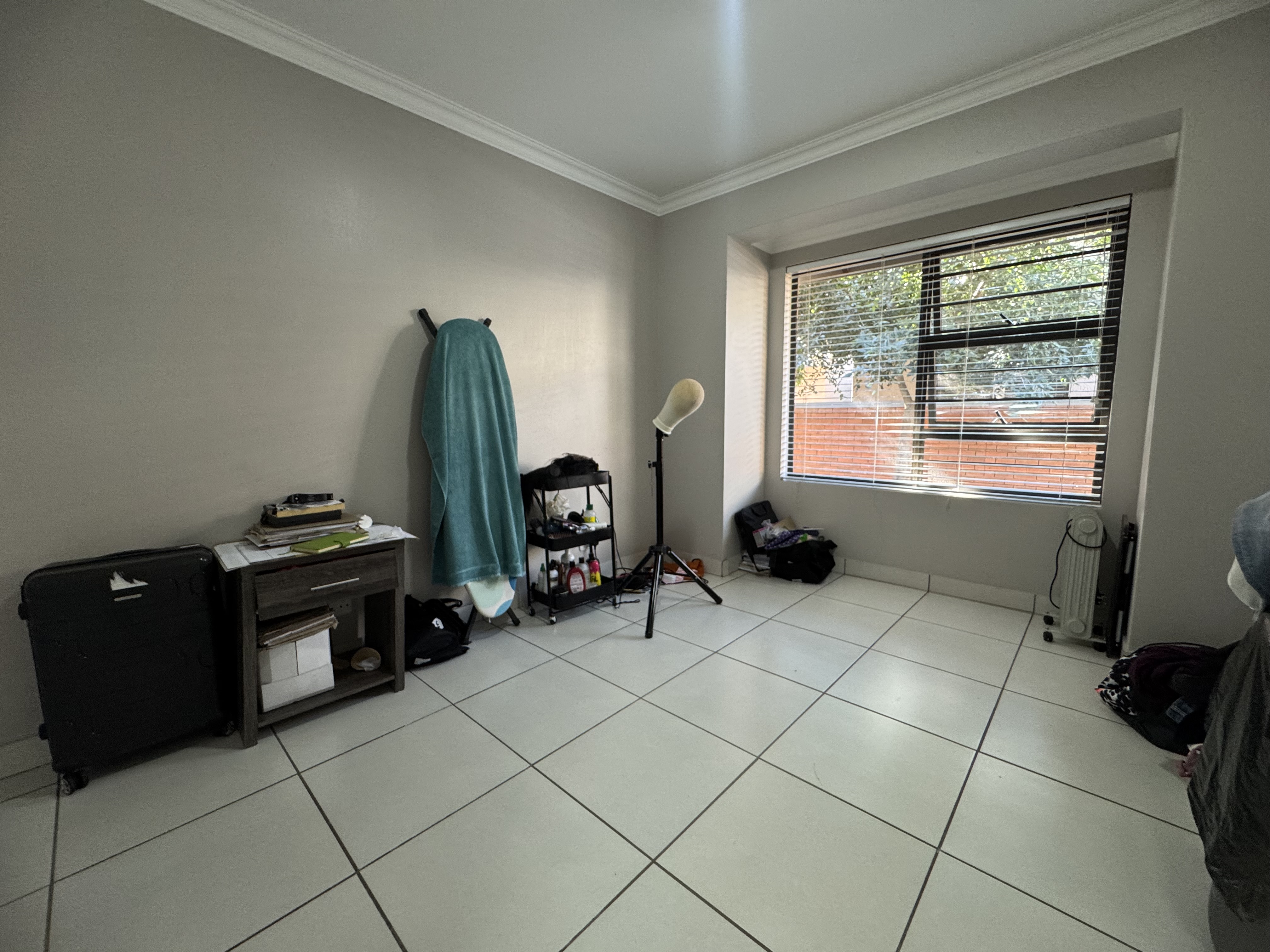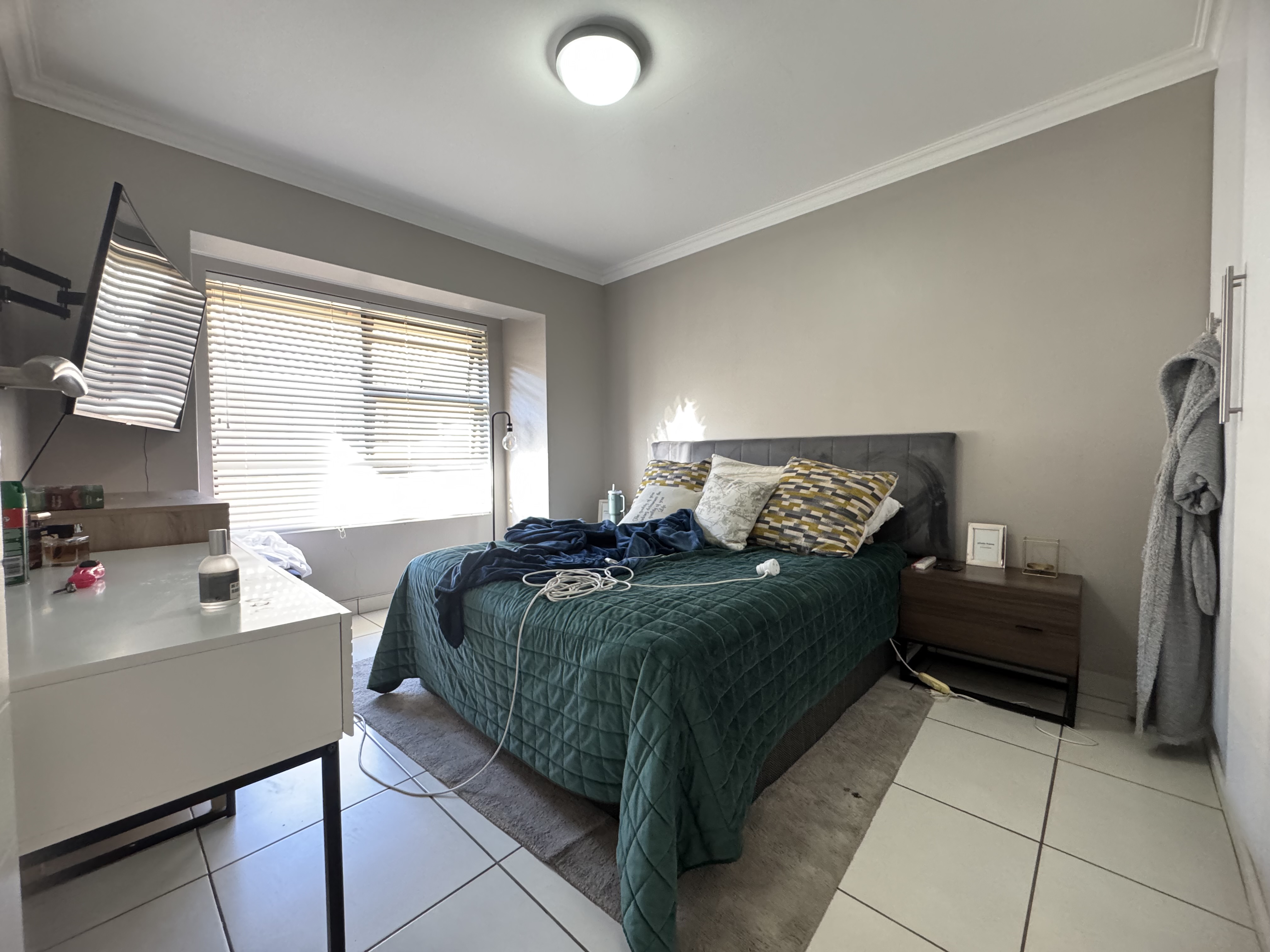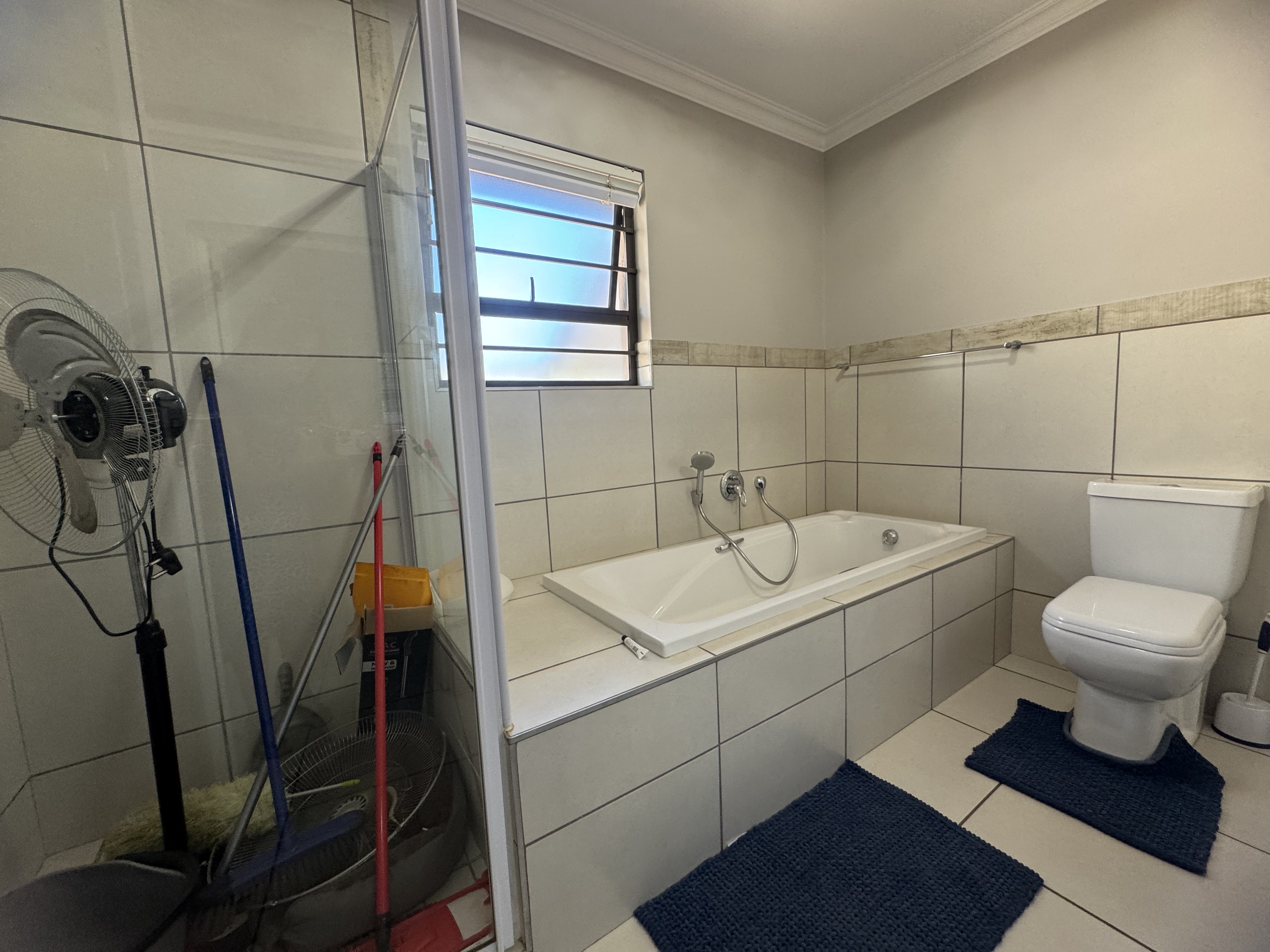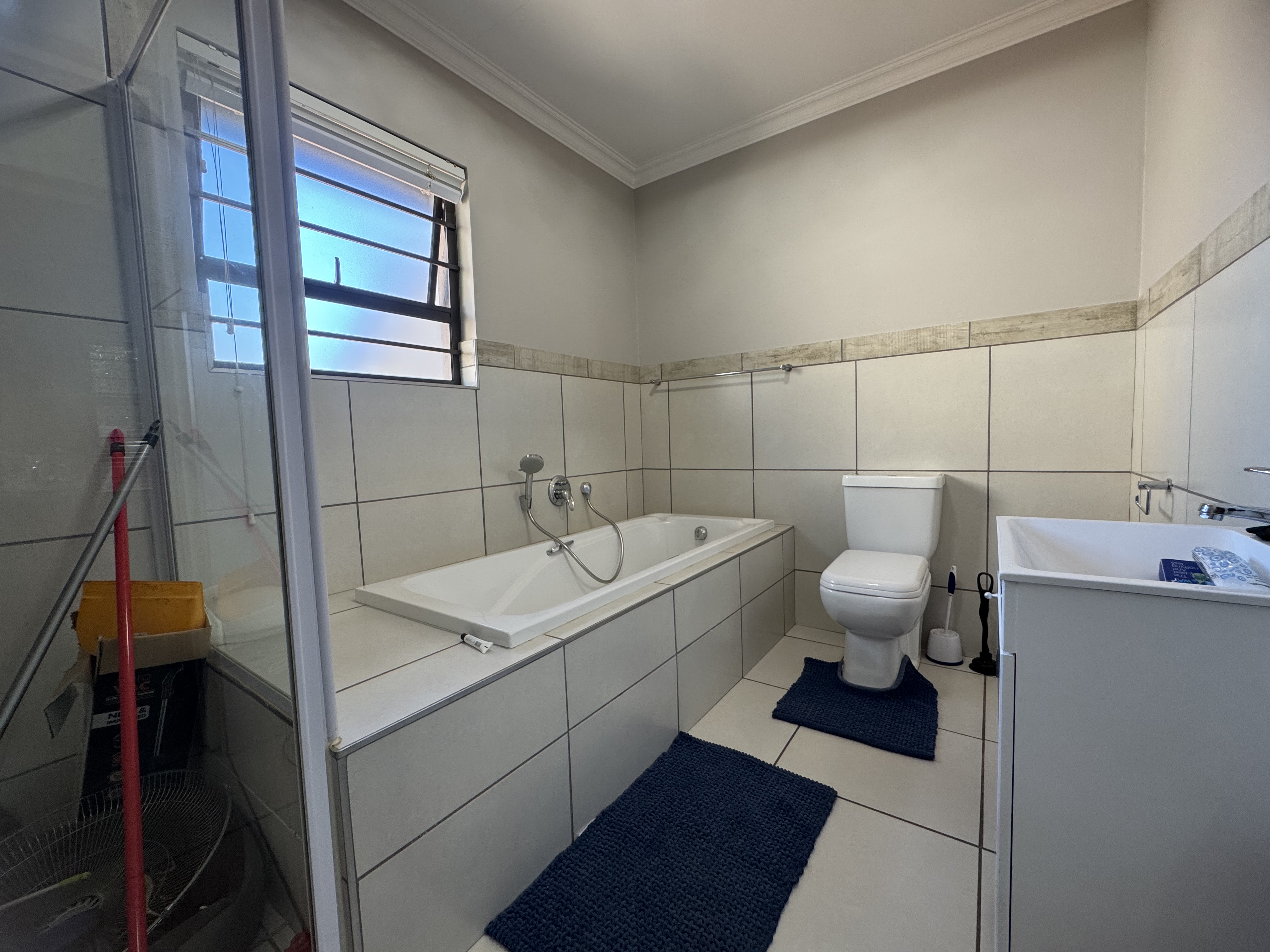 Both bedrooms feature built-in cupboards, blinds, and sleek tiled flooring throughout. The main bedroom boasts an en-suite bathroom, while the second bathroom conveniently serves guests and the additional bedroom. A linen cupboard in the passage offers extra storage.