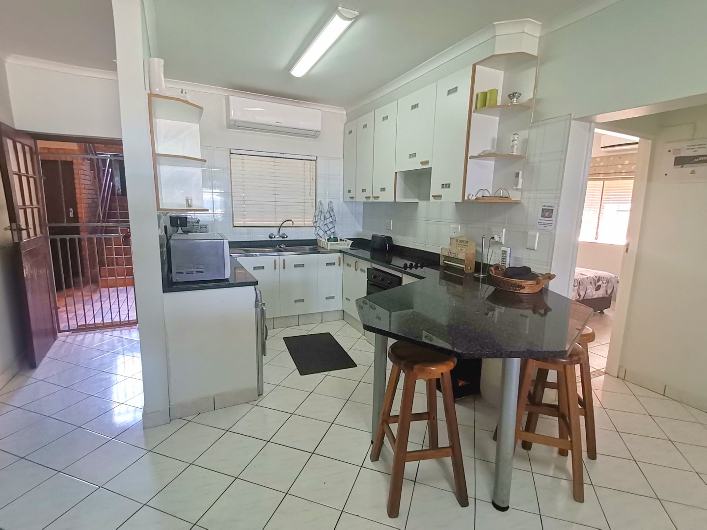 Take a walk through the property with me. When entering the complex the under cover parking is in front of the ground floor unit. Opening the security gate, the unit opens up to the gorgeous kitchen with granite tops and then the open plan lounge / dining room - flows out onto the under cover patio - overlooking the green grass of the communal garden and the blue ocean ... as far as your eye can see. The complex has direct access to the beach and that will keep the whole family busy. The main bedroom has sea view and it's own bathroom (shower) and the other two bedrooms are on the other side of the unit, with a family bathroom (bath). The complex is a short drive from the shopping centre in Hibberdene. All the rooms have air conditioning and the alarm system via Gladiator is a bonus.