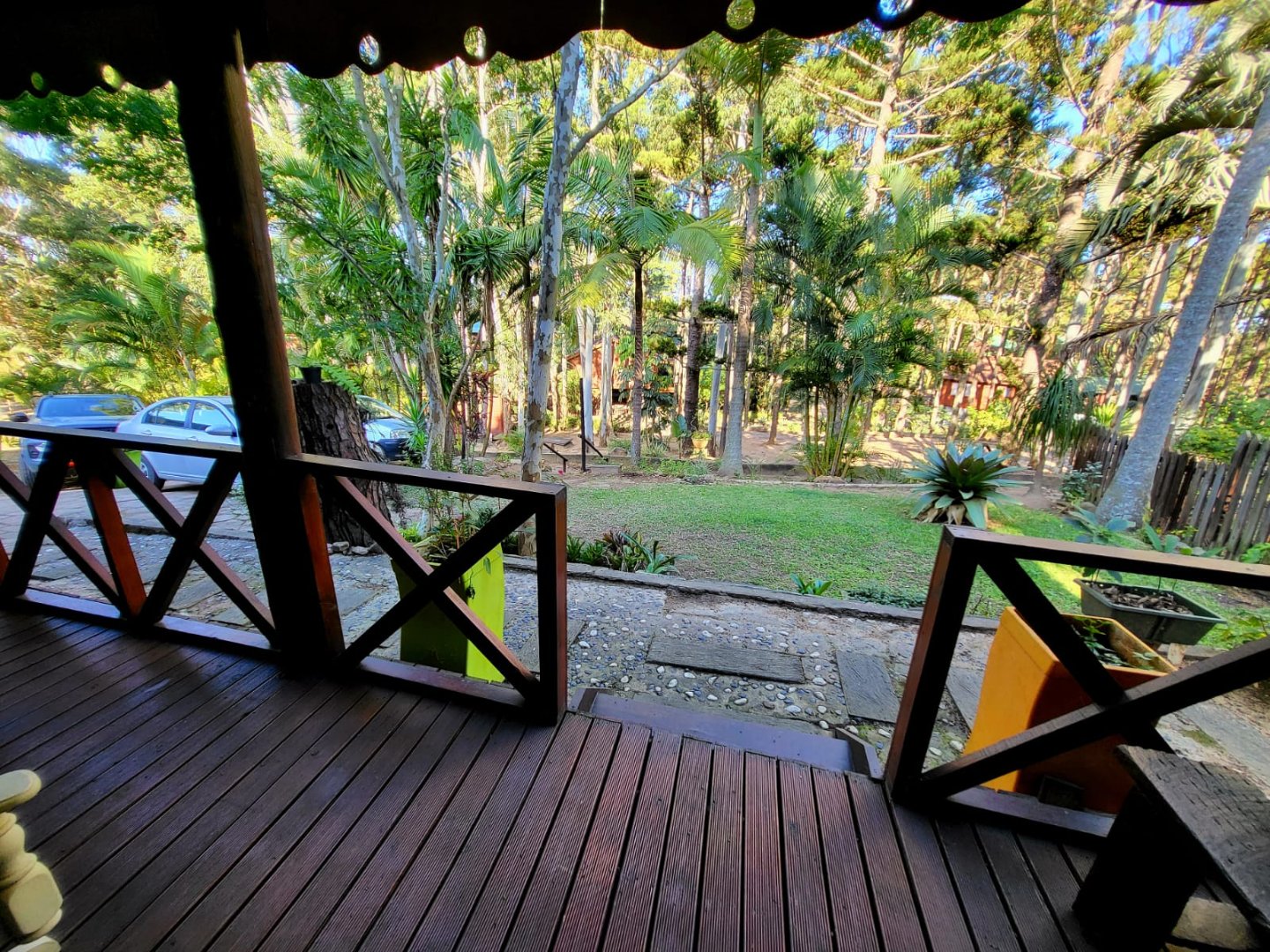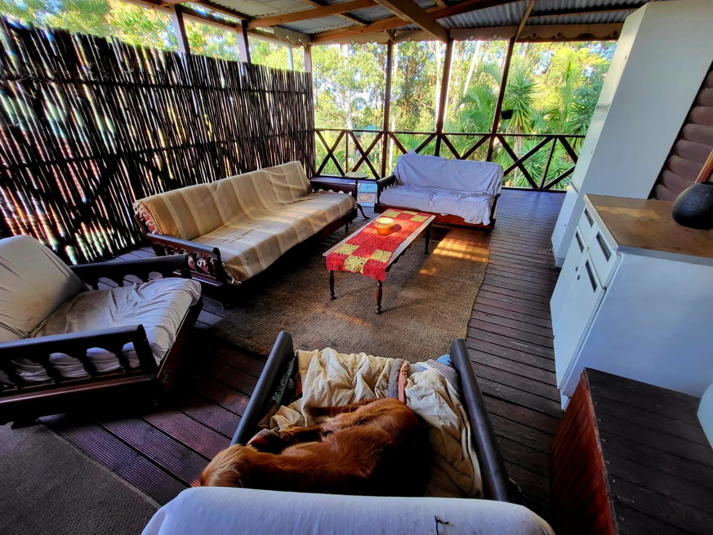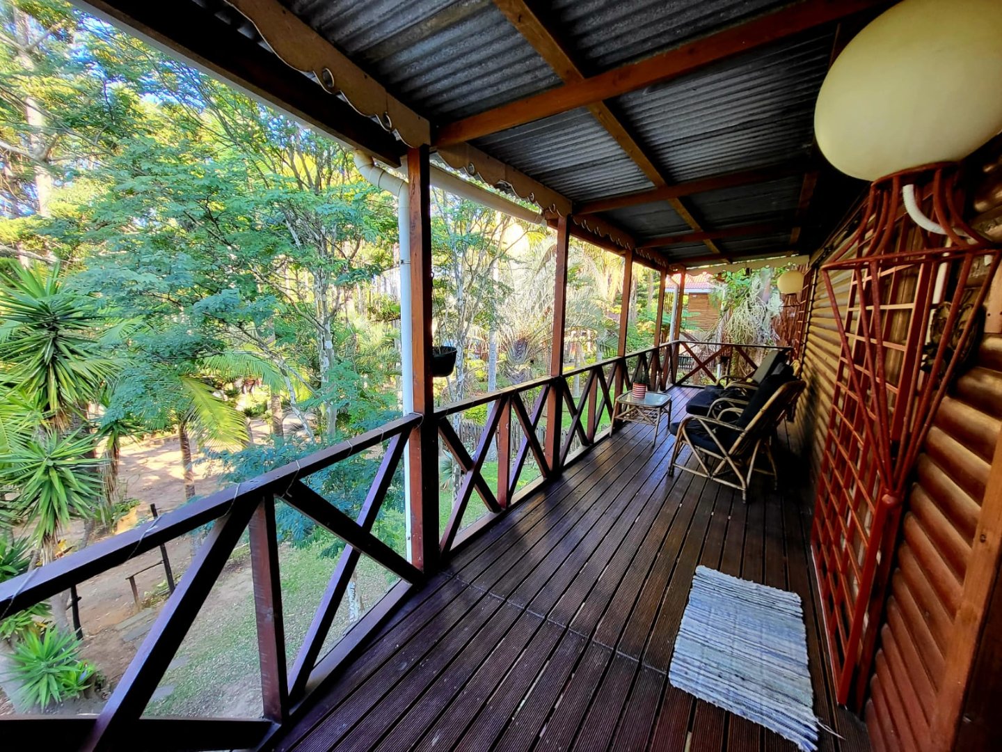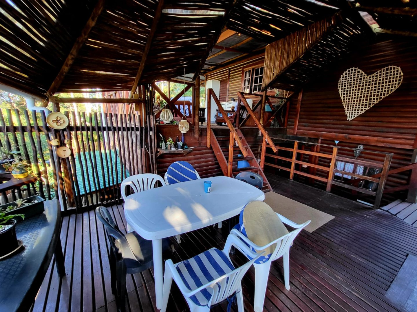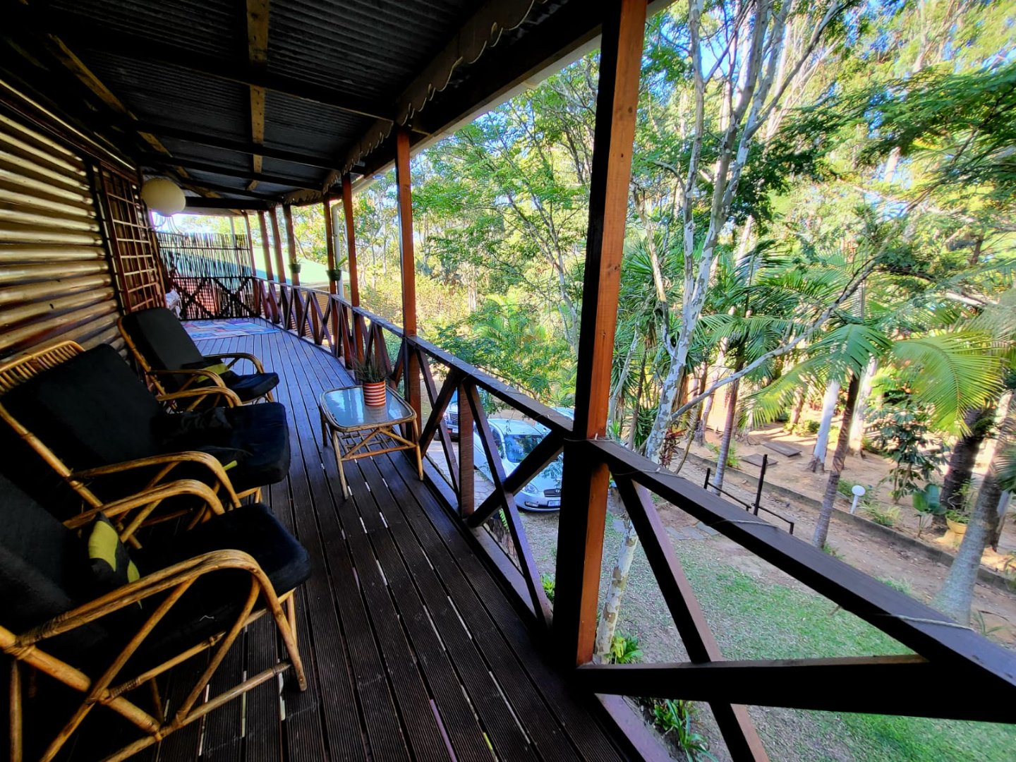 Consisting of a kitchen with laundry, built in cupboards and gas stove/oven, open plan to dining room & lounge with doors leading to a covered patio with beautiful established garden and forest surroundings. Take the wooden stairs up to the 3 bedrooms, 2 bedrooms open to a covered balcony with beautiful views. There are 2 bathrooms, 1 being en-suite.