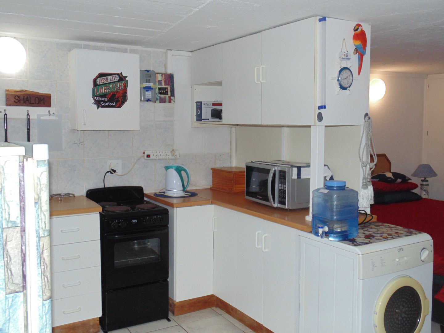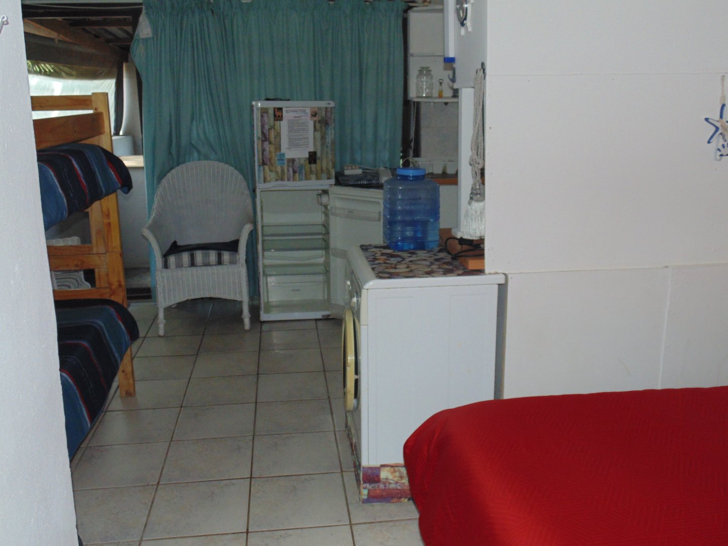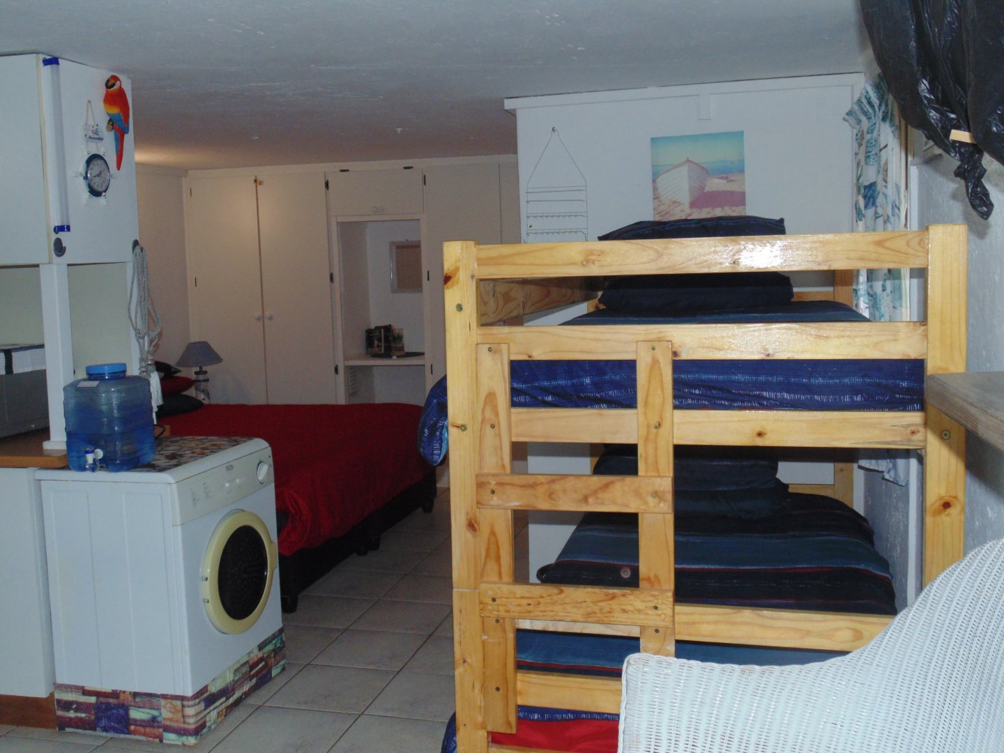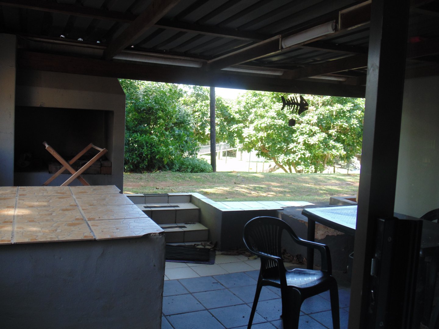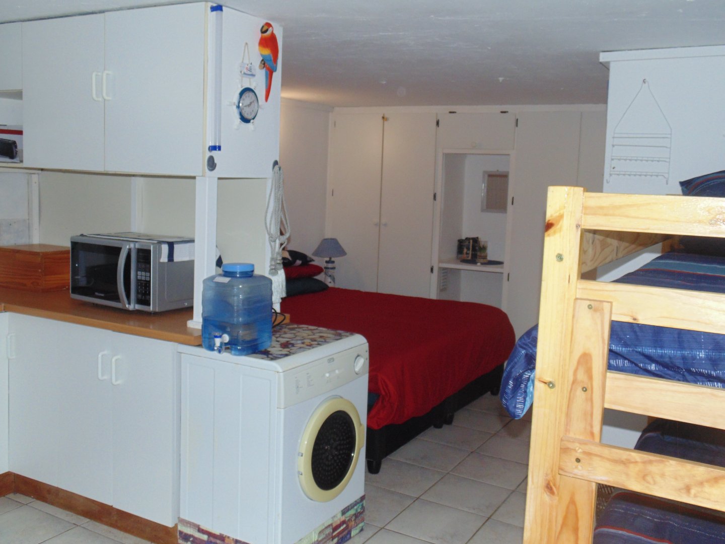 Entertaining area with a Braai neatly tiled. Kitchen with Build in cupboard, bedroom, Queen size Bed, Bathroom with Build in Cupboards and double banker beds. Enough space to move around in the unit. Bathroom with Shower, Toilet and Basin.