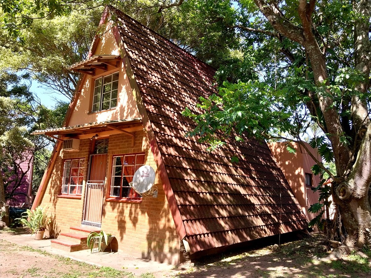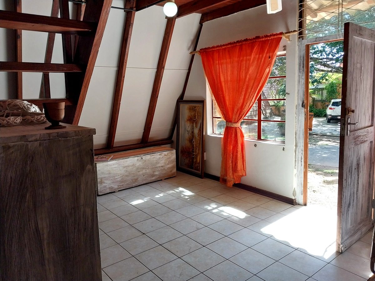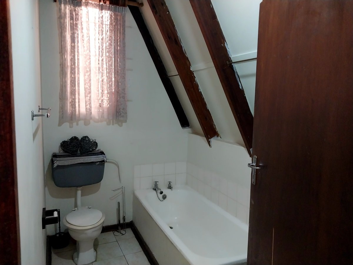 This A-Frame unit is situated in well maintained security complex. With a little TLC you could change this unit into a dream of your choice. There is one bedroom downstairs, Lounge, Bathroom with Bath, toilet and basin before you enter the kitchen. Large kitchen where you have enough space for a table and chairs with a backdoor that lead to the outside area of the unit. 2nd Bathroom with Shower, Toilet and Basin next to the kitchen. 2 Bedrooms upstairs with the deck by the main bedroom. Parking next to the unit with the Communal Swimming pool next to this unit. Very quiet area. The complex got Electric Fence, Security and garden services. Access to the premises with a remote.
