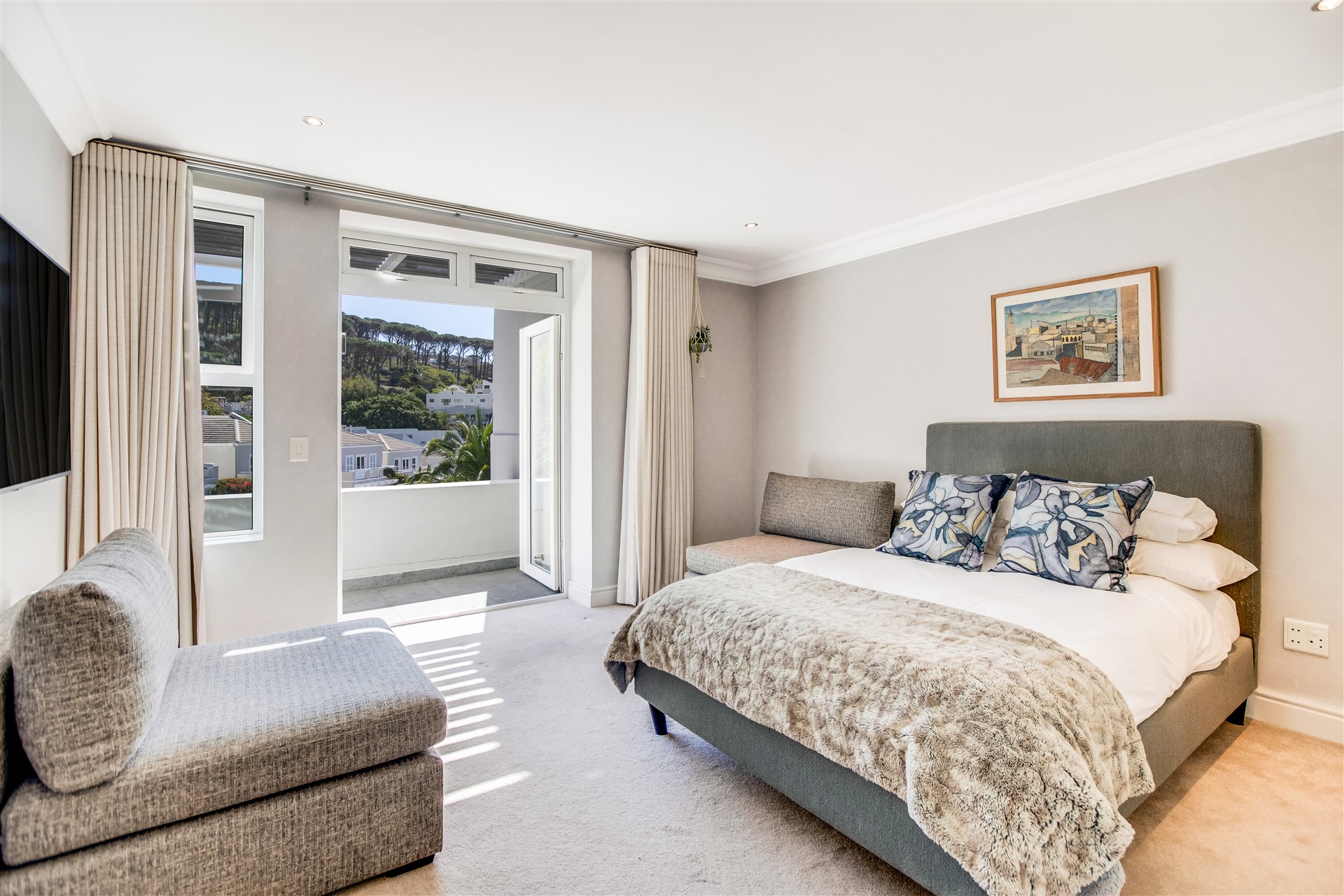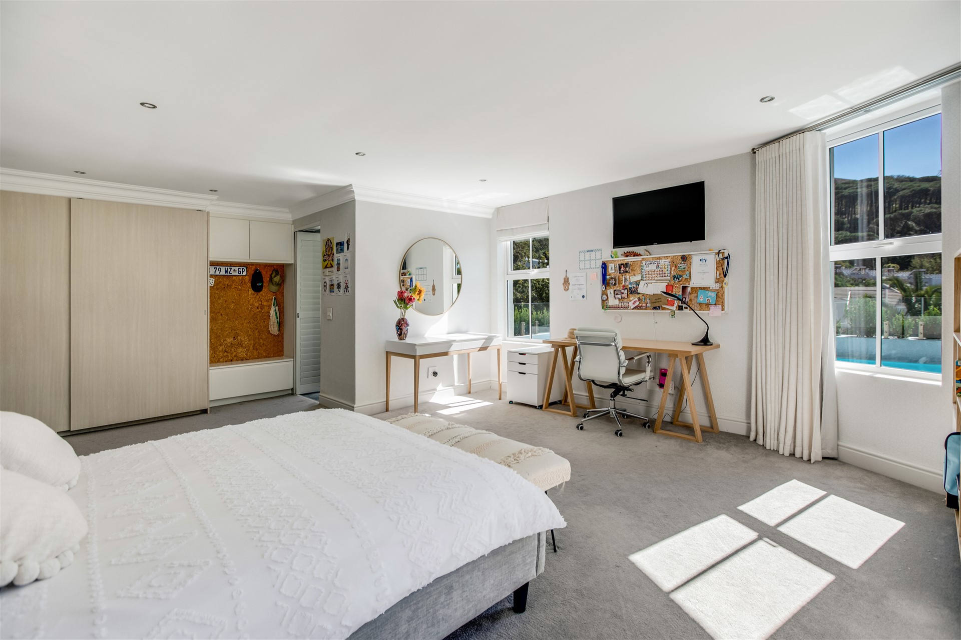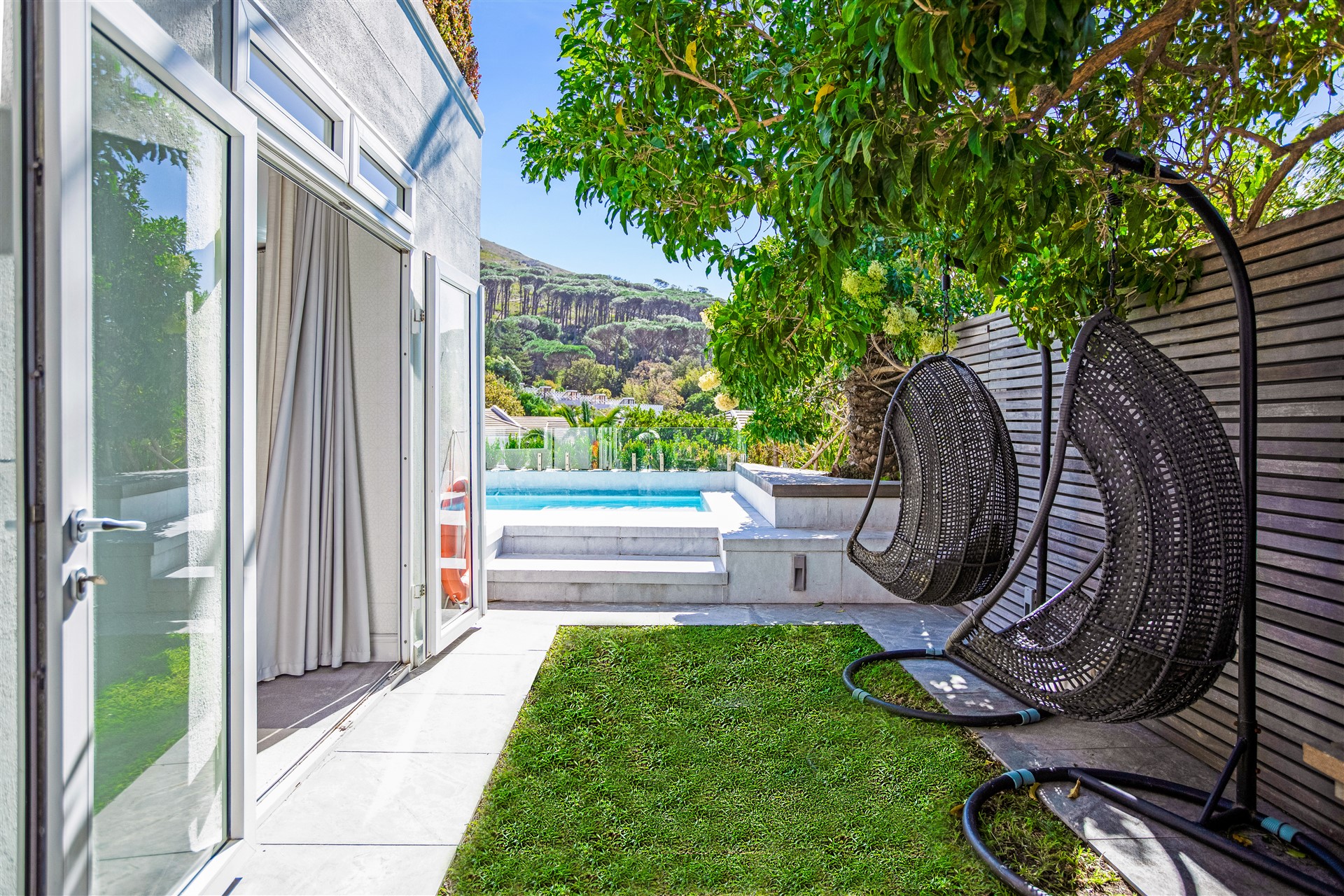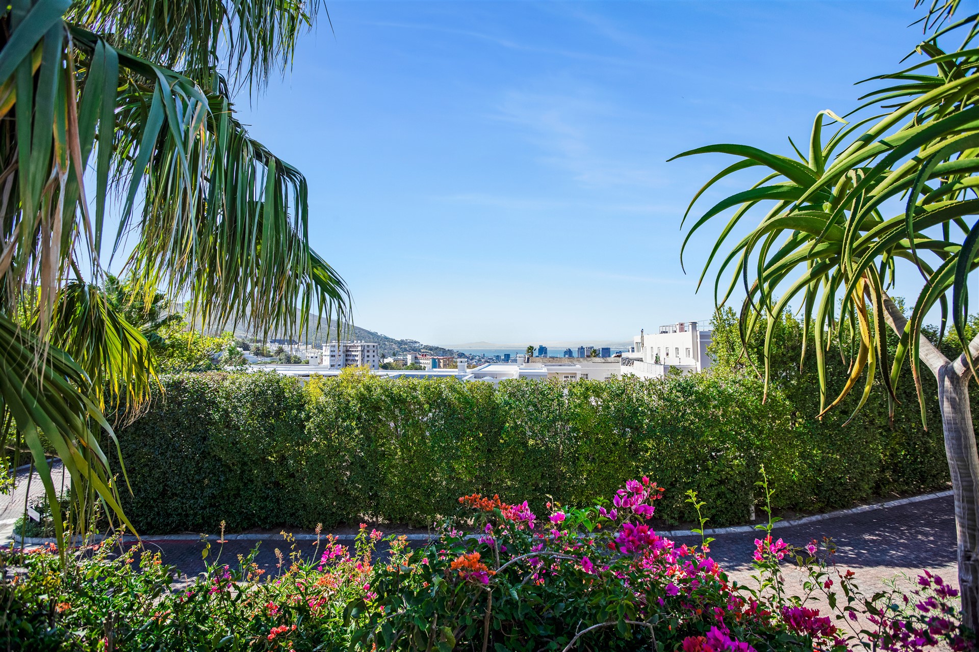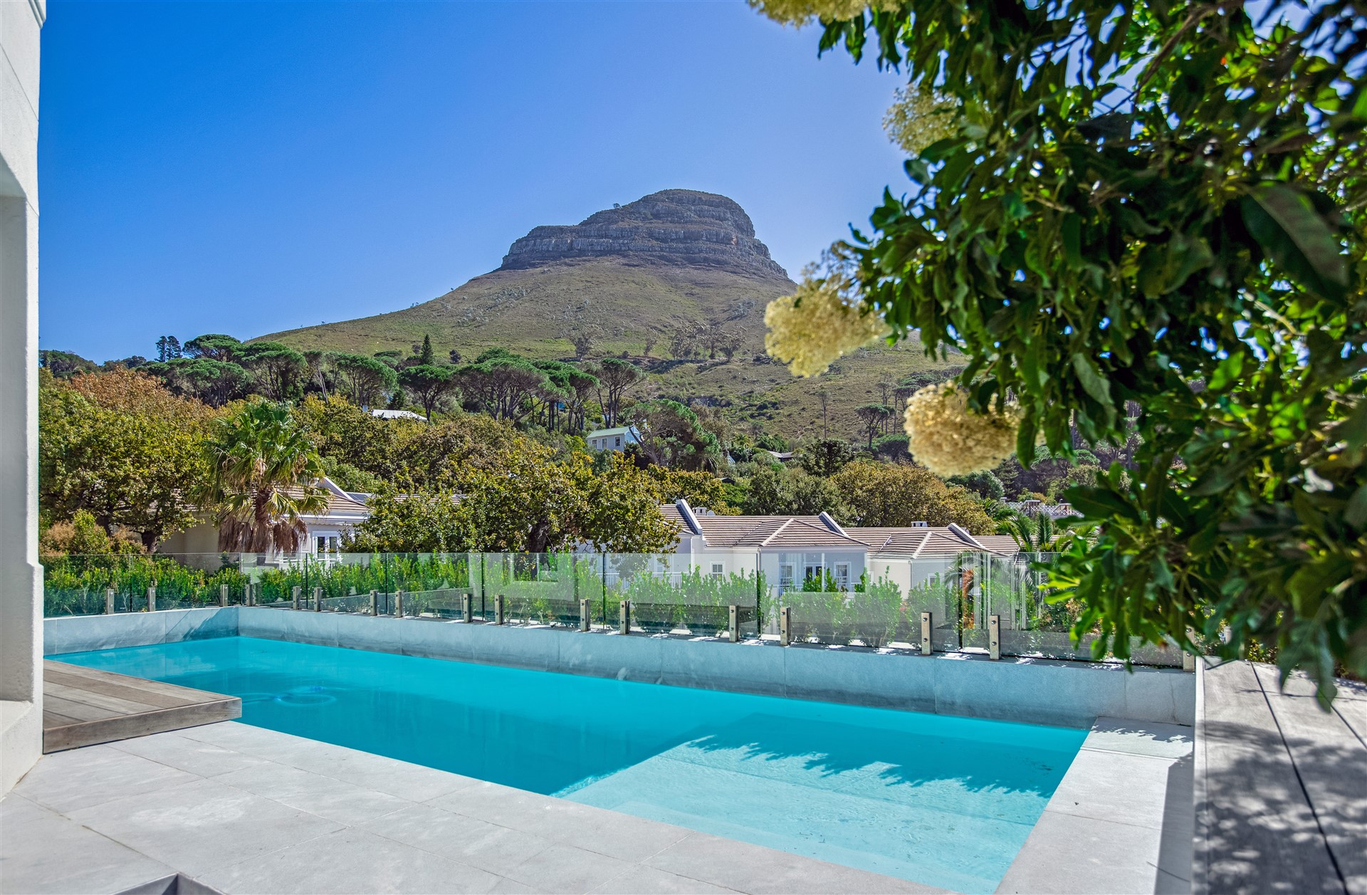 Indulge your senses in this beautiful “India Hicks” island-style home with a classic twist, offering a unique lifestyle in the prestigious St. Johns Estate. Comfortable and super secure, with a direct access double garage to the entrance hall and an elevator for shopping made easy. A wide winding staircase takes you to the children’s wing, where you are welcomed to an open-plan work station cum play room with lots of desk space for the kids to hang out. Three extra-large bedroom suites, each with plenty of built-in cupboards and spacious bathrooms, lead out onto the pretty tree-lined garden and kids entertainment outdoor space at the pool with beautiful views onto Lions Head and Signal Hill.