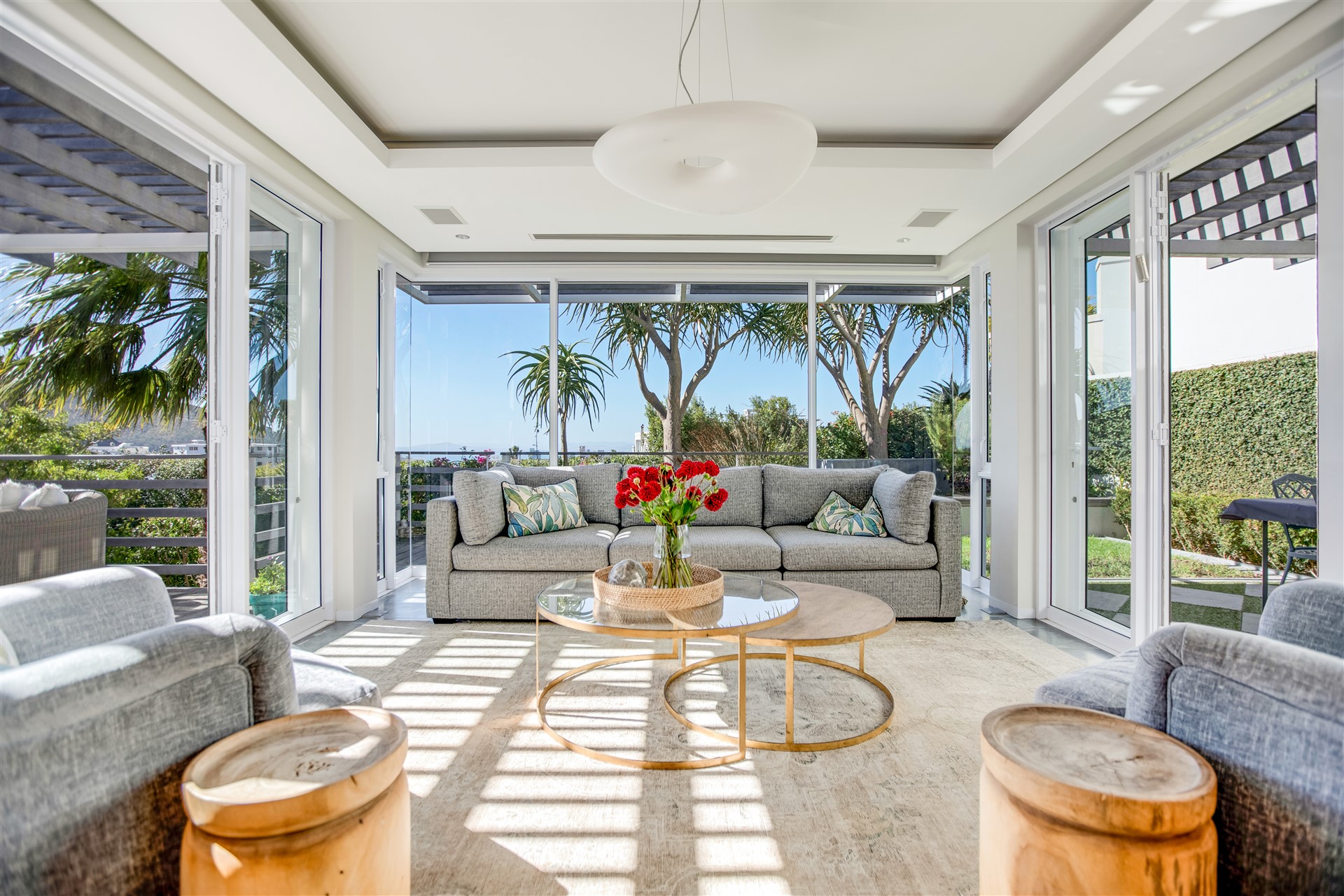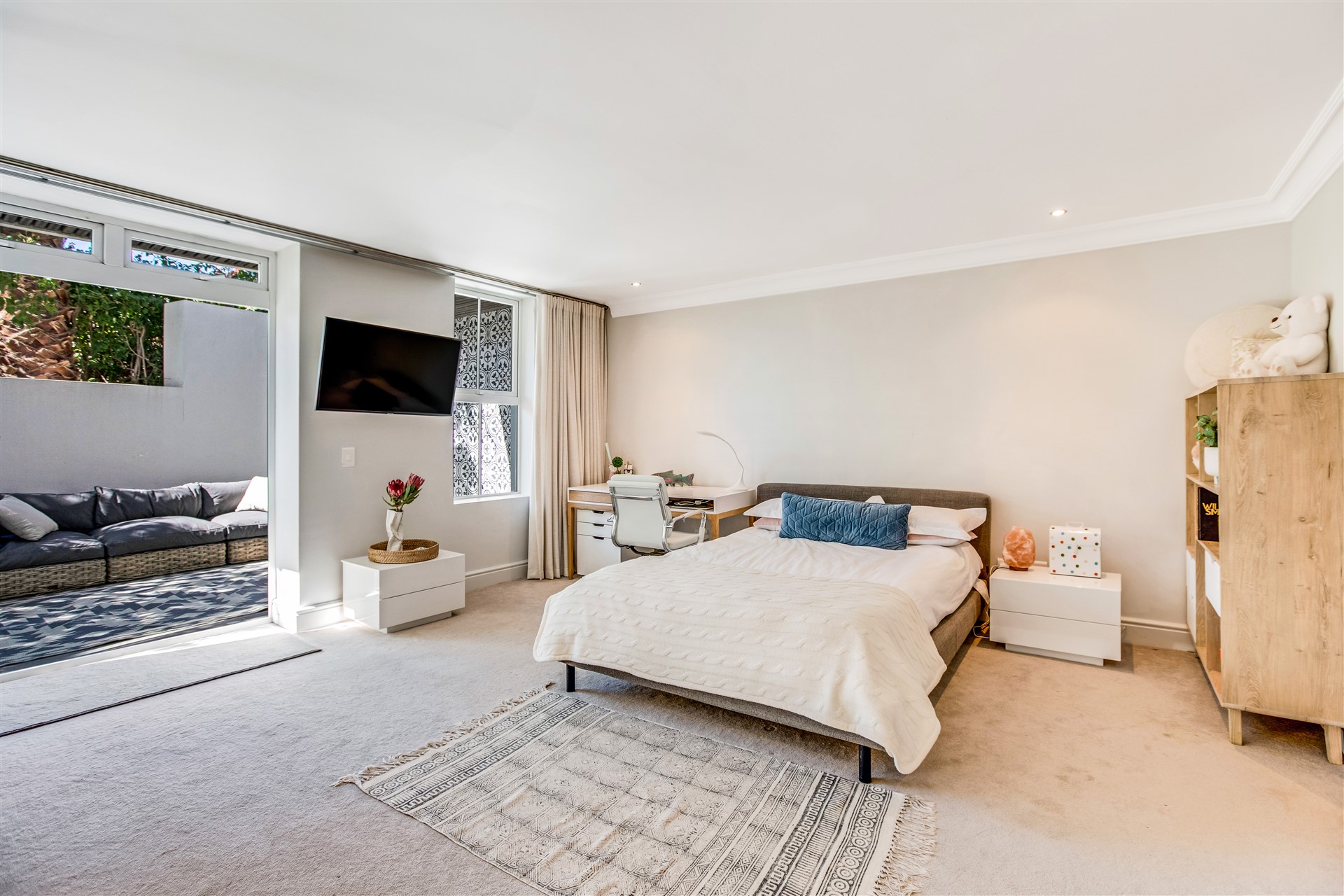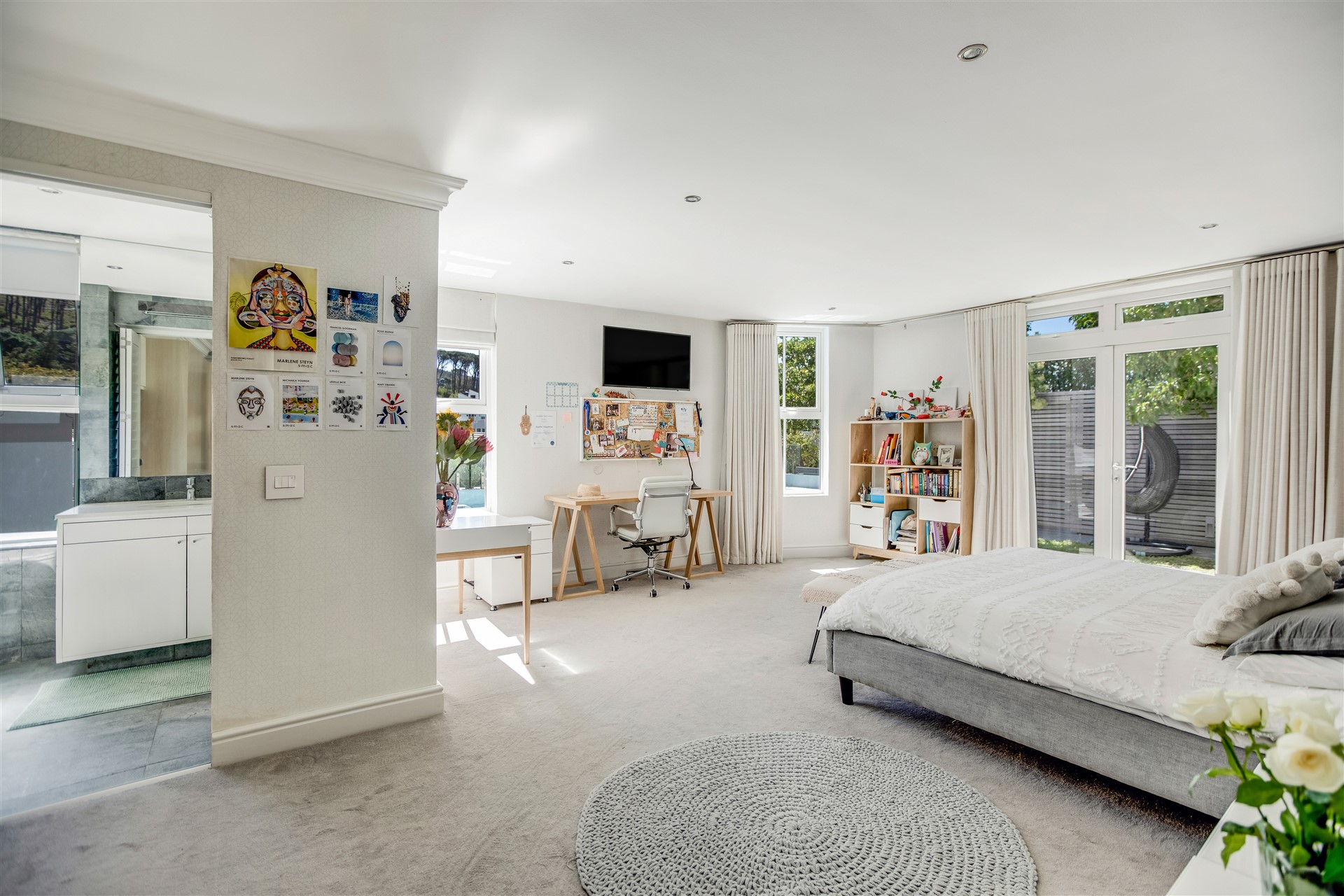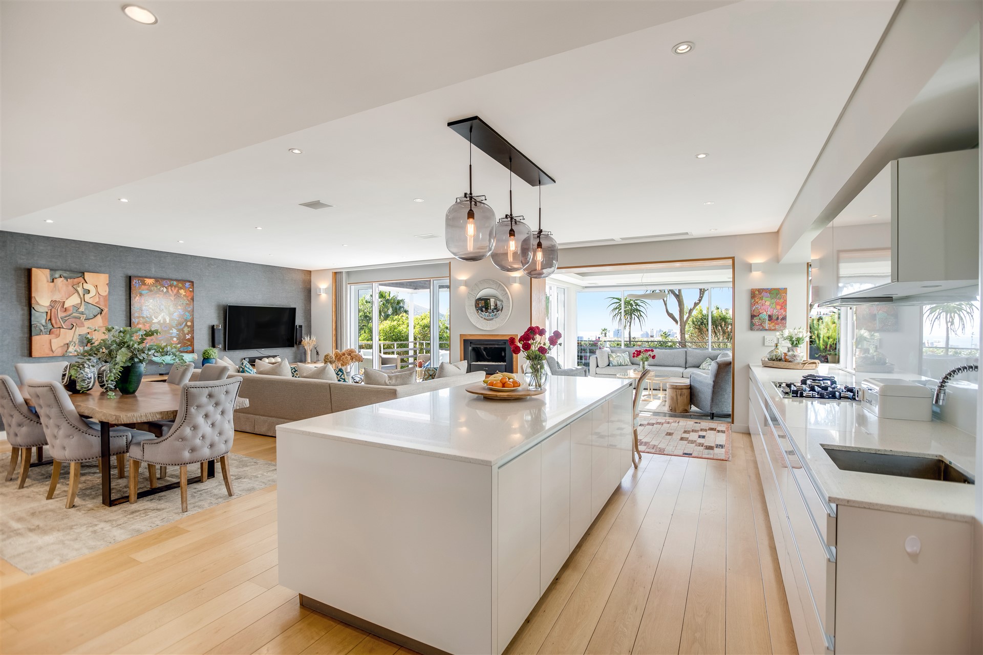 Indulge your senses in this beautiful “India Hicks” island-style home with a classic twist, offering a unique lifestyle in the prestigious St. Johns Estate. Comfortable and super secure, with a direct access double garage to the entrance hall and an elevator for shopping made easy. A wide winding staircase takes you to the children’s wing, where you are welcomed to an open-plan work station cum play room with lots of desk space for the kids to hang out. Three extra-large bedroom suites, each with plenty of built-in cupboards and spacious bathrooms, lead out onto the pretty tree-lined garden and kids entertainment outdoor space at the pool with beautiful views onto Lions Head and Signal Hill.