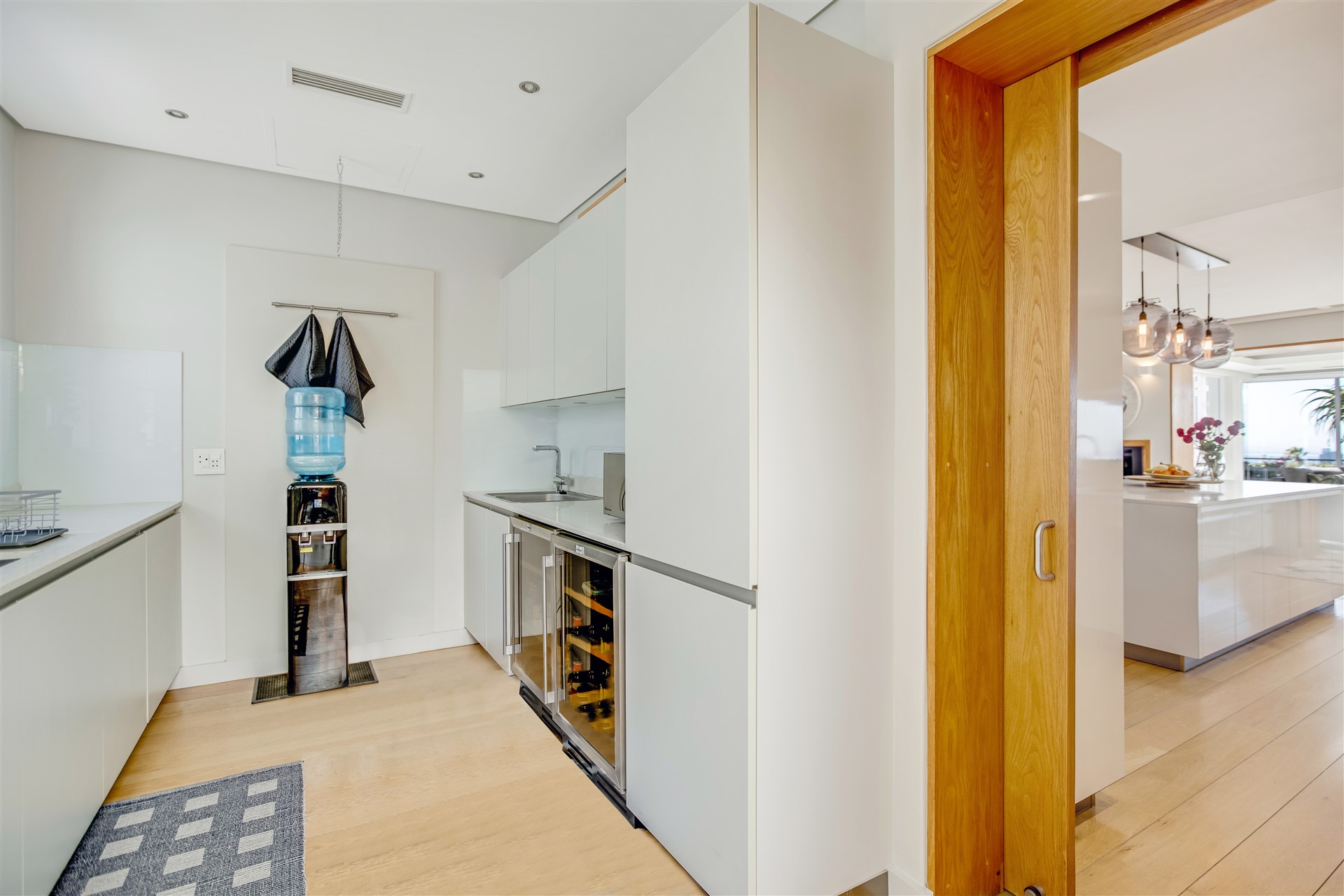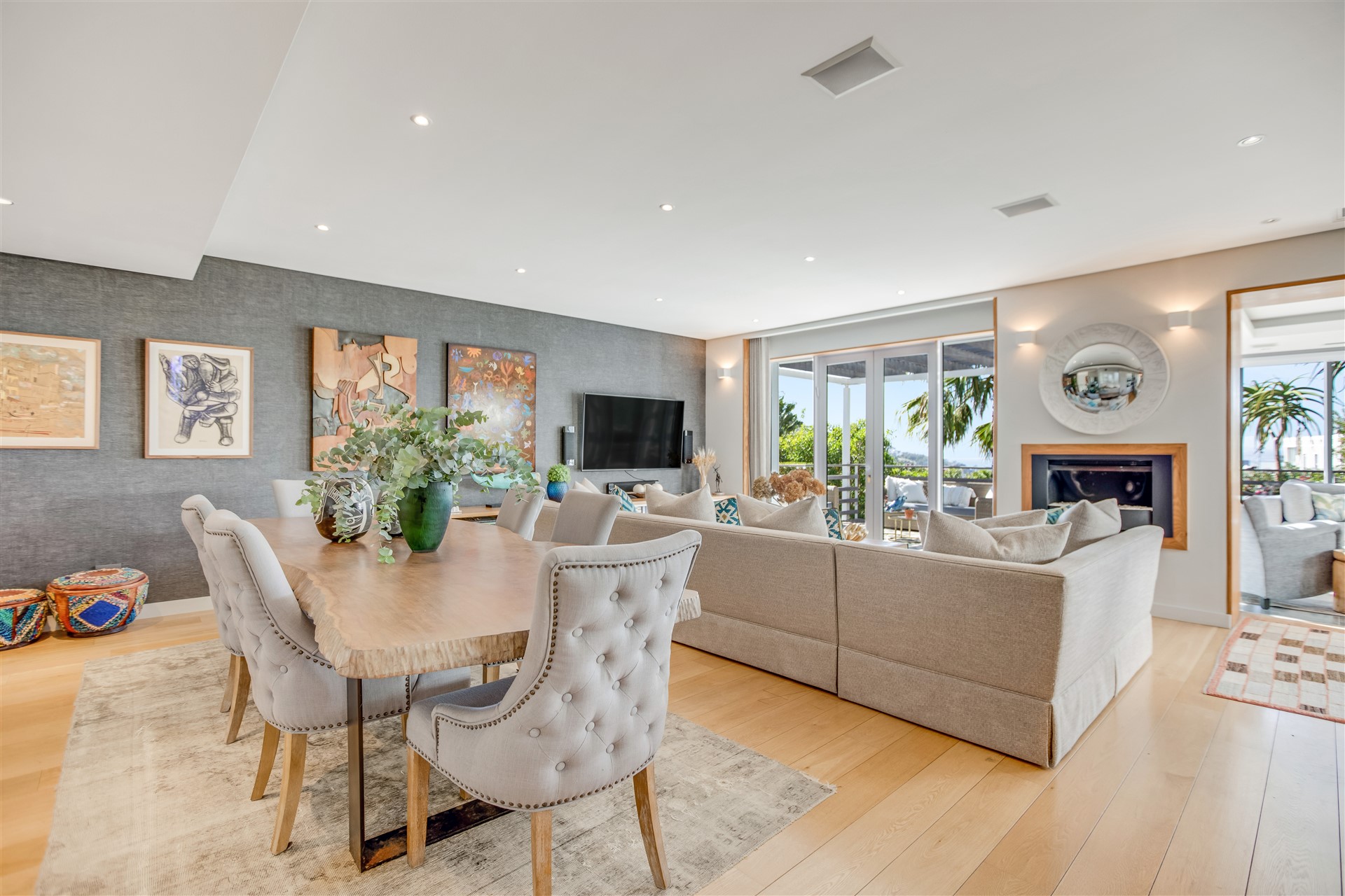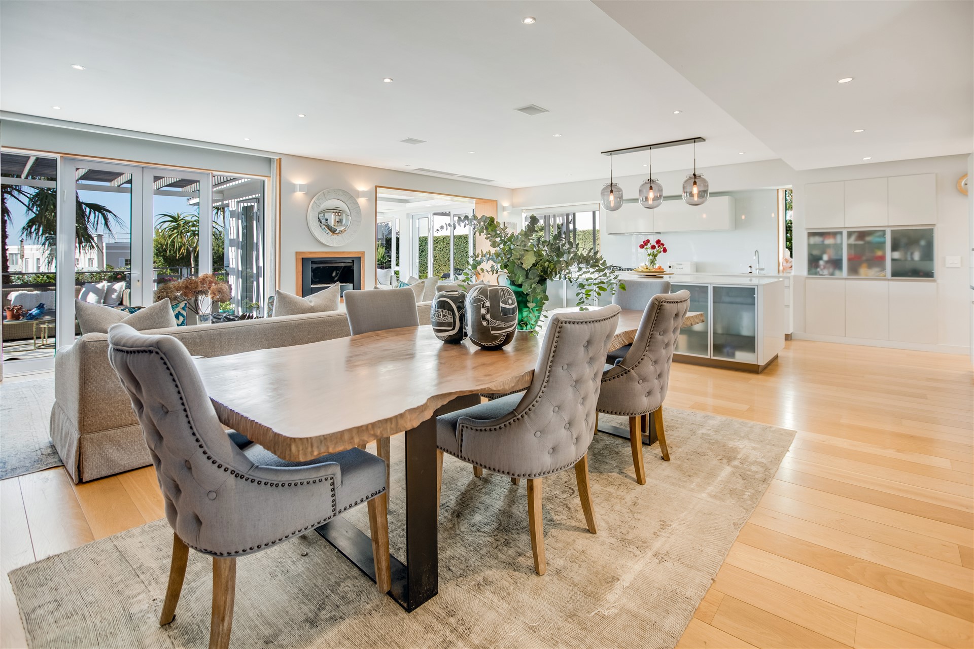 The top floor is laid-back luxury defined with a wealth of open-plan living and entertaining spaces spread out from the top of the stairs and lift to the large dining and lounge area with a gas infinity fireplace and a modern master chef open-plan kitchen all in white with Miele appliances, a separate scullery, a delightful sun room, and two outside entertainment areas to accommodate all weather conditions, all surrounded by a lush green garden.