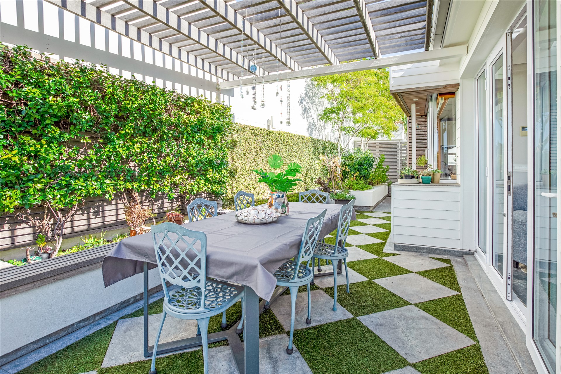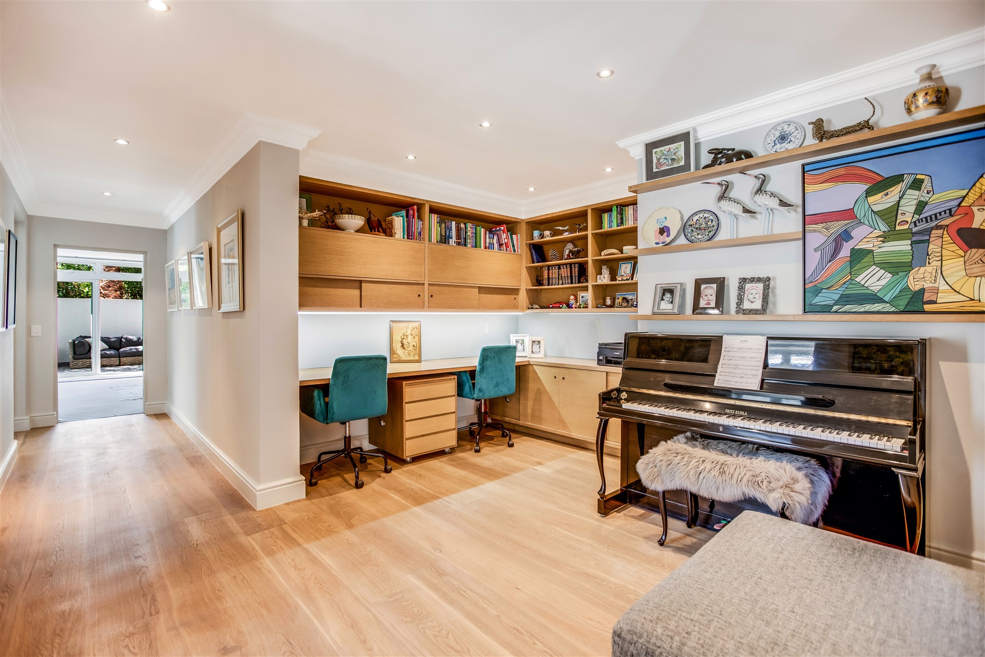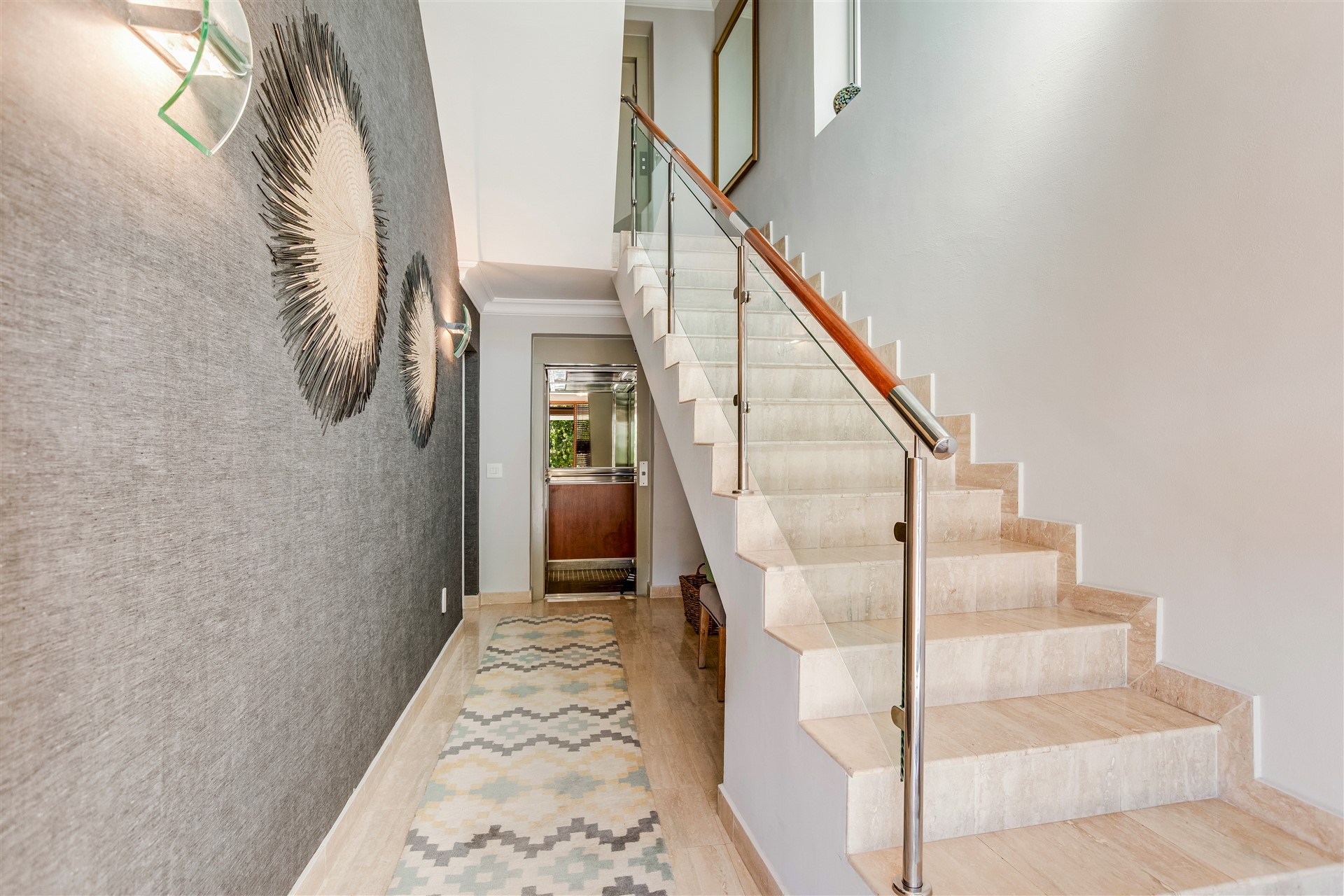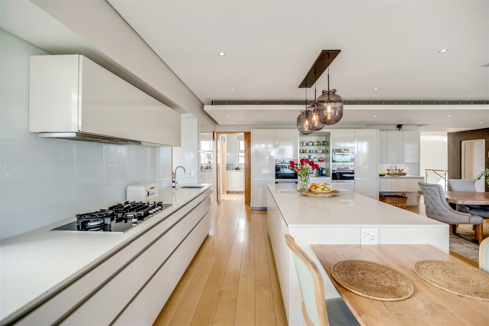 The top floor is laid-back luxury defined with a wealth of open-plan living and entertaining spaces spread out from the top of the stairs and lift to the large dining and lounge area with a gas infinity fireplace and a modern master chef open-plan kitchen all in white with Miele appliances, a separate scullery, a delightful sun room, and two outside entertainment areas to accommodate all weather conditions, all surrounded by a lush green garden.