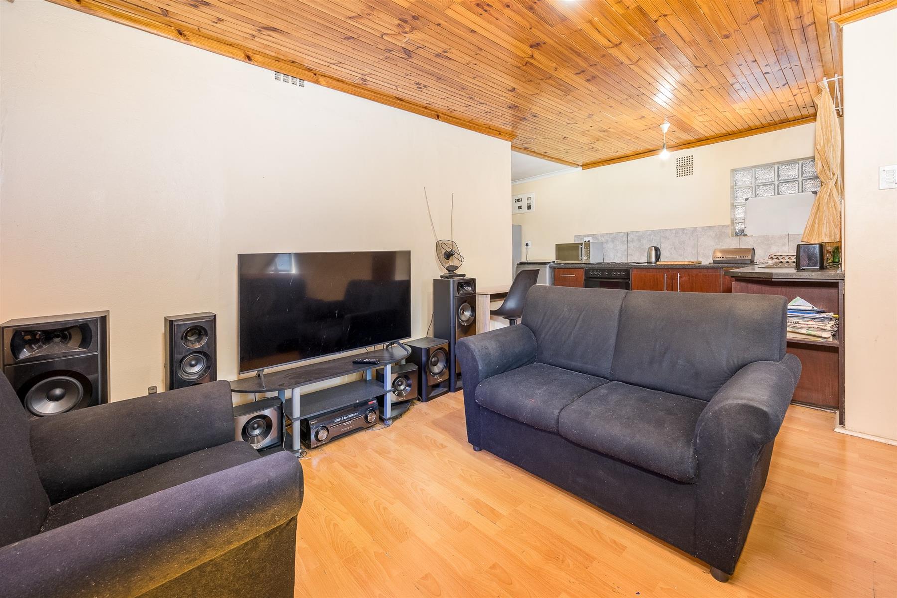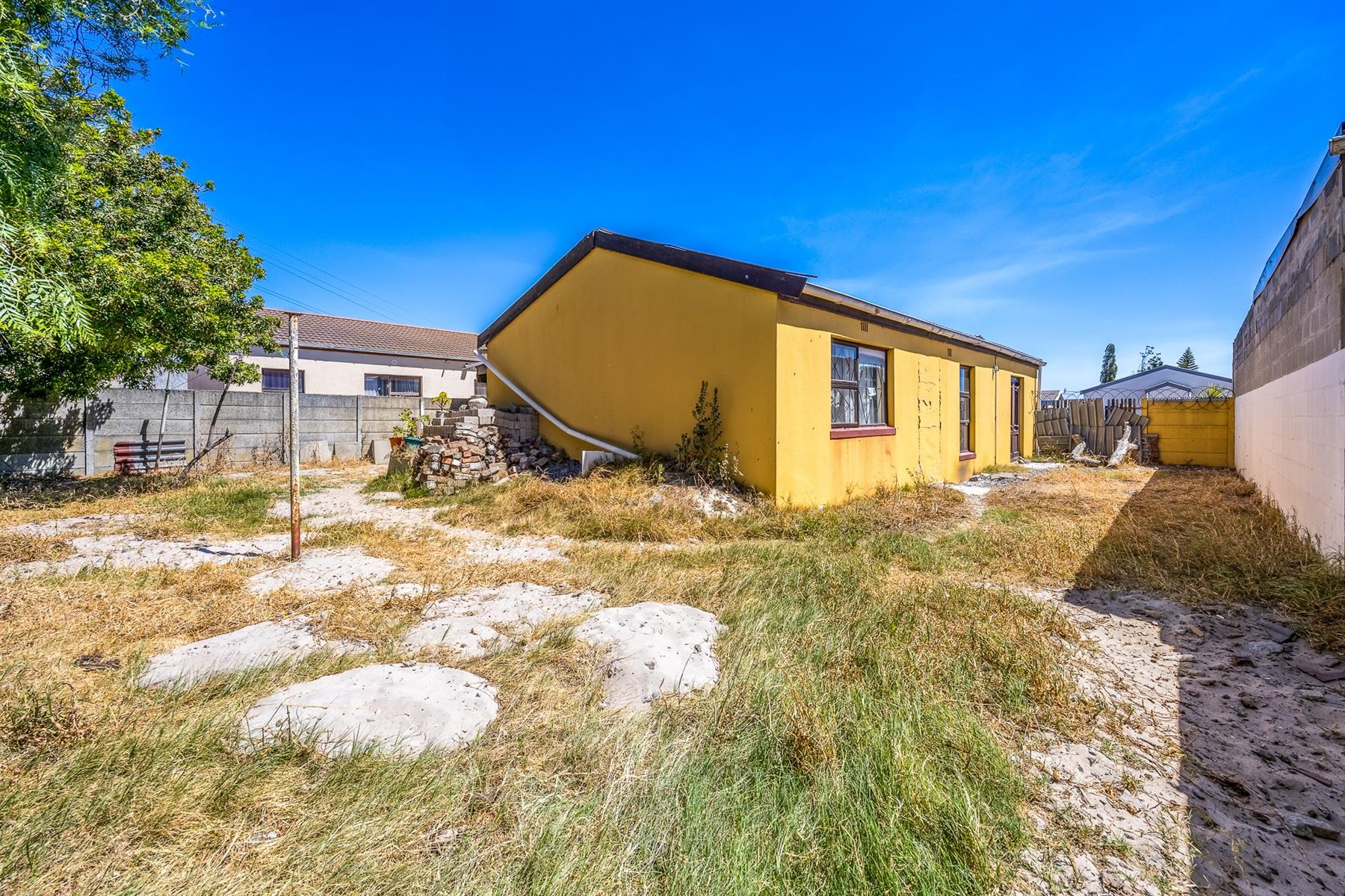 On entering the front door, you`ll find the lounge (knottypine ceiling) with double doors to the back yard. Next you have the open-plan kitchen, with built-in stove, under-counter oven and water point for the washing machine. The backdoor leads to the carport (manual garage doors) and backyard. Next you have the passage that leads to the 3 bedrooms and family bathroom. Two of the 3 bedrooms have built-in cupboards and ceiling fans. The bathroom consists of a bath, handbasin and toilet. This house is ready to be a home for the next family.