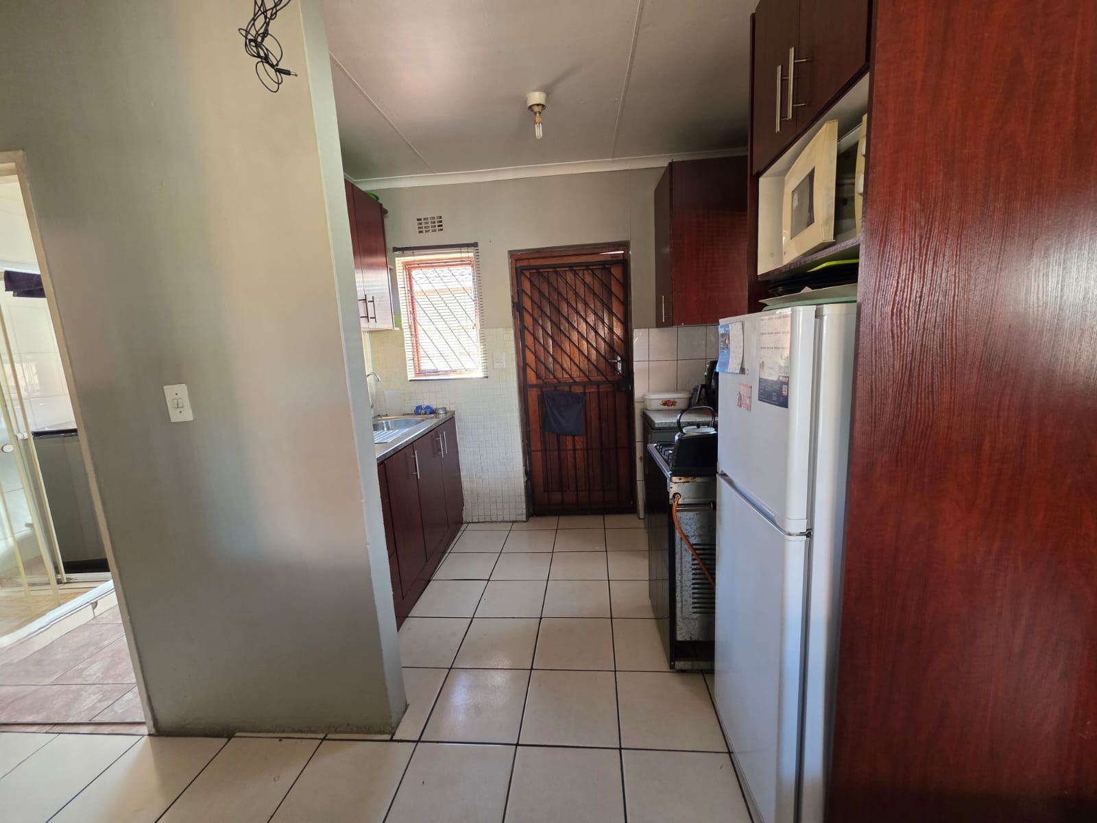 Inside, the open‐plan kitchen and lounge create a warm, family friendly living space, while a sliding door leads out to the covered braai area, making it ideal for relaxed weekends and entertaining. The three tiled bedrooms are airy, and the family bathroom is neat and modern.