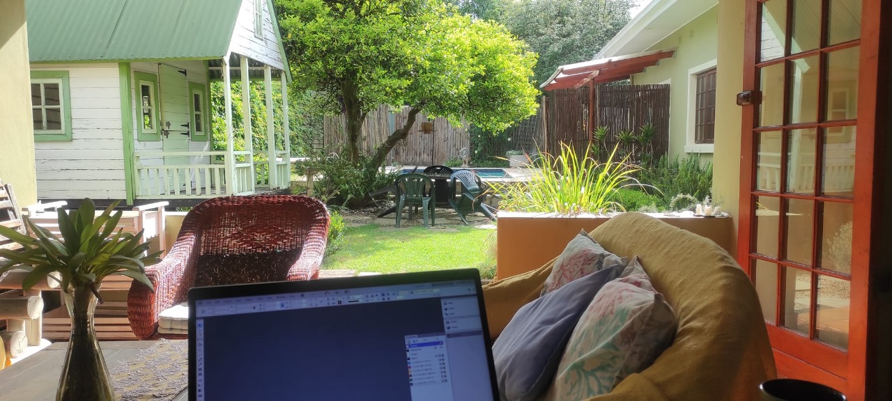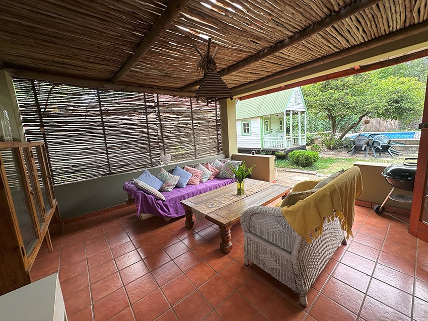 Large outdoor entertainment areas: Front porch + Back veranda (pool side). Tended garden. Swimming pool.