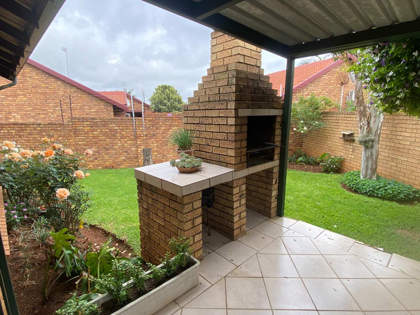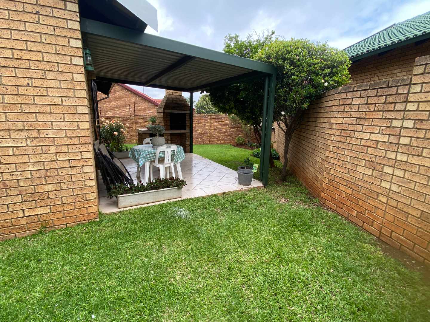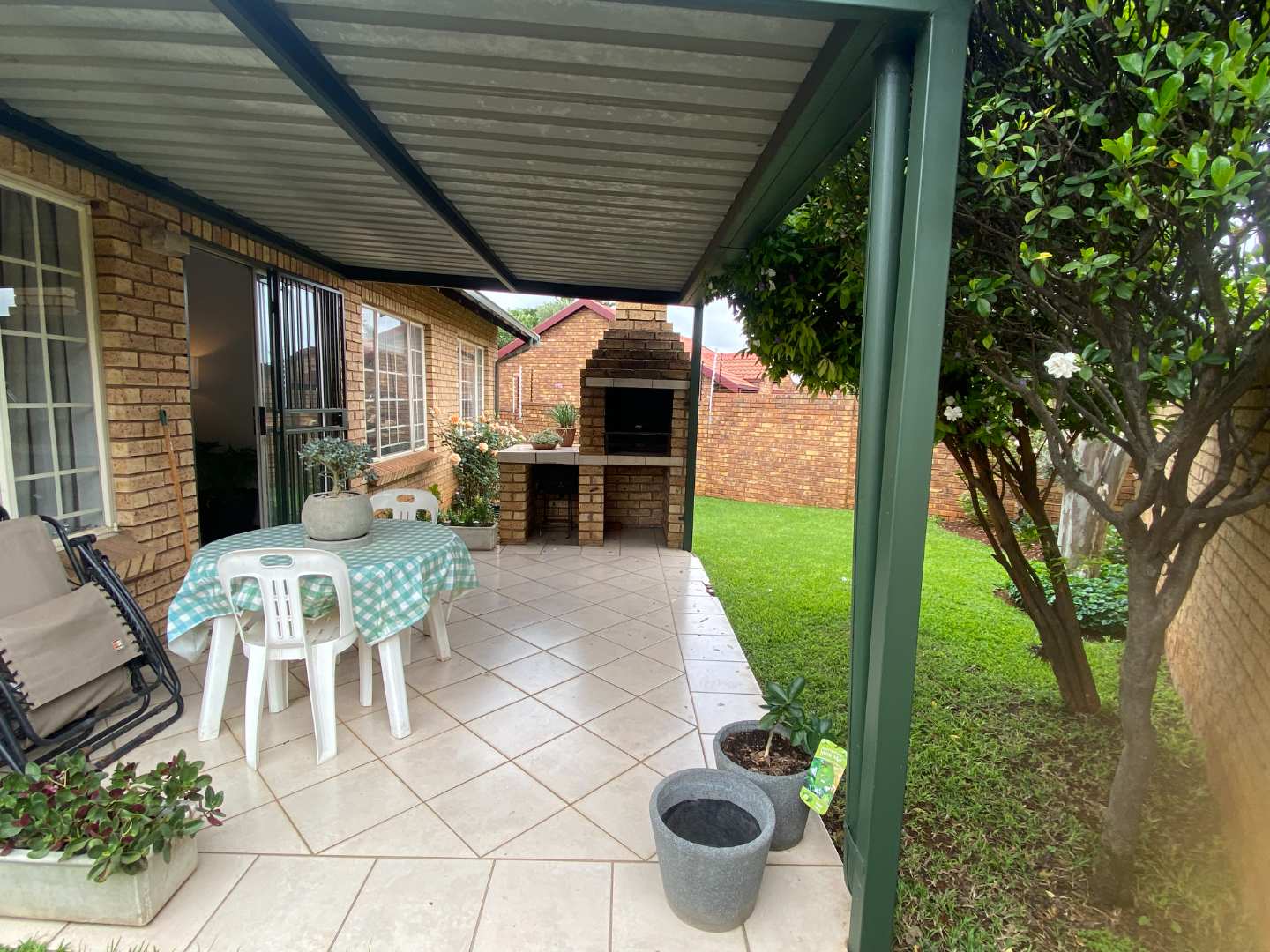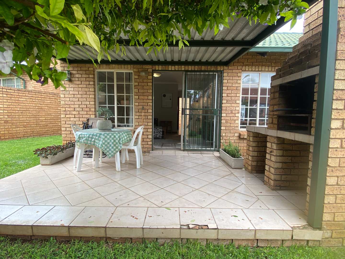 Featuring two carpeted bedrooms and a full bathroom with both a bath and a shower, the home is designed for comfortable, practical living. The living and dining areas flow seamlessly onto a large covered patio fitted with a built-in braai, making it the perfect setting for effortless entertaining.