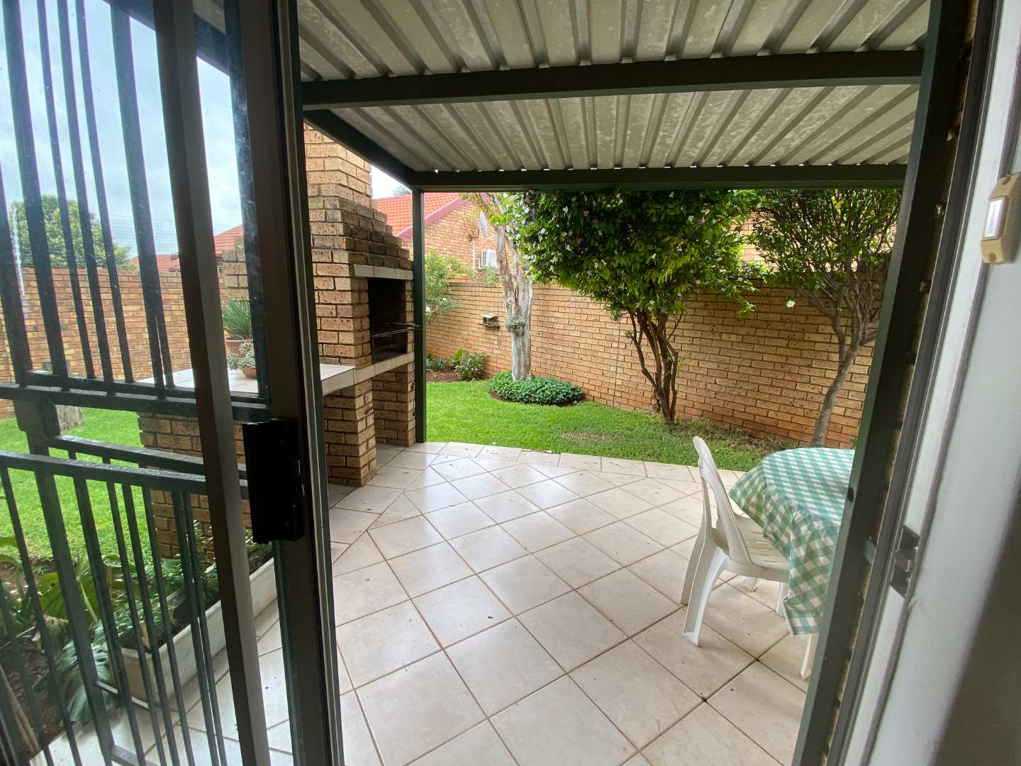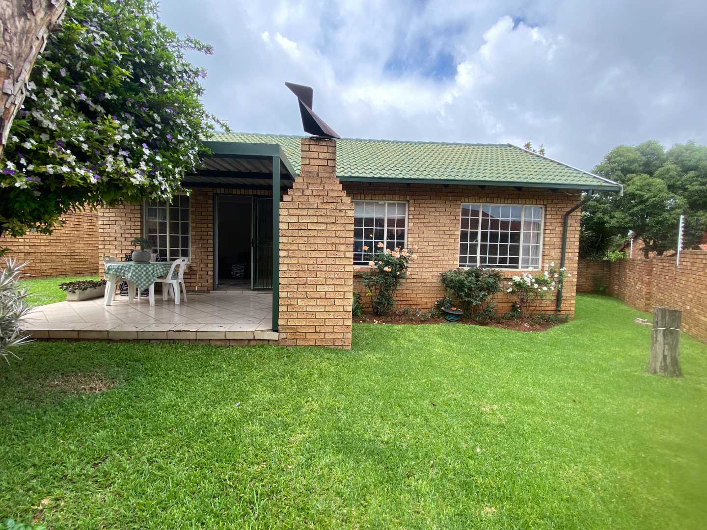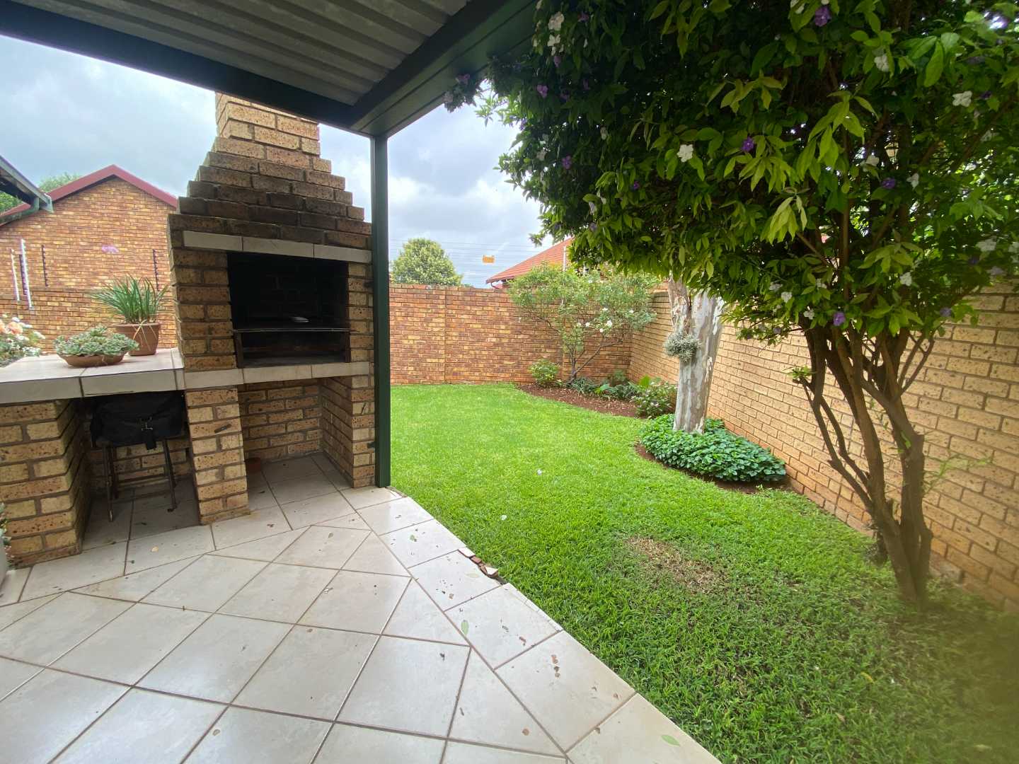 Featuring two carpeted bedrooms and a full bathroom with both a bath and a shower, the home is designed for comfortable, practical living. The living and dining areas flow seamlessly onto a large covered patio fitted with a built-in braai, making it the perfect setting for effortless entertaining.