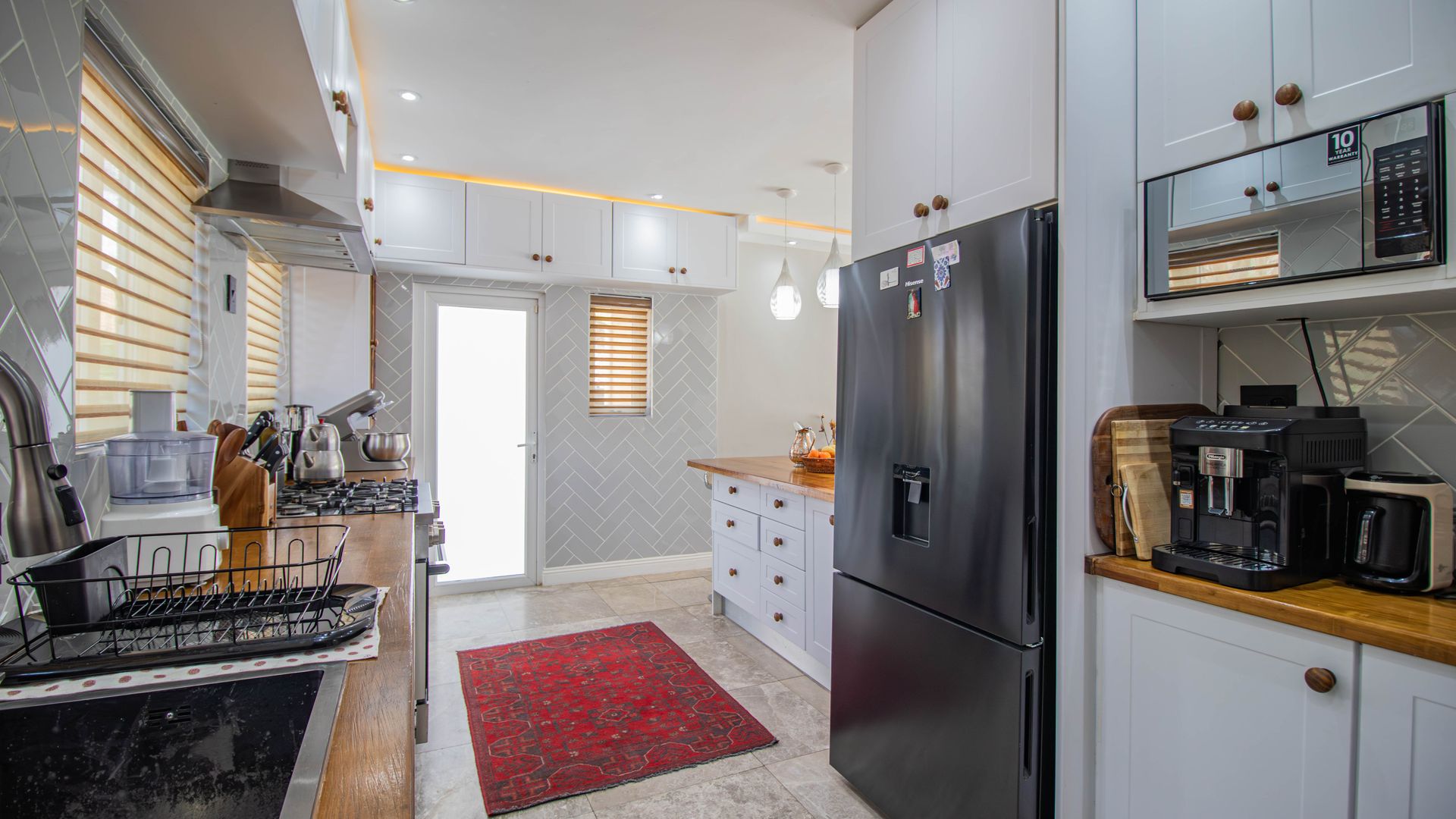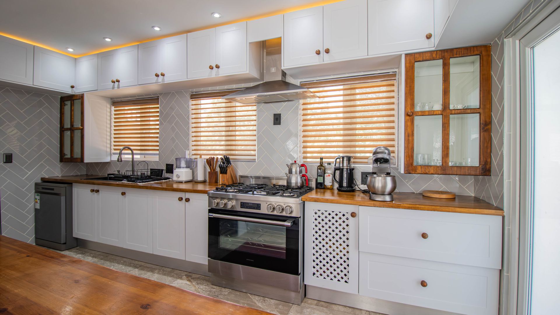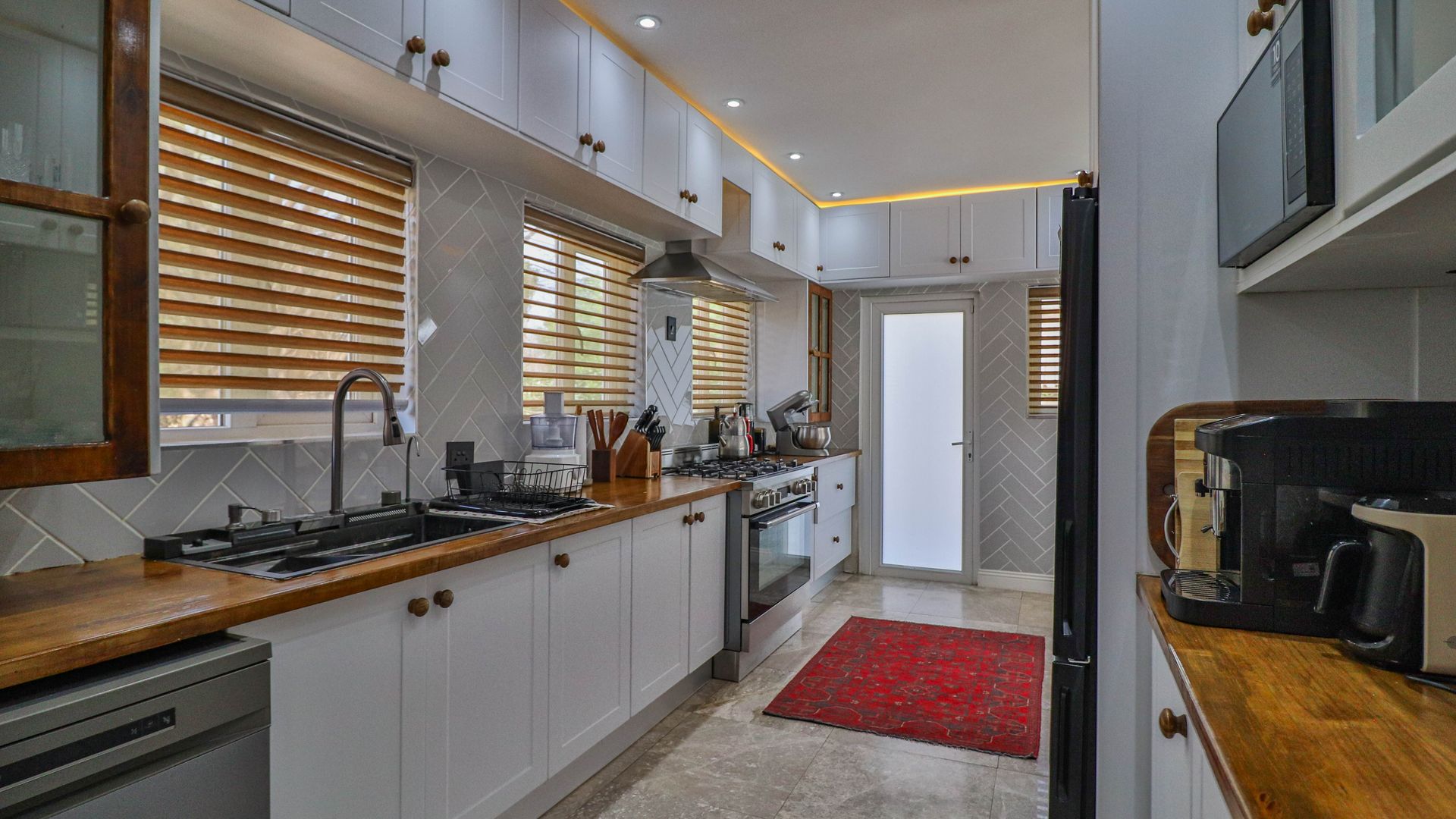 Modern Kitchen: Ample cupboard space, water filtration system, and LED lighting with dimmers.