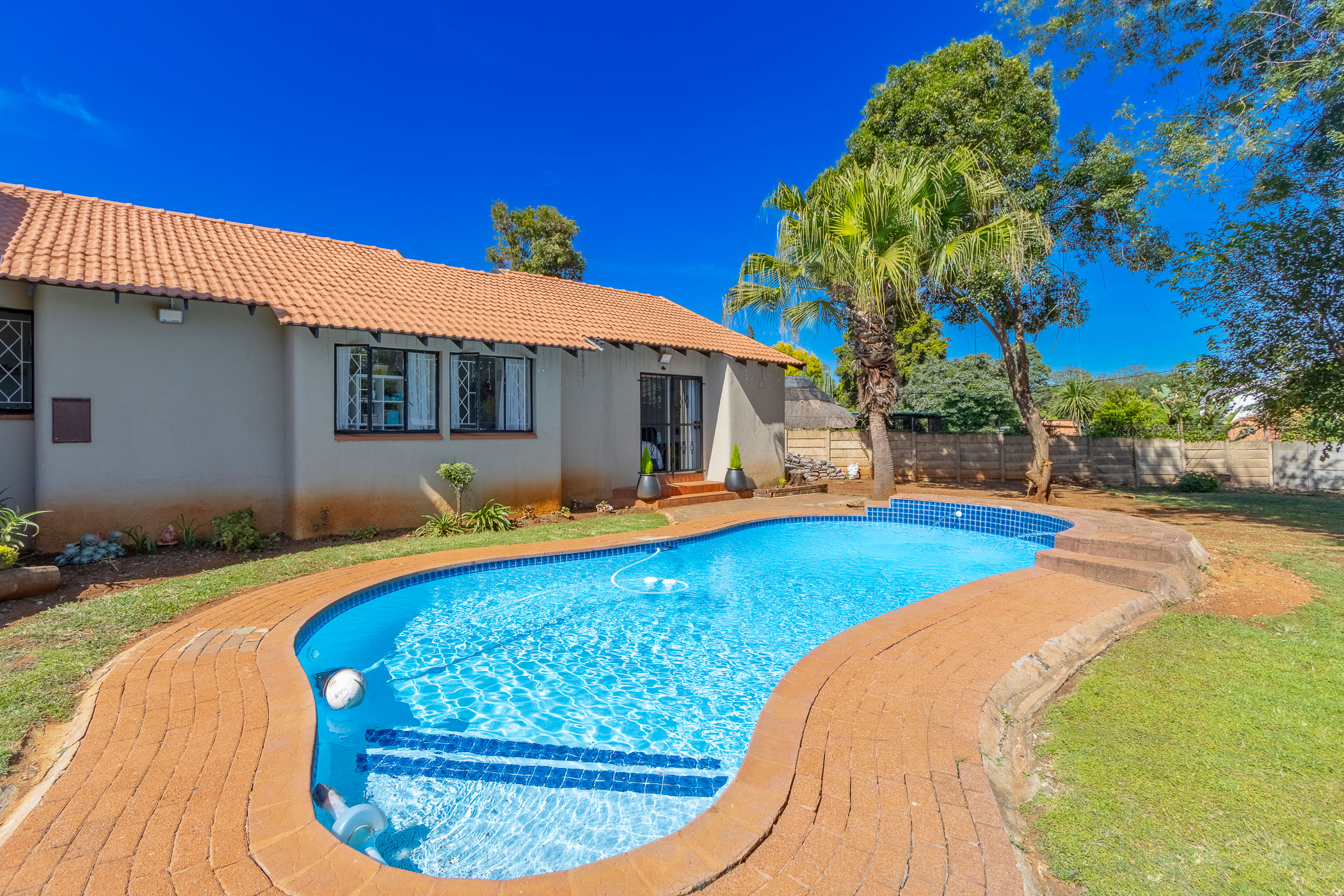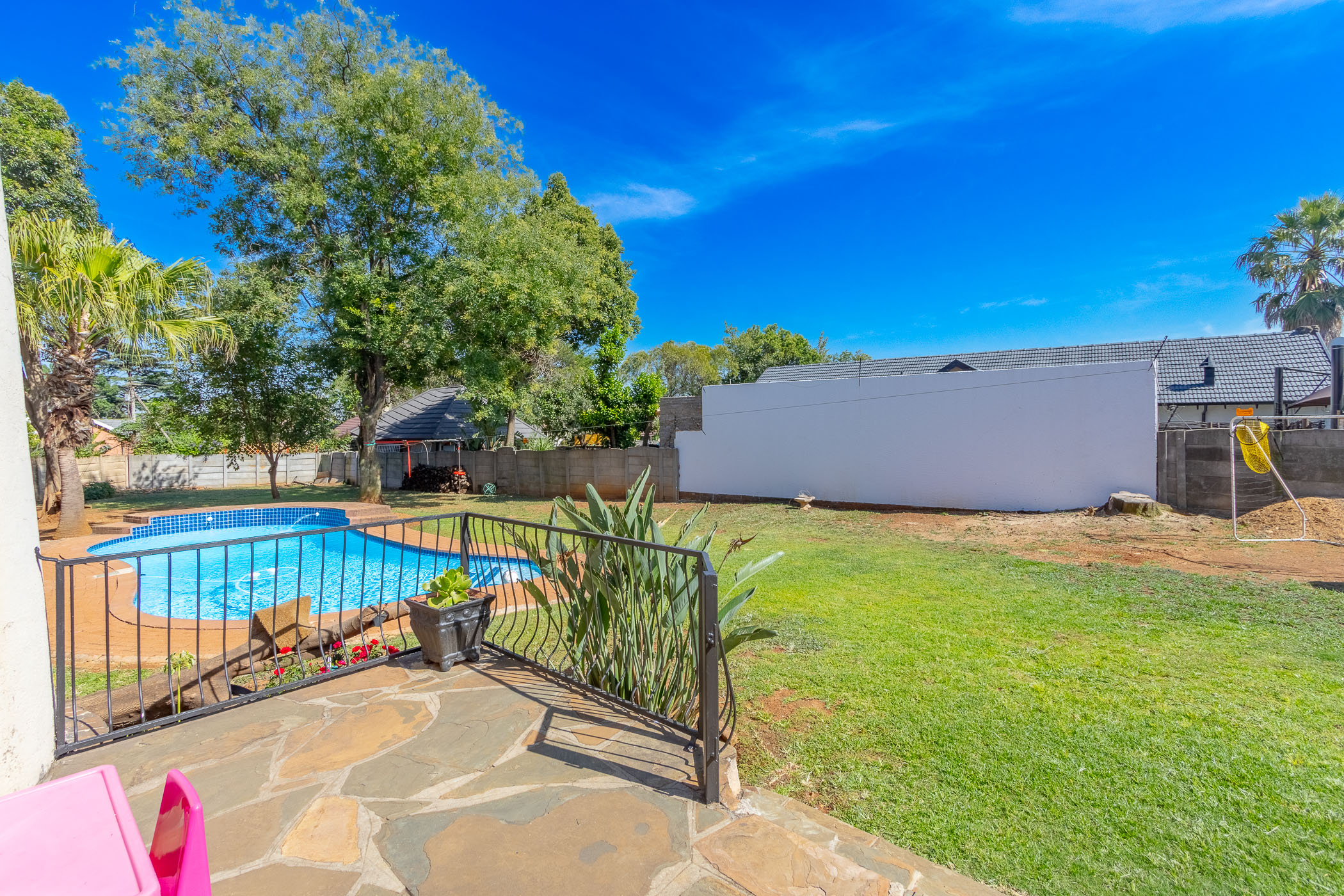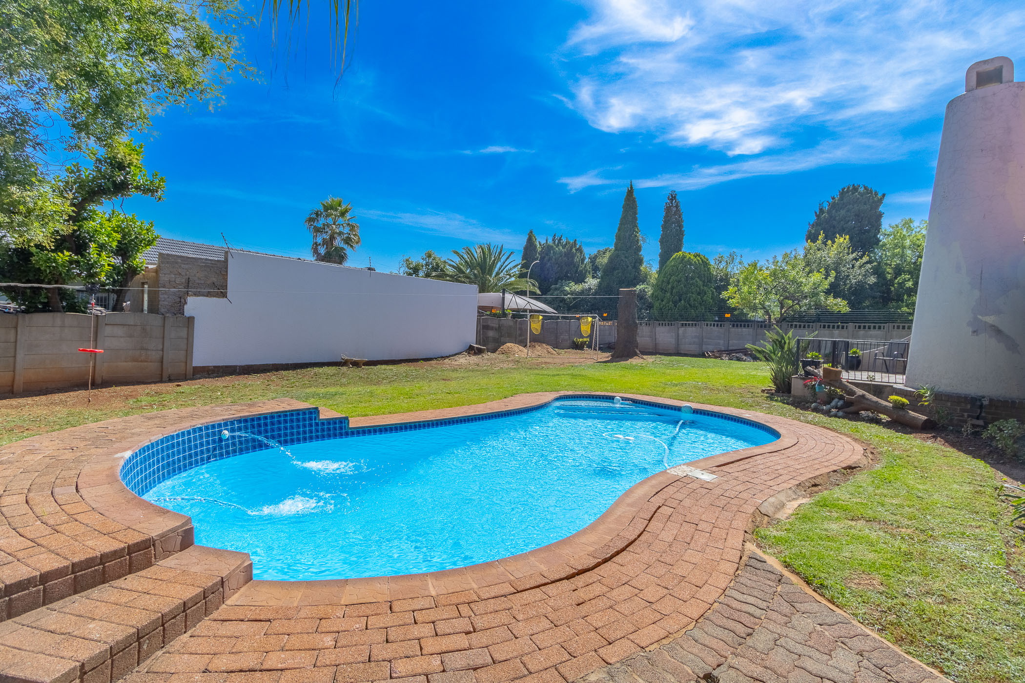 Sparkling swimming pool set in a large, level garden– perfect for outdoor relaxation