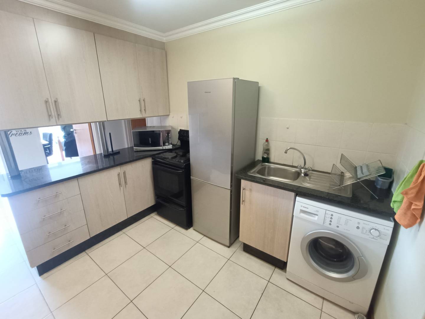 Step into the open-plan kitchen and lounge area, where style meets functionality. The kitchen is equipped with everything you need, seamlessly flowing into a cozy lounge that's perfect for entertaining or unwinding after a long day.