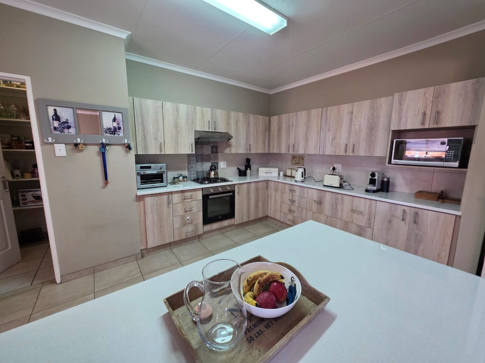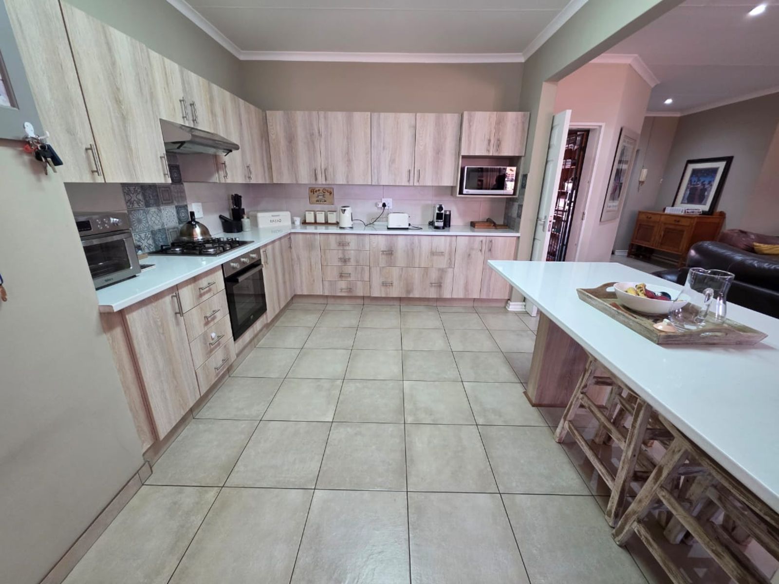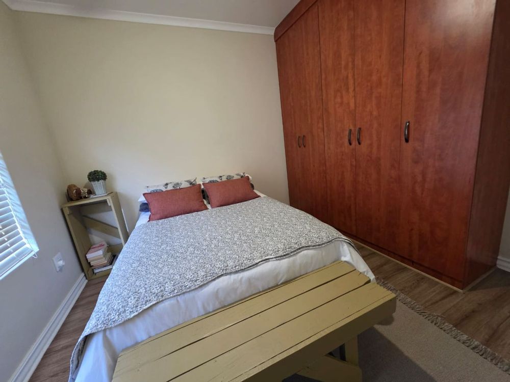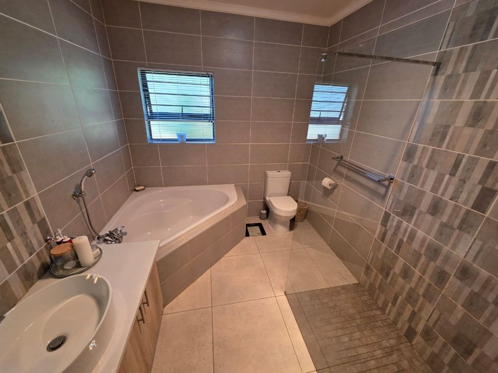 This immaculate three-bedroom, two-bathroom family home is nestled in a sought-after neighborhood and offers modern comfort, security, and style. The heart of the home is the open-plan lounge, dining room, and kitchen—perfectly designed for family living. The kitchen is a chef’s delight, boasting built-in cupboards, a gas hob with under-counter oven, extractor fan, pantry, scullery, and a separate laundry area. A water purification system adds a touch of everyday luxury.