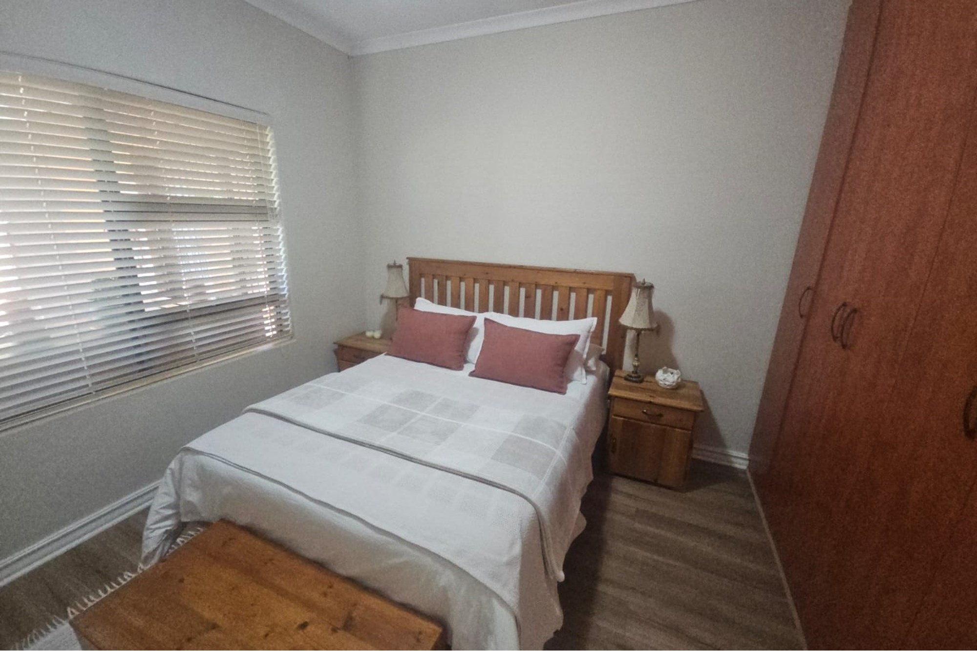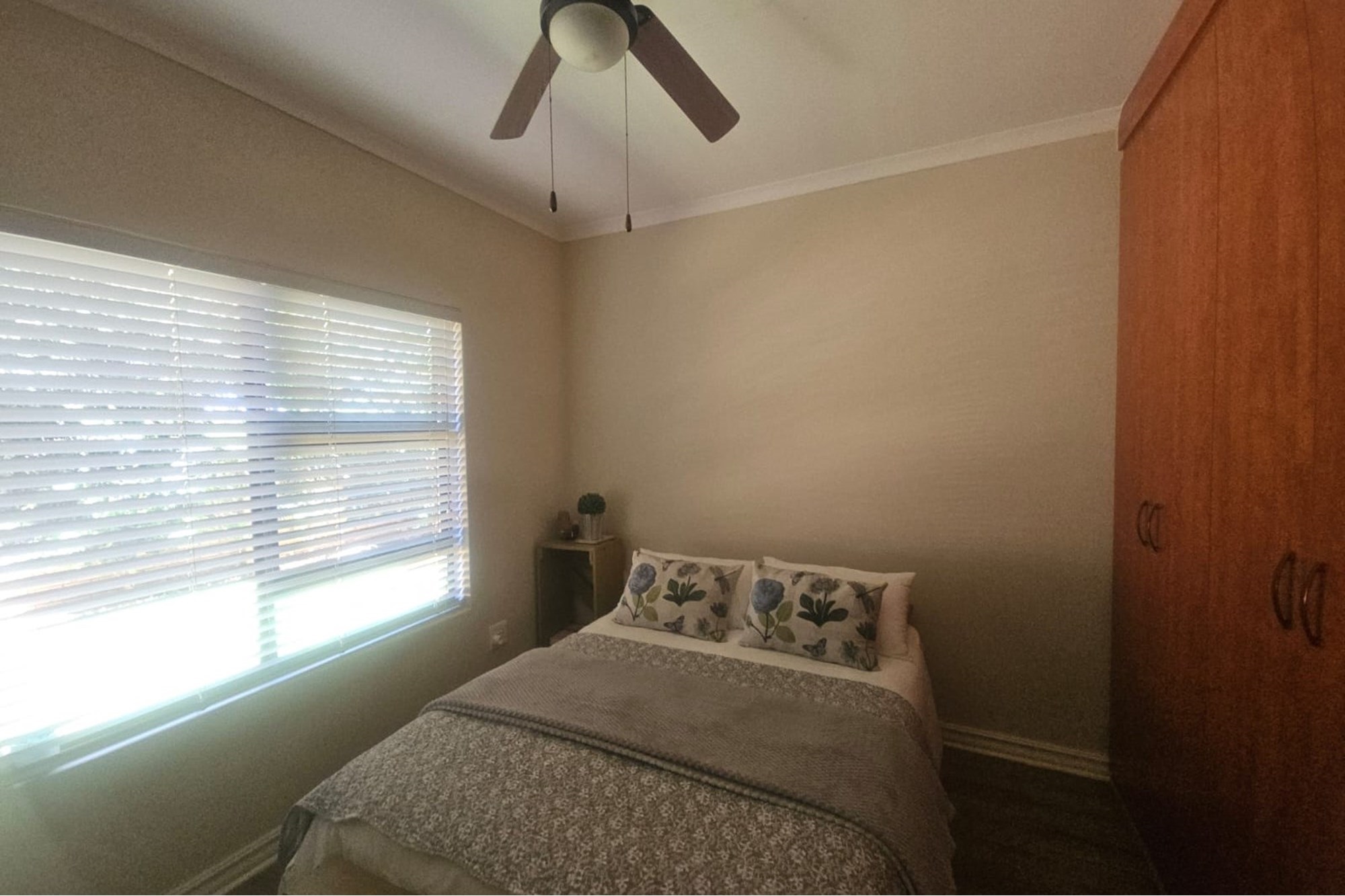 Additional features include a watercooler, a solar power system with an inverter for energy efficiency, and a small, manageable garden with a Jo-Jo tank and an outside toilet with basin.