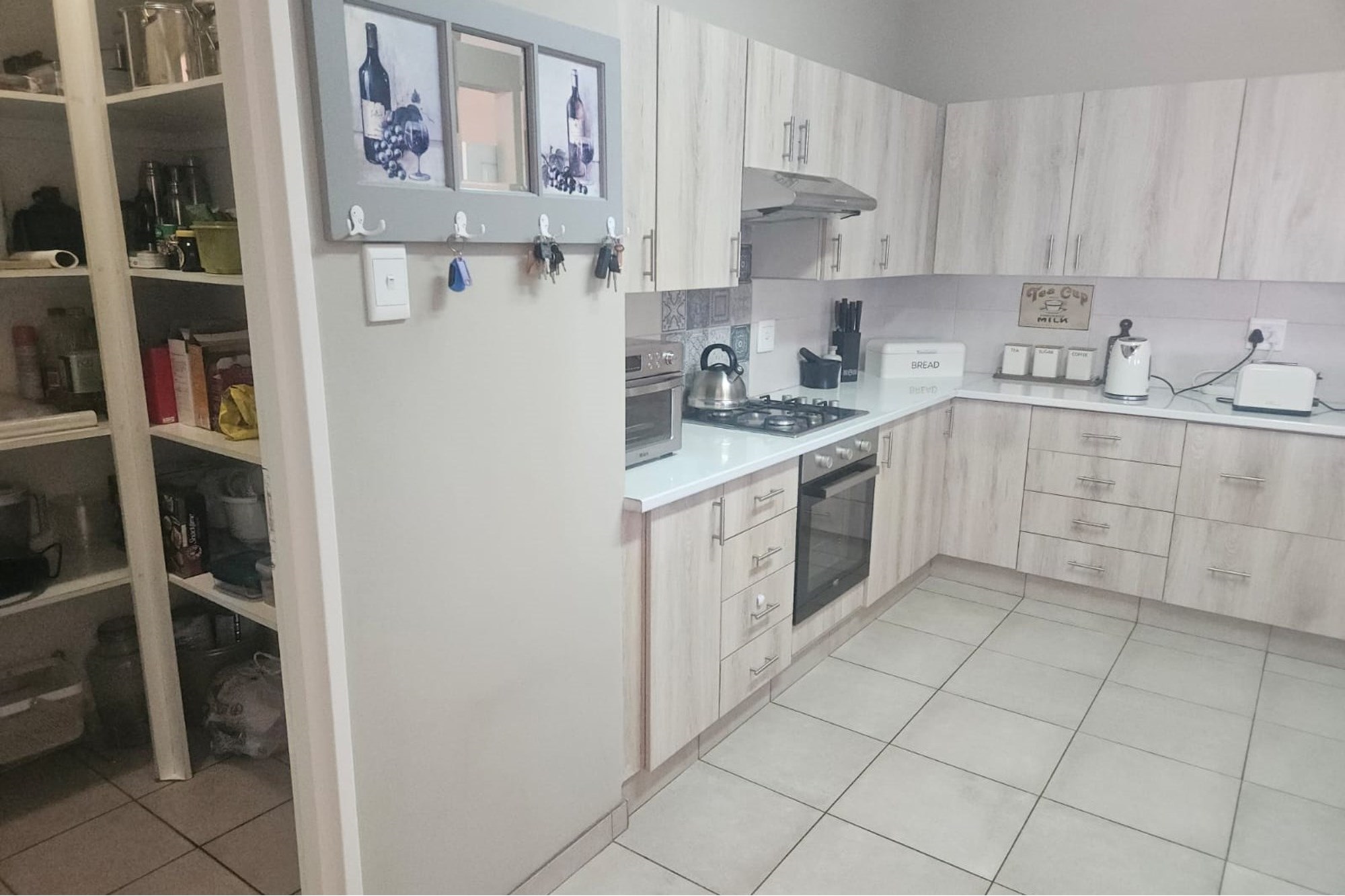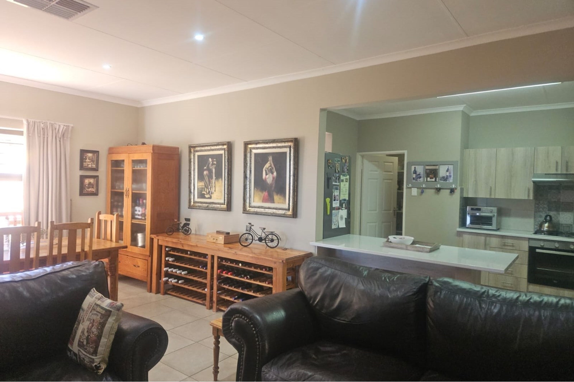 The home boasts three spacious bedrooms and two well-appointed bathrooms. The heart of the home is the open-plan lounge, dining room, and kitchen—perfect for both family living and entertaining. The kitchen features built-in cupboards, an under-counter oven, gas hob, extractor fan, pantry, scullery, and a separate laundry area, ensuring practicality and functionality.