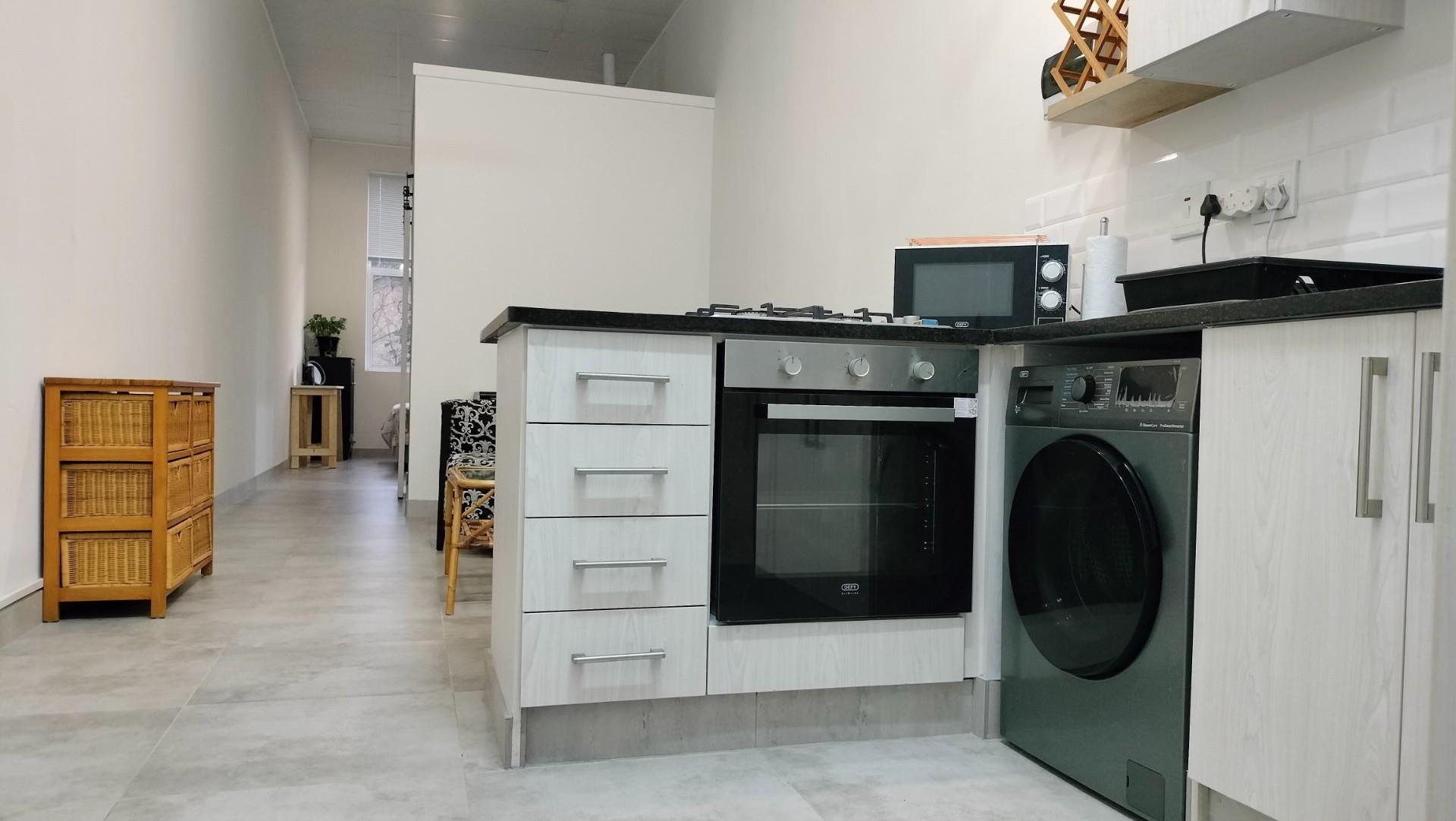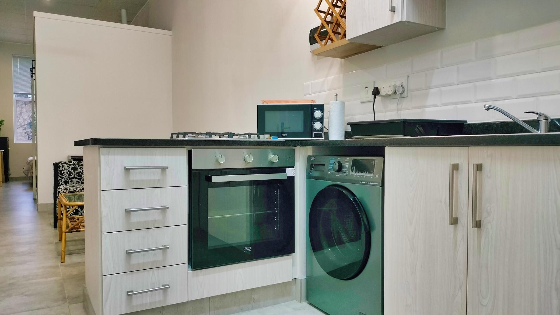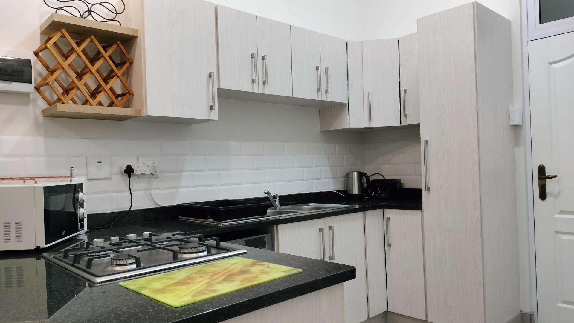 The kitchen is equipped with modern amenities, including a gas hob and under counter oven, making it an ideal space for daily meal prep. Built-in cupboards offer ample storage, helping to keep the living area tidy and organised.