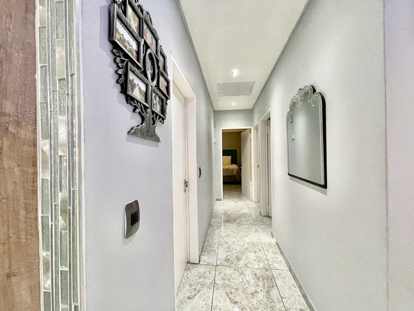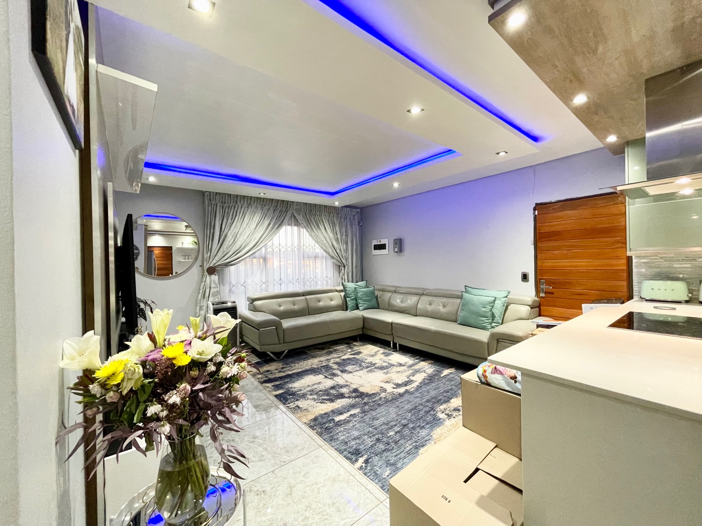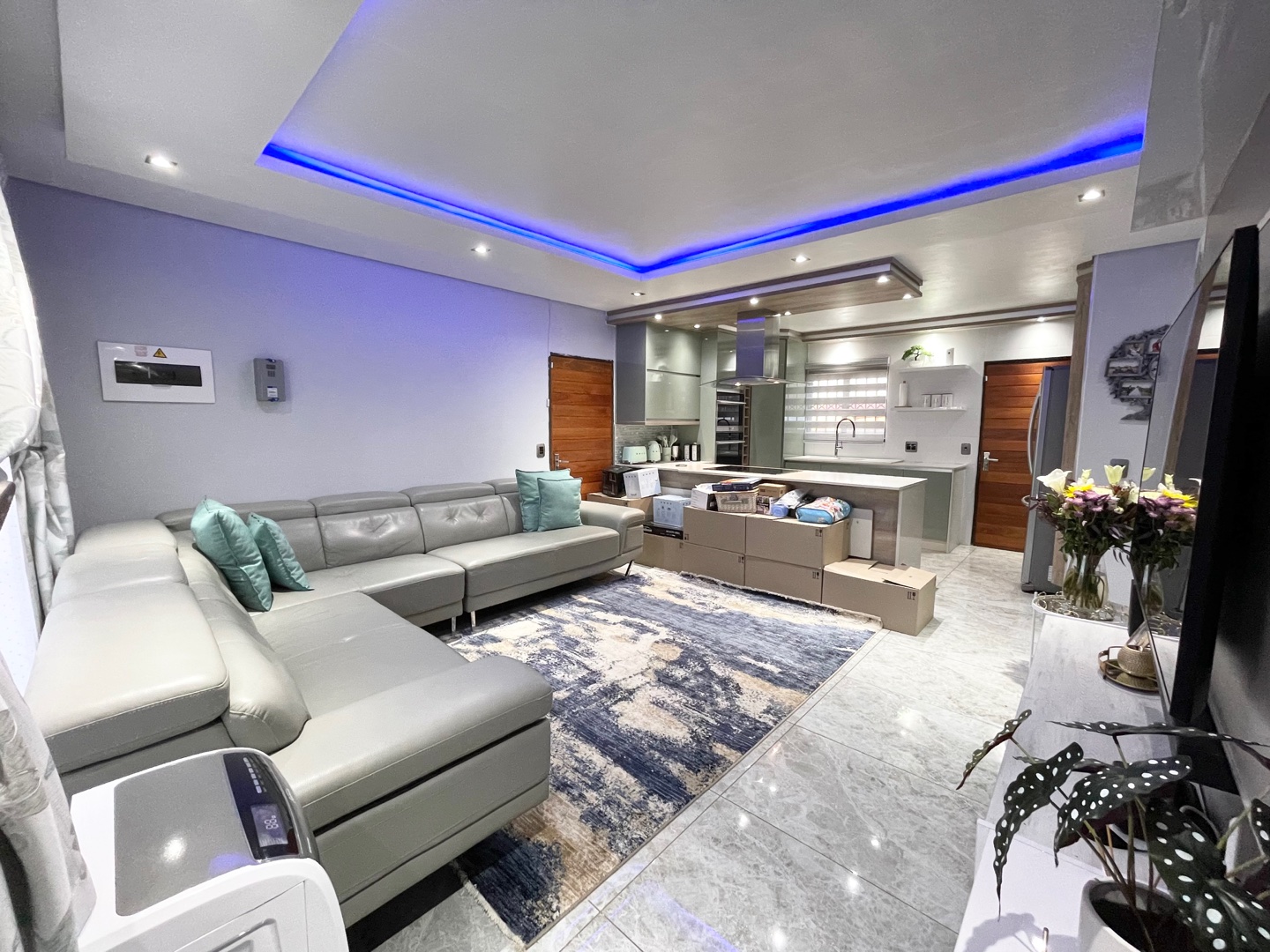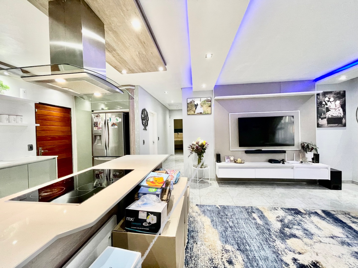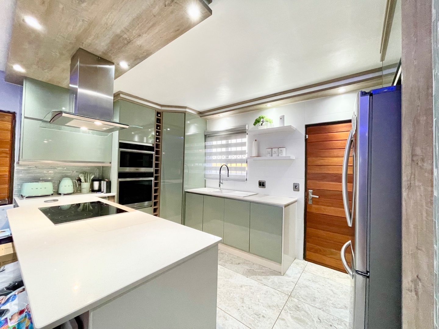 Step into a dreamy glossy kitchen across a spacious living area designed for both relaxation and entertainment, providing the ideal backdrop for creating lasting memories with family and friends.