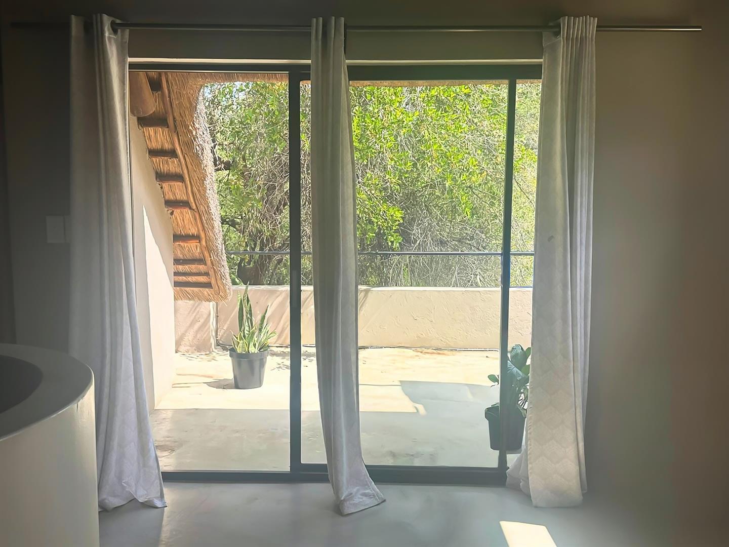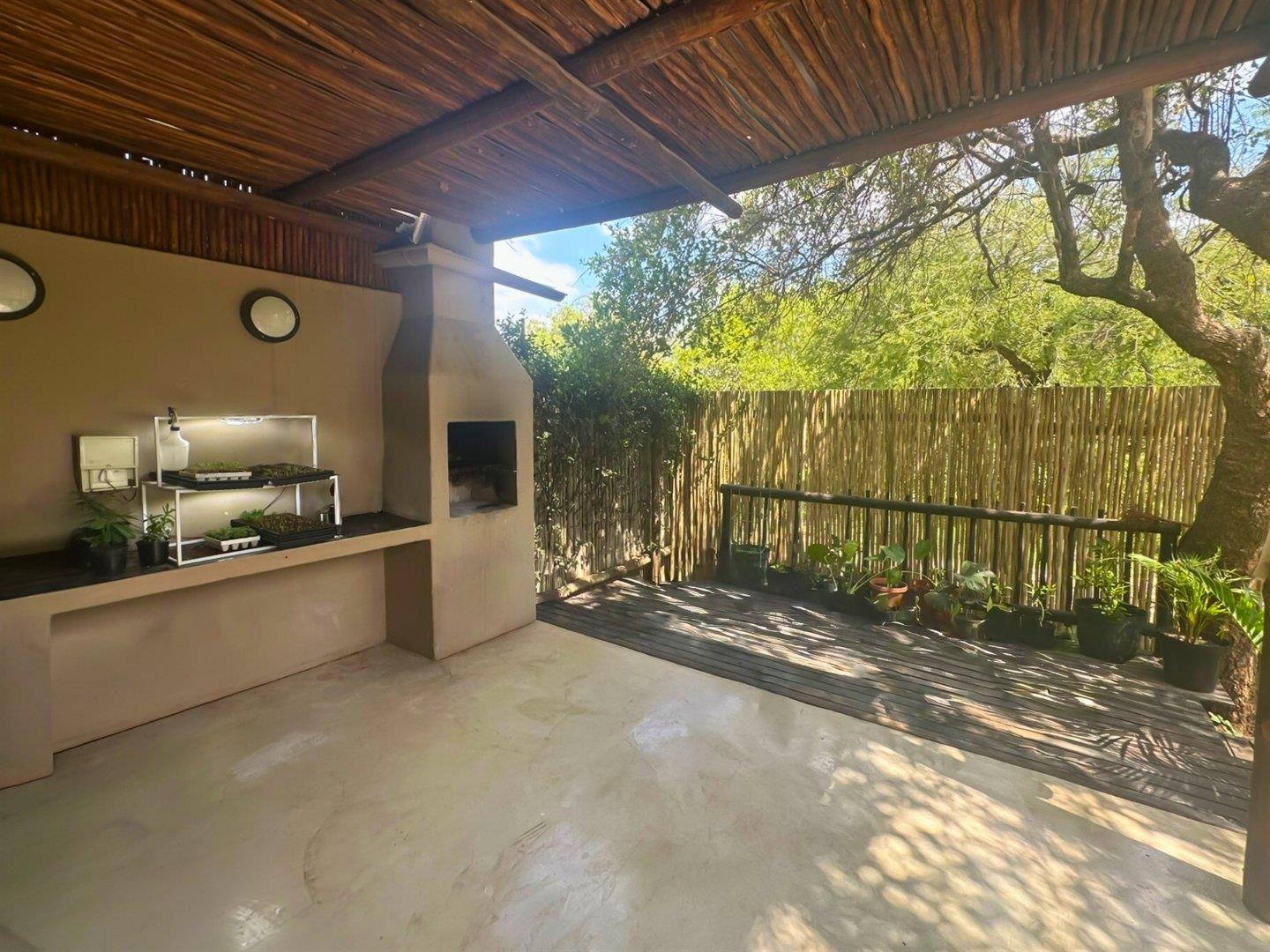 Located within the secure, gated community of Raptors Escape in Hoedspruit, this modern thatch home offers three air-conditioned bedrooms and two bathrooms. A wrought-iron spiral staircase leads to the loft bedroom, which features an en-suite bathroom and its own private patio. The two additional bedrooms and a full bathroom are positioned on the ground floor.