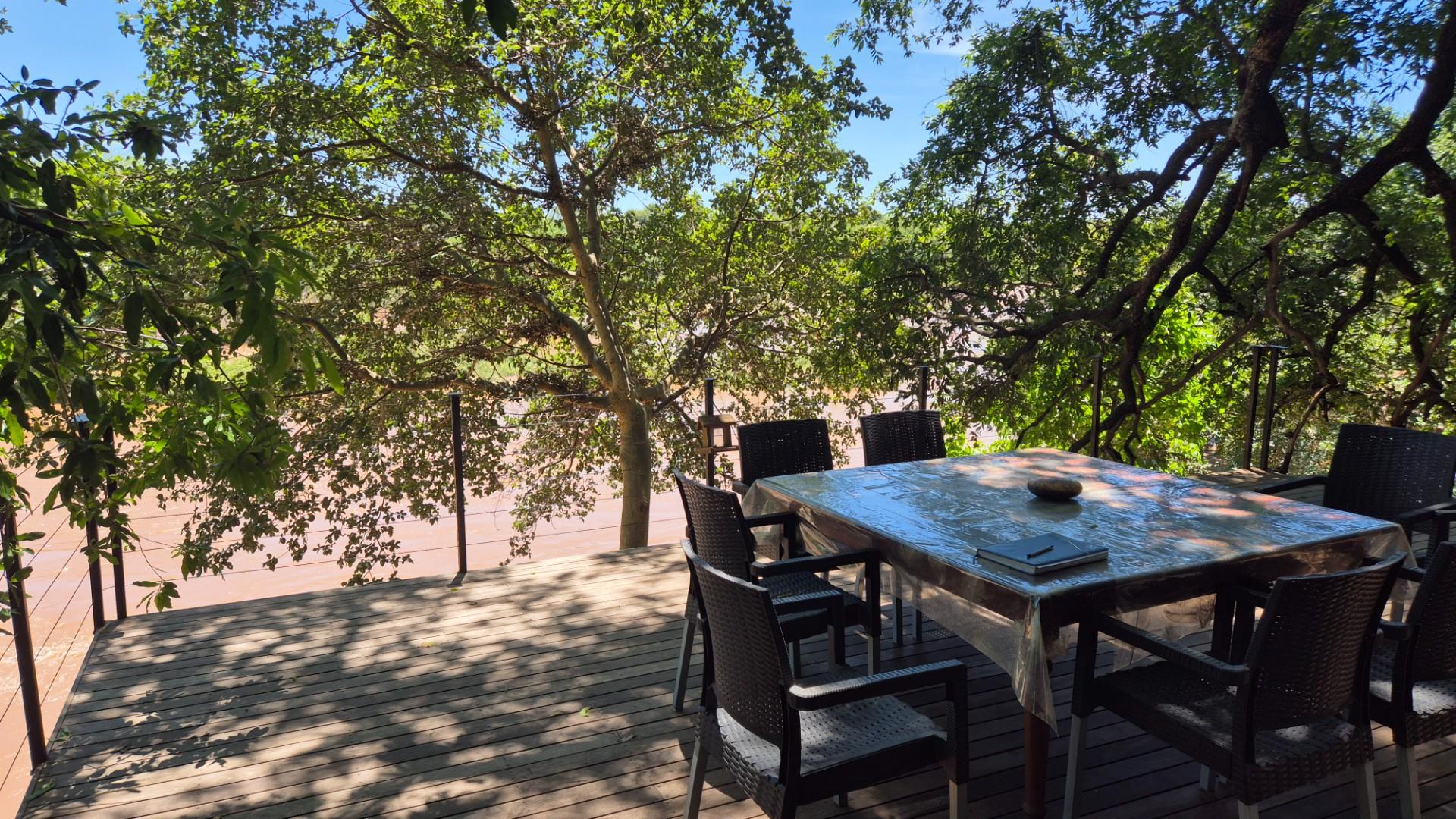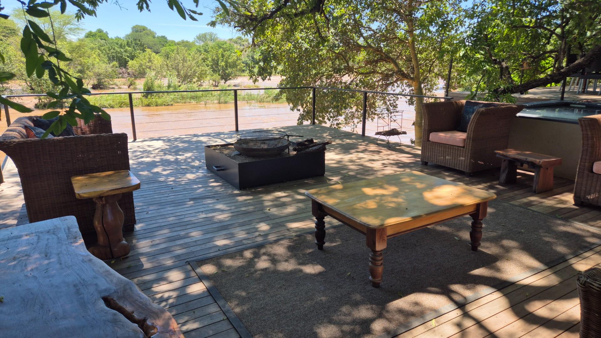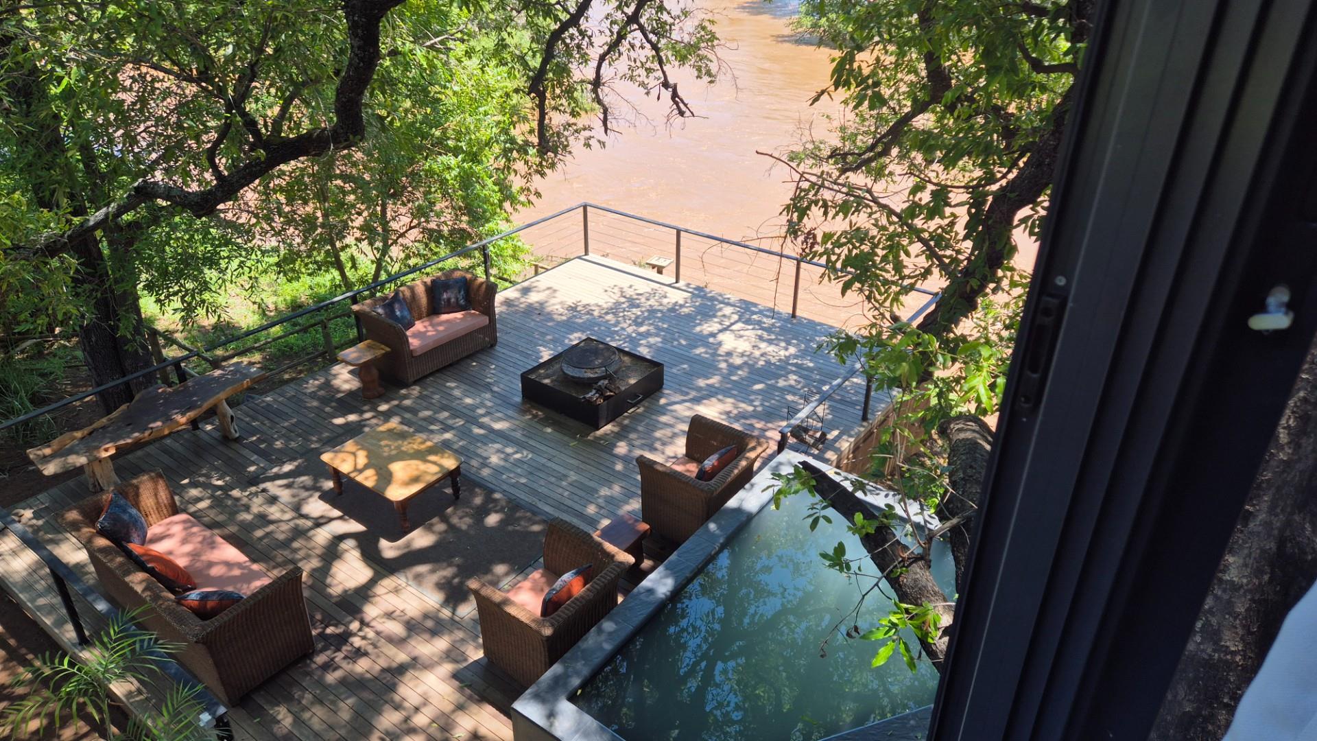 The open plan living area is modern with cement screet flooring, aluminum sliding doors opening to wooden decks where you are entertained by a jacuzzi/ pool, boma area and two spacious seating and eating areas on top of the river. All covered in the shade of mature fig, leadwood and Jackelberry trees, ensuring a fresh luxurious environment where you want to spend time interacting with nature, listening to the birds and flowing water and spying on the odd Hippo and visiting monkeys and plains game around you.