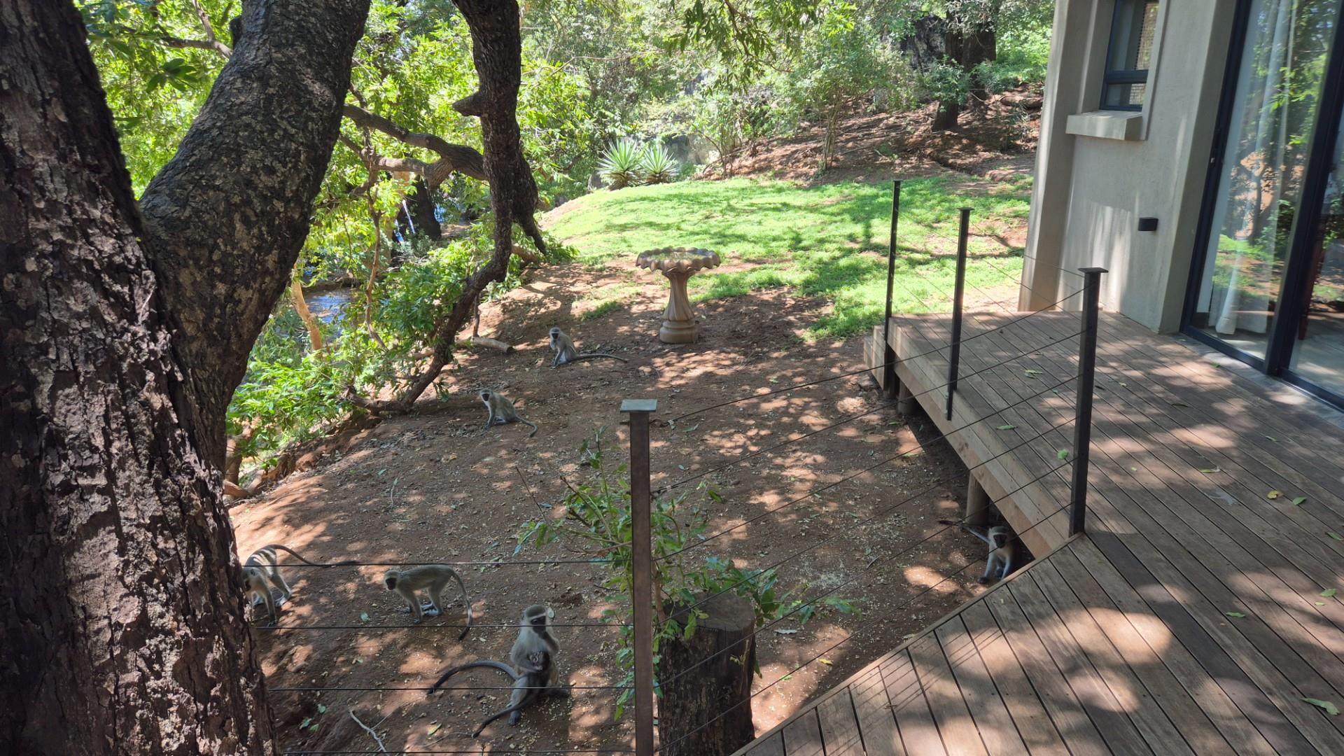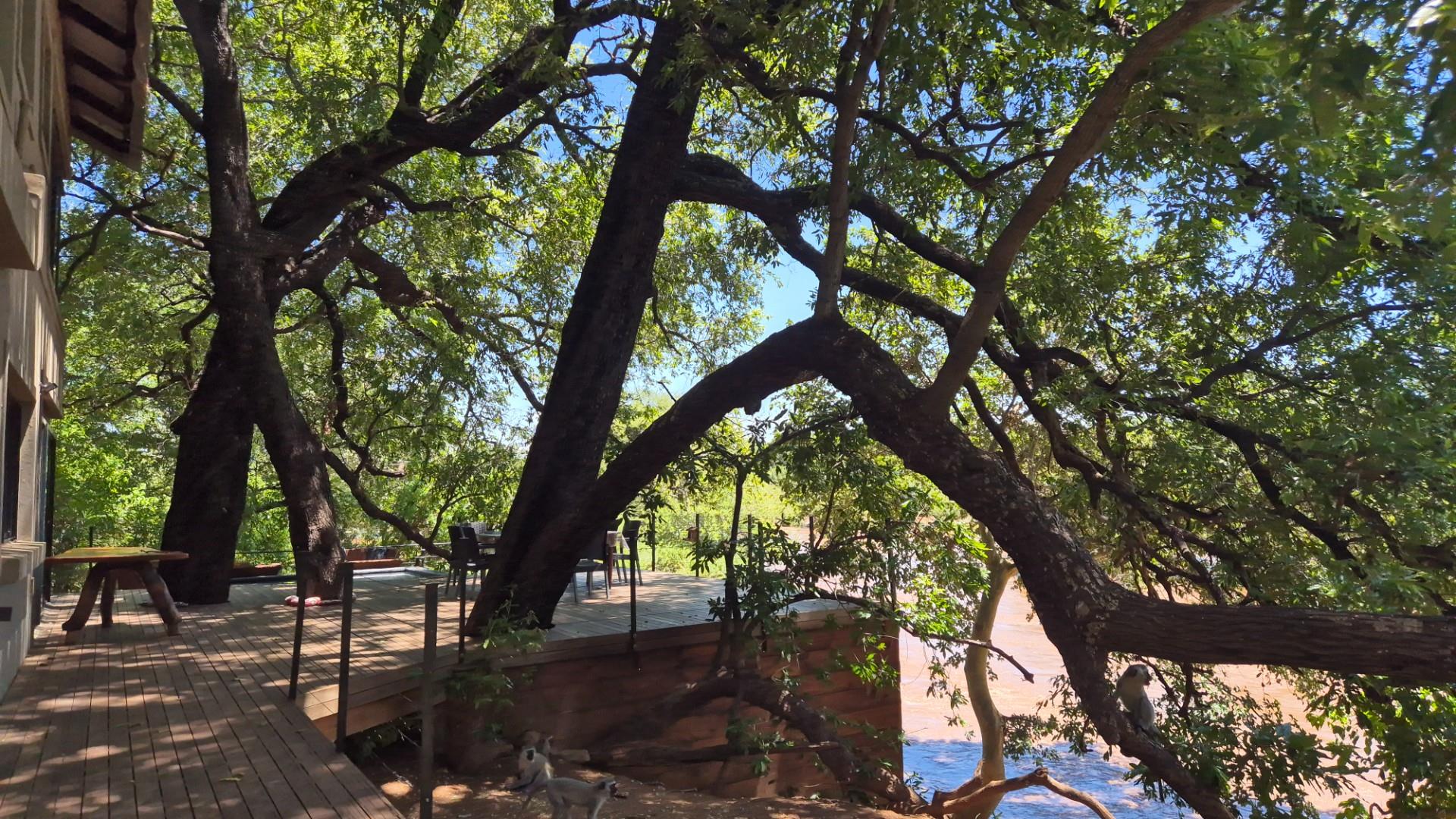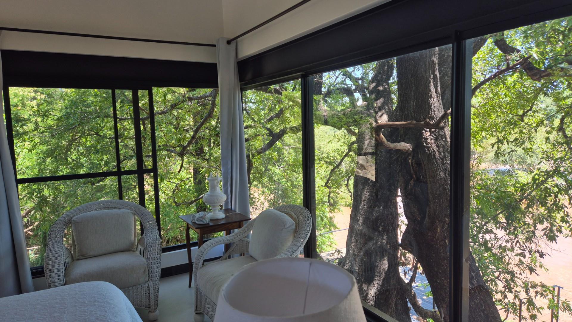 The open plan living area is modern with cement screet flooring, aluminum sliding doors opening to wooden decks where you are entertained by a jacuzzi/ pool, boma area and two spacious seating and eating areas on top of the river. All covered in the shade of mature fig, leadwood and Jackelberry trees, ensuring a fresh luxurious environment where you want to spend time interacting with nature, listening to the birds and flowing water and spying on the odd Hippo and visiting monkeys and plains game around you.
