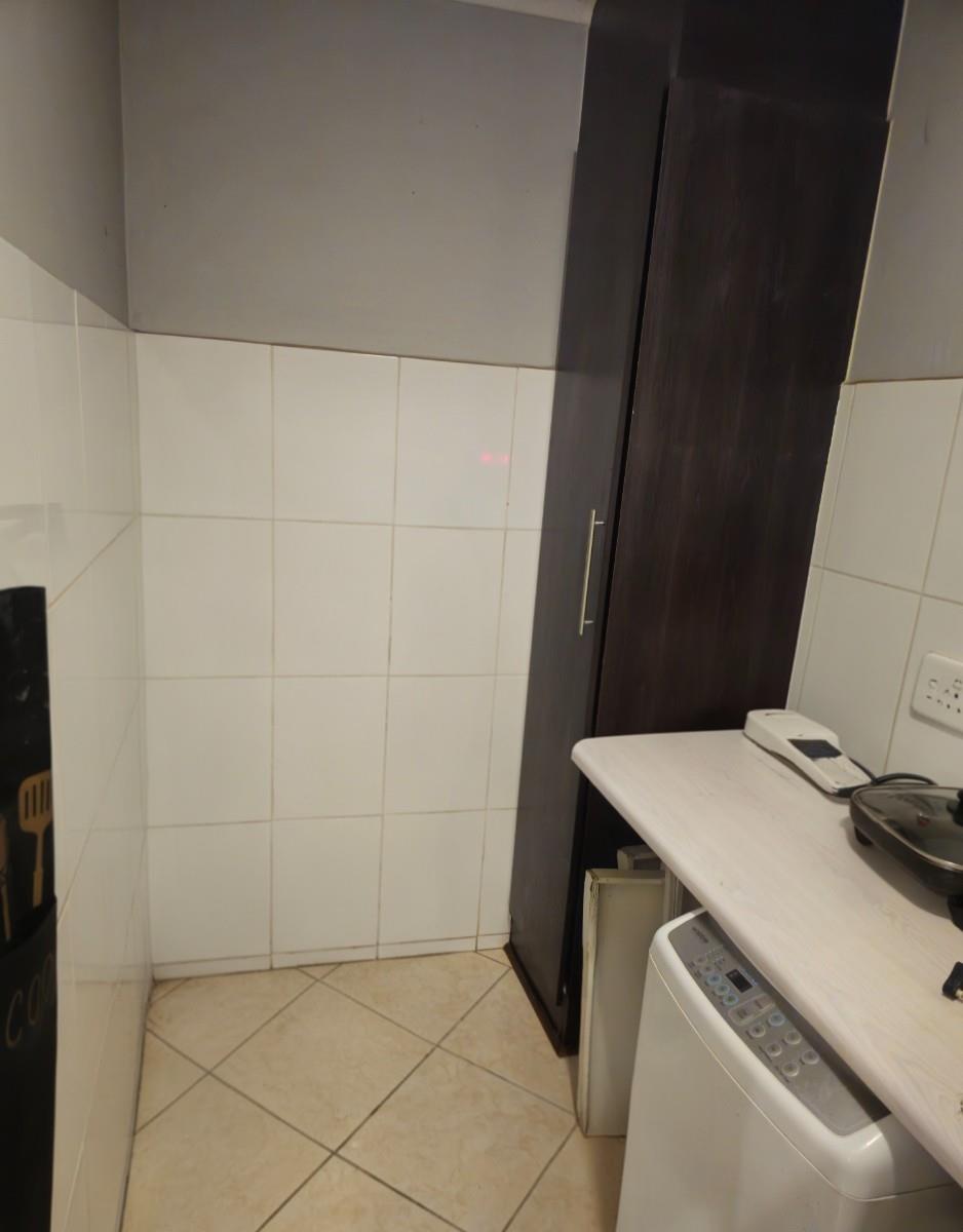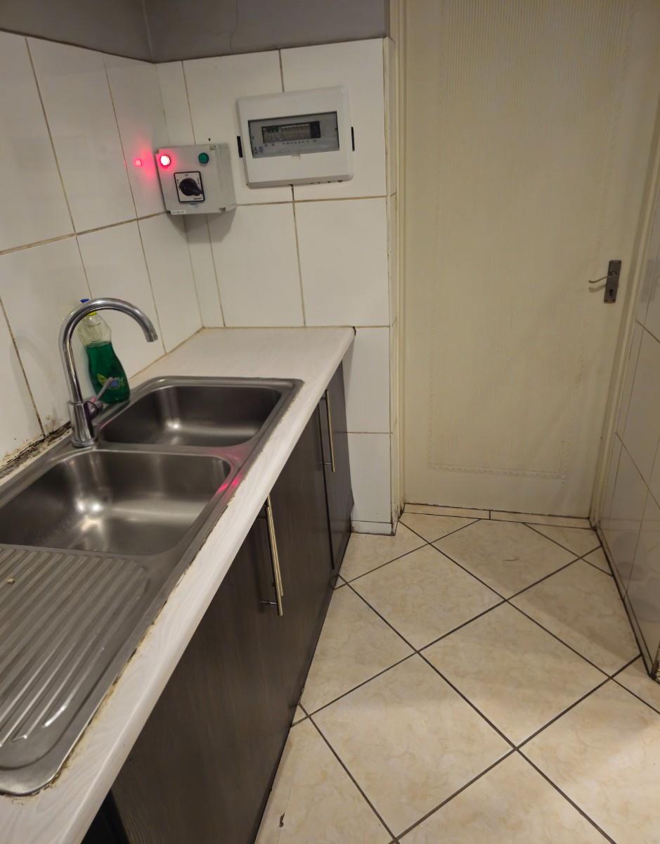 The contemporary kitchen is fitted with ample cupboard space and practical finishes, offering functionality and style.