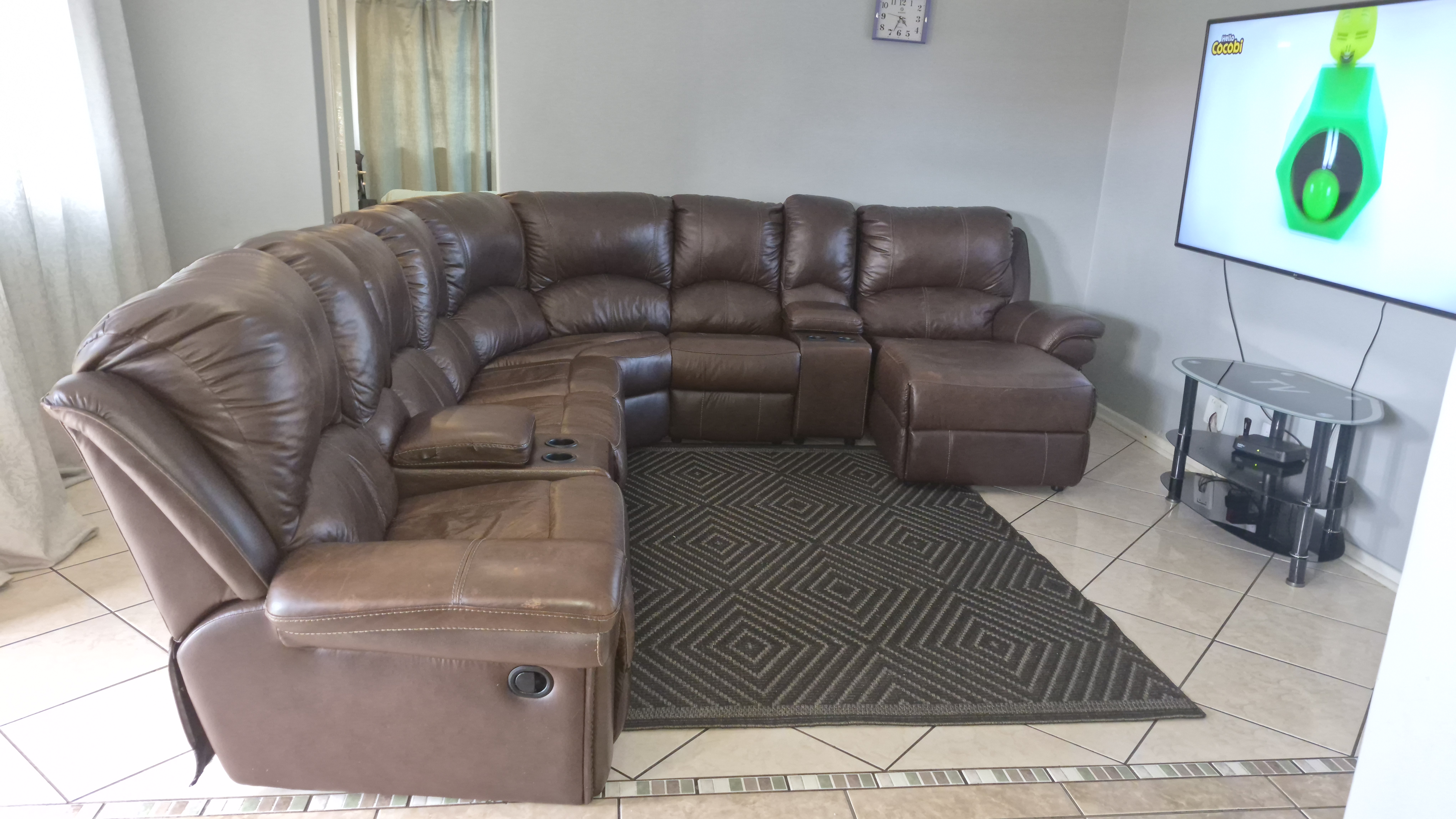 Tiles and carpet throughout the house.