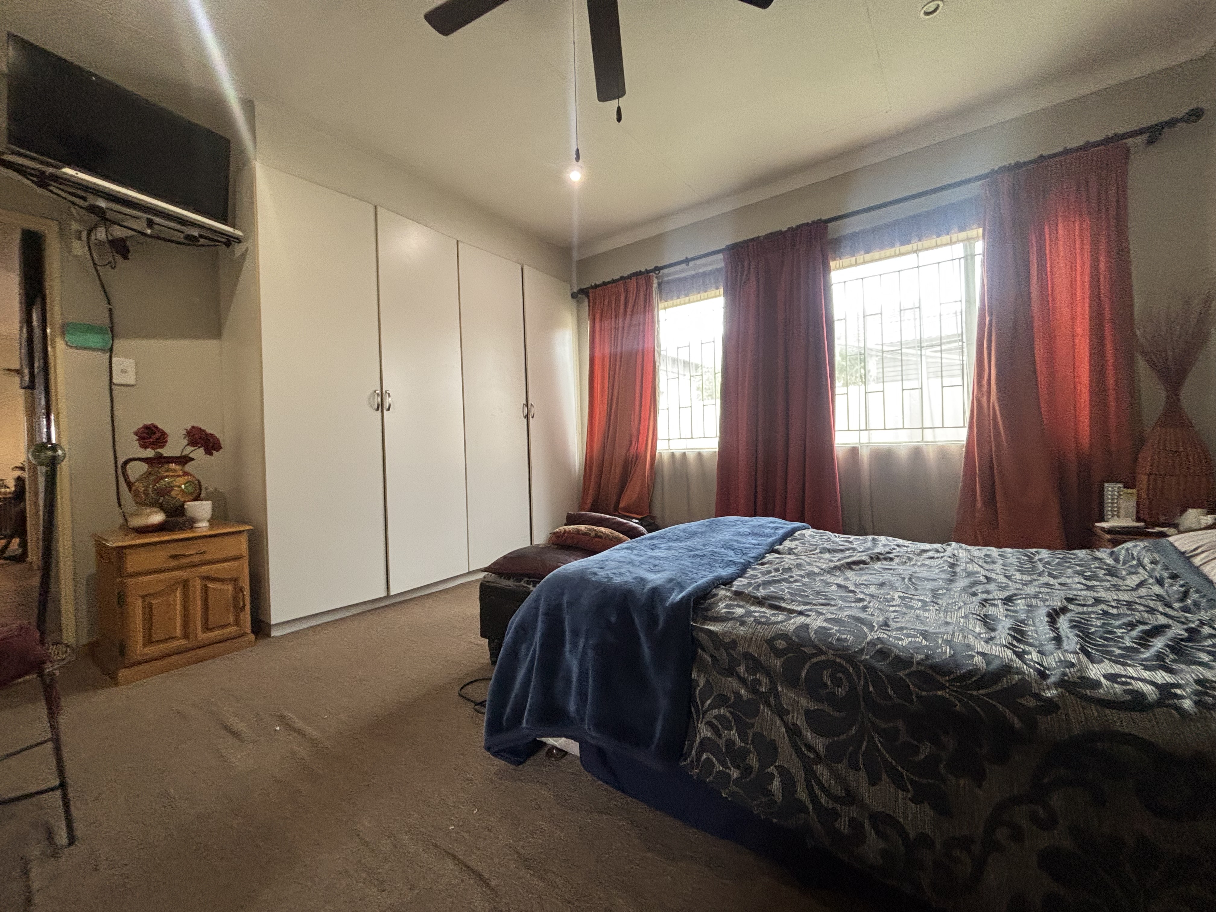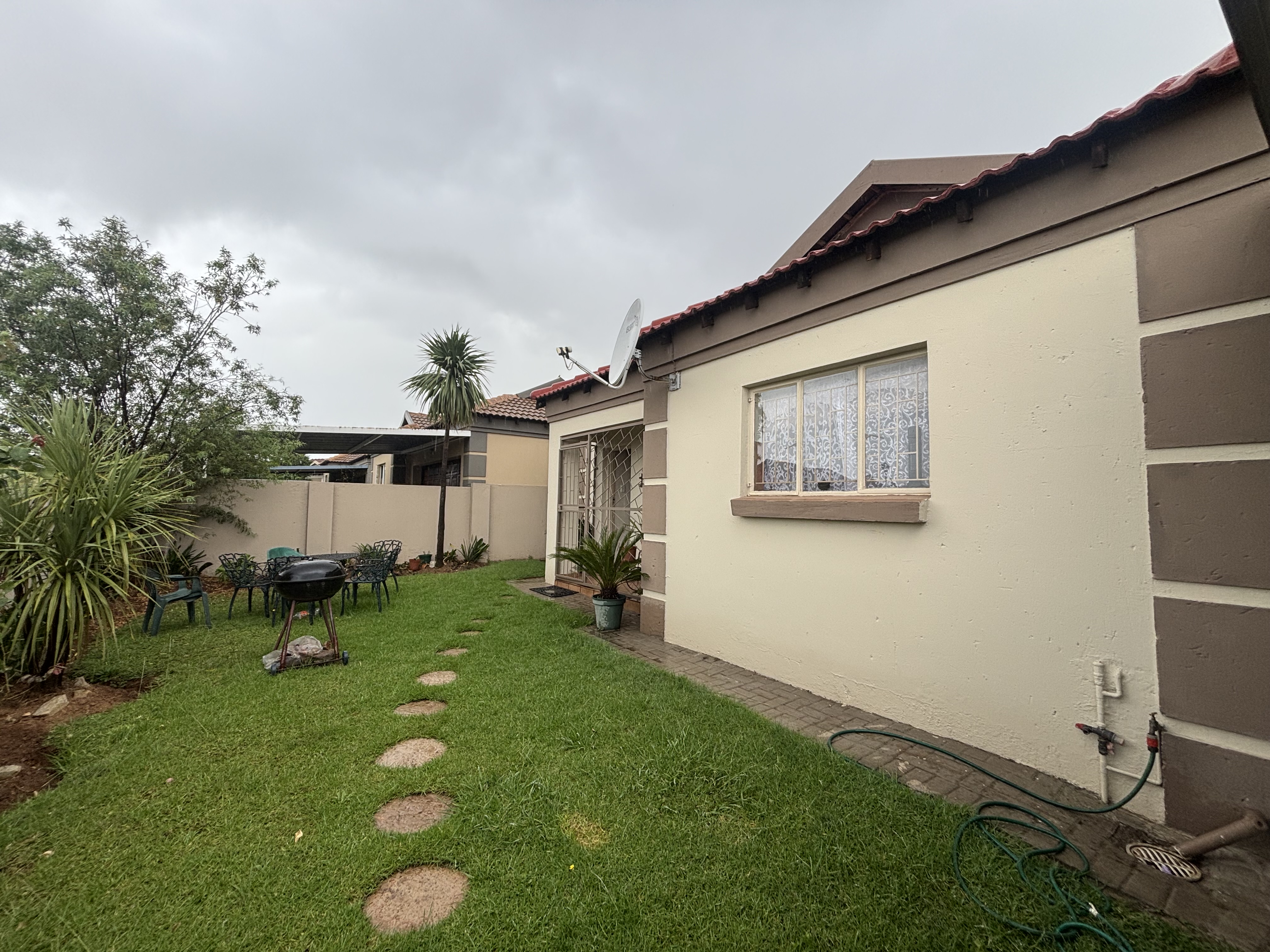 The property boasts three well-sized bedrooms, including a main bedroom with an en-suite full bathroom, while the shared bathroom includes a shower, toilet, and basin. The patio has been enclosed, complete with a built-in braai, perfect for entertaining. Double garages and carports provide convenient additional parking. A small garden offers a delightful space for casual gardening. Additionally, a JoJo tank and pressure pump are valuable extras included with the property.