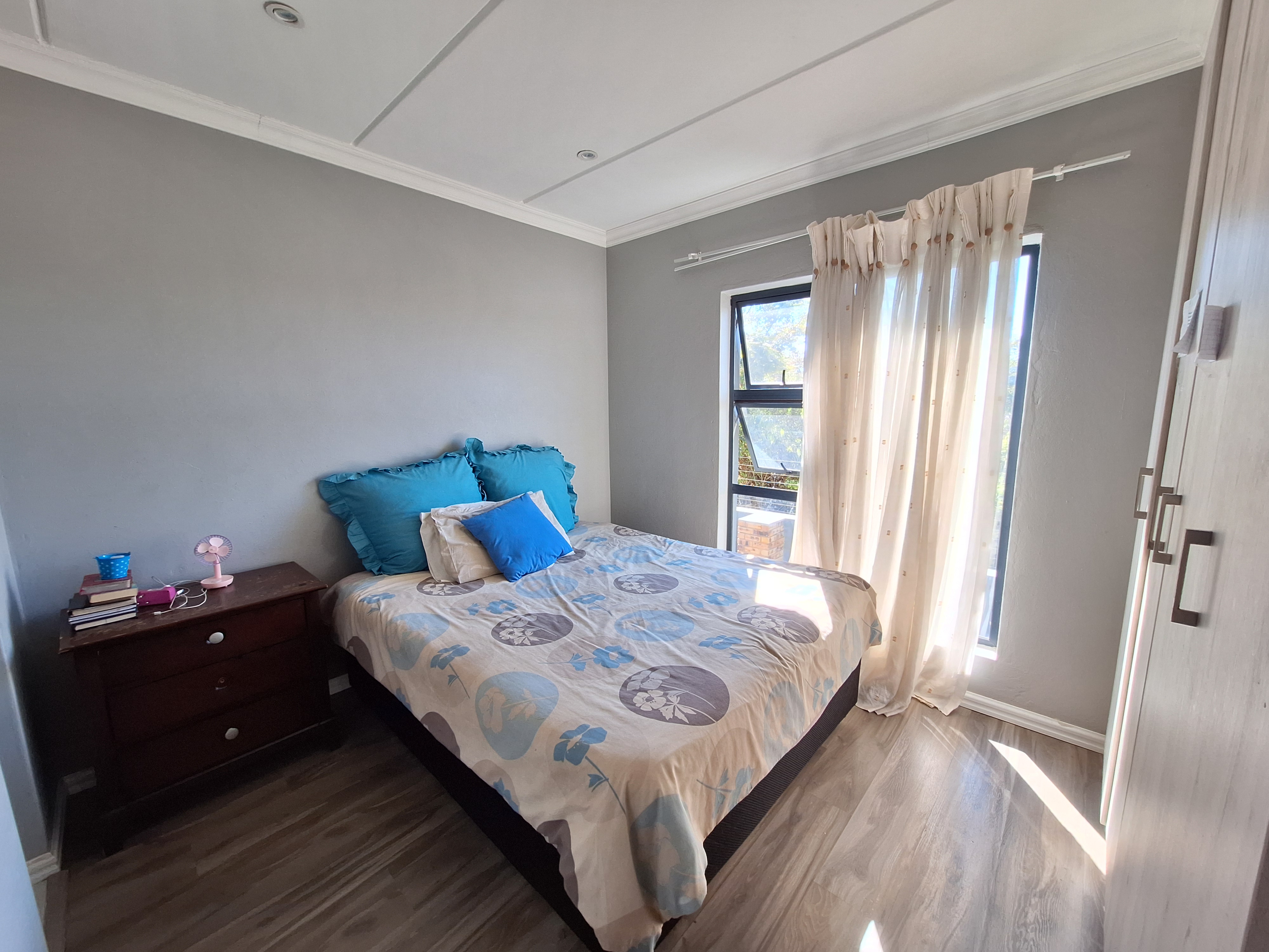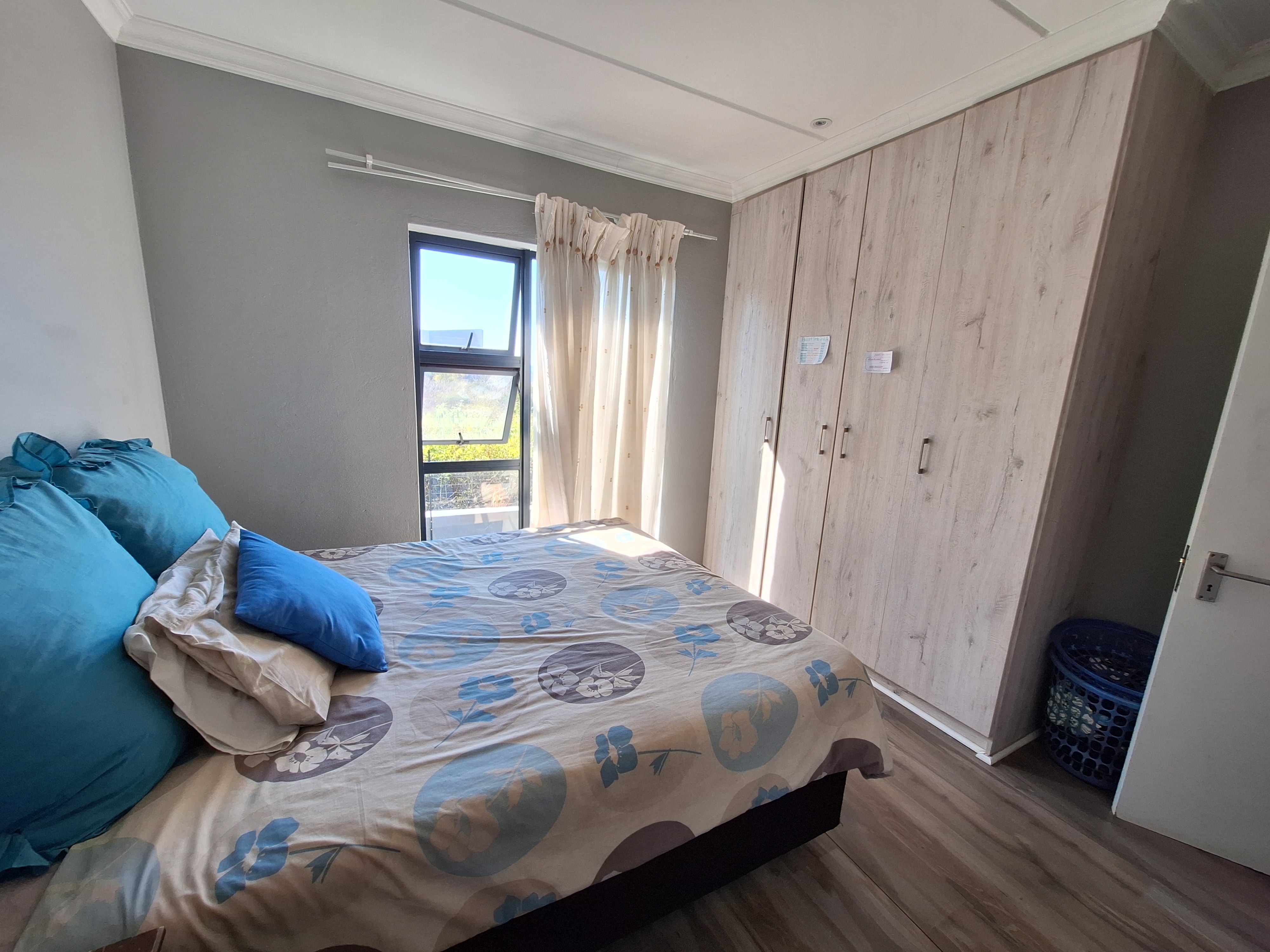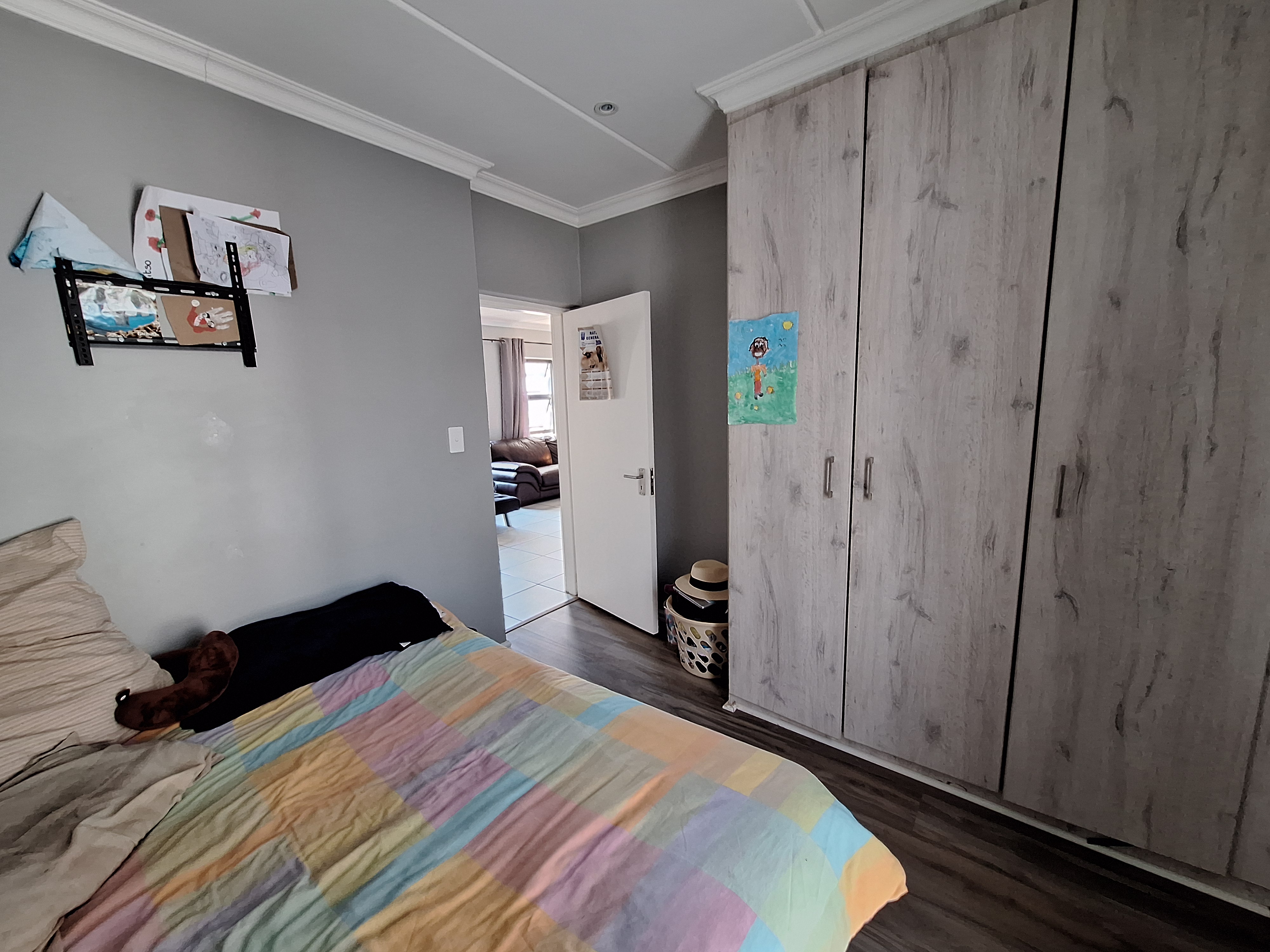 Three well-proportioned bedrooms, all featuring laminated flooring and built-in cupboards.
