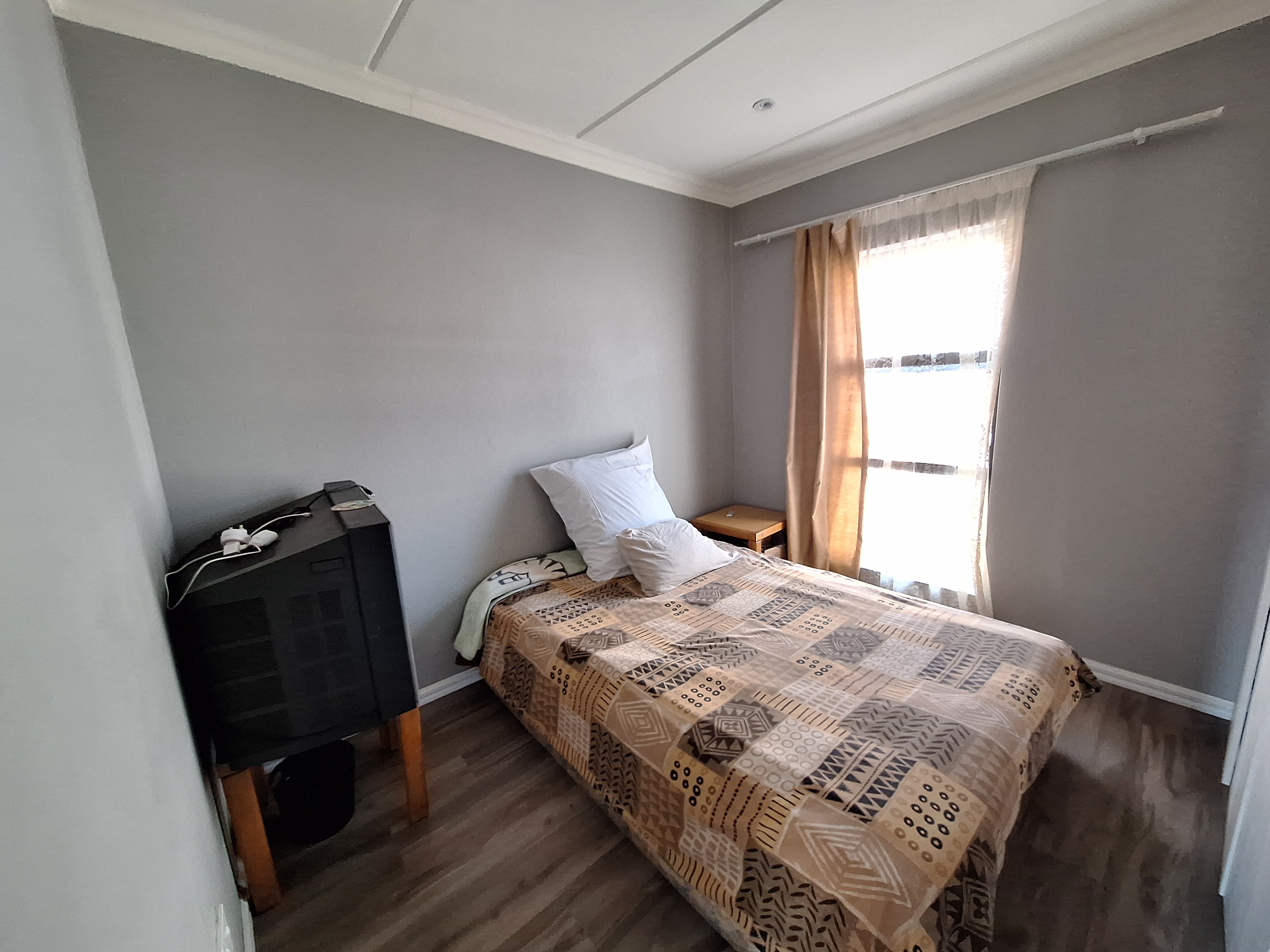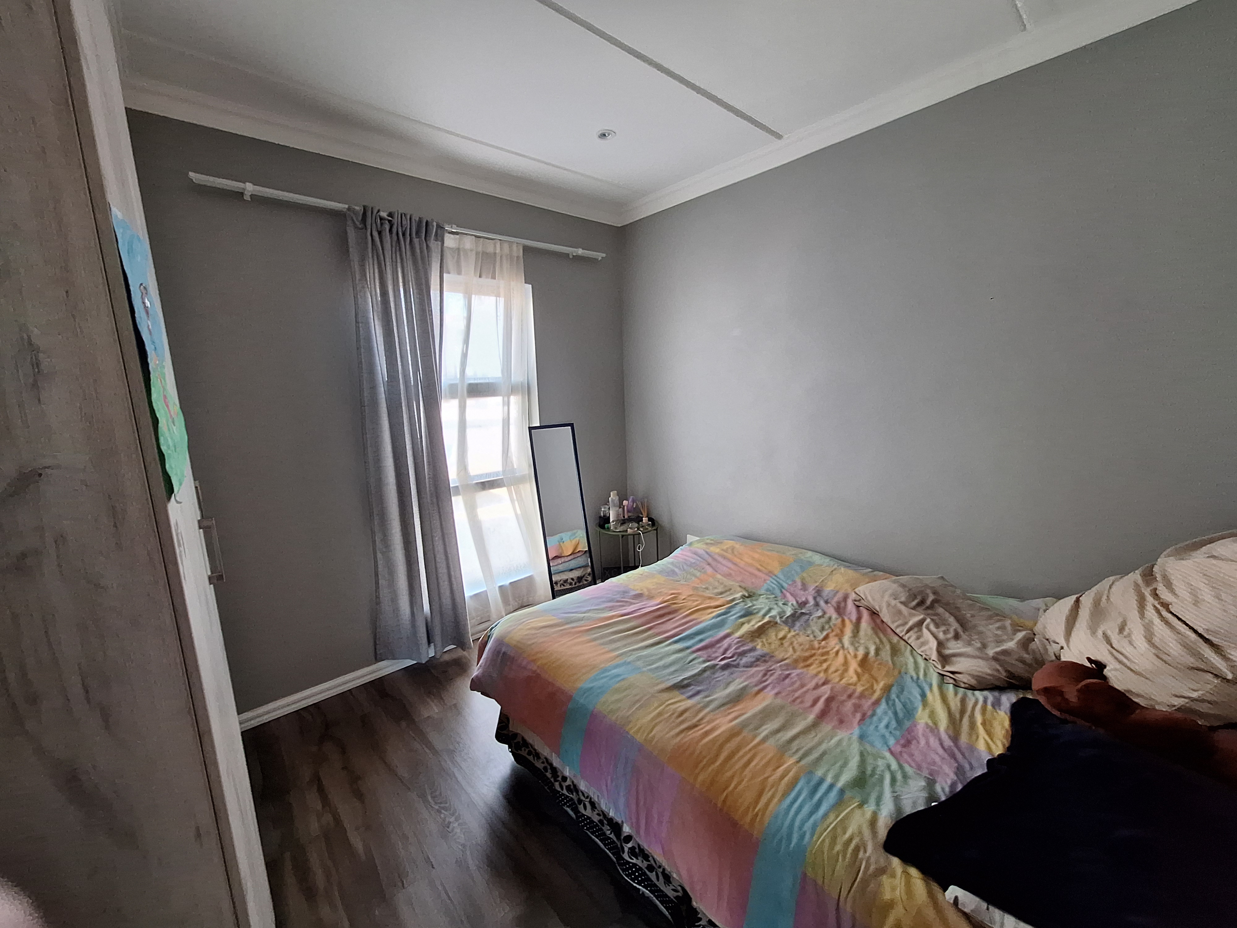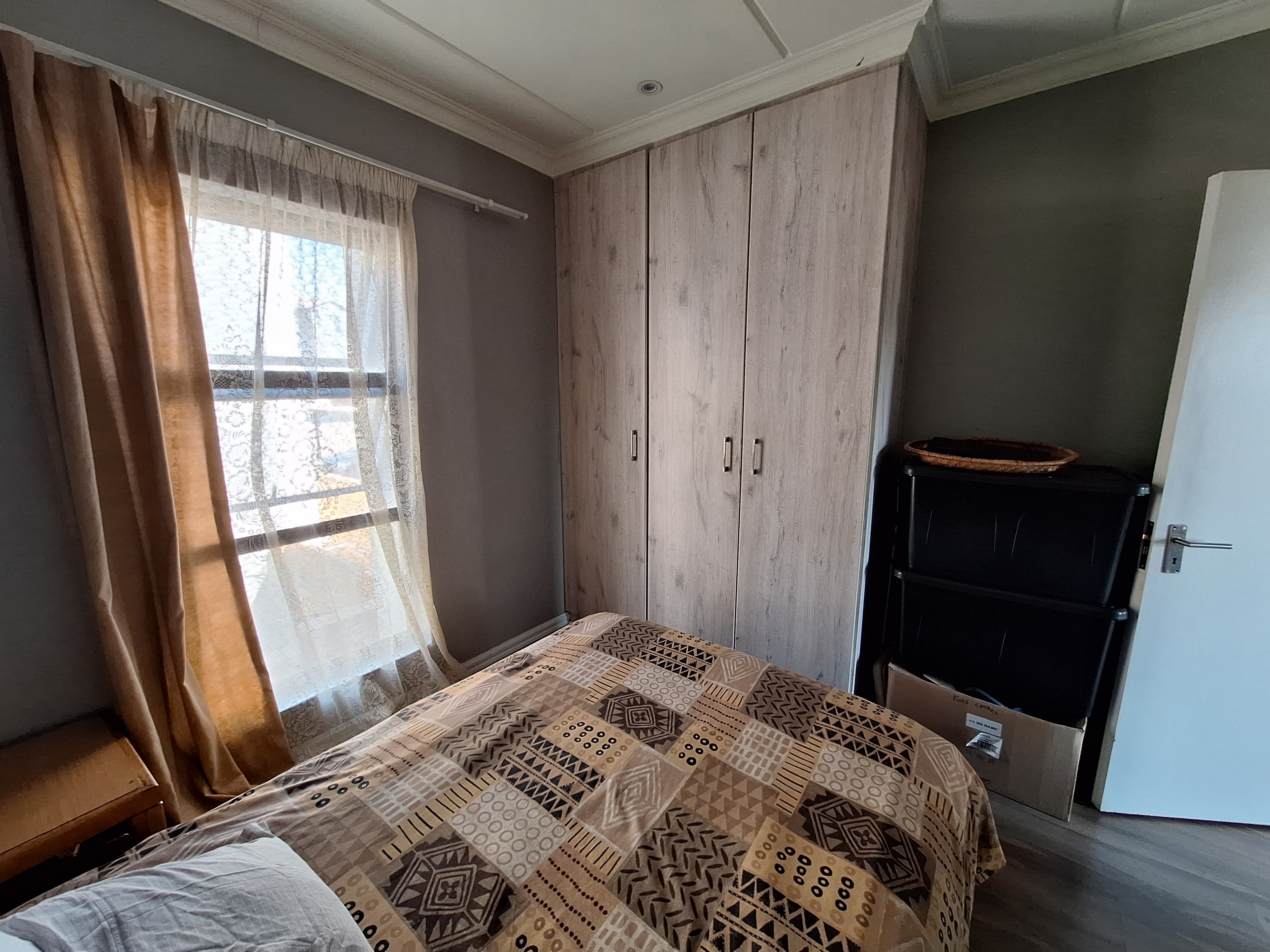 Three well-proportioned bedrooms, all featuring laminated flooring and built-in cupboards.