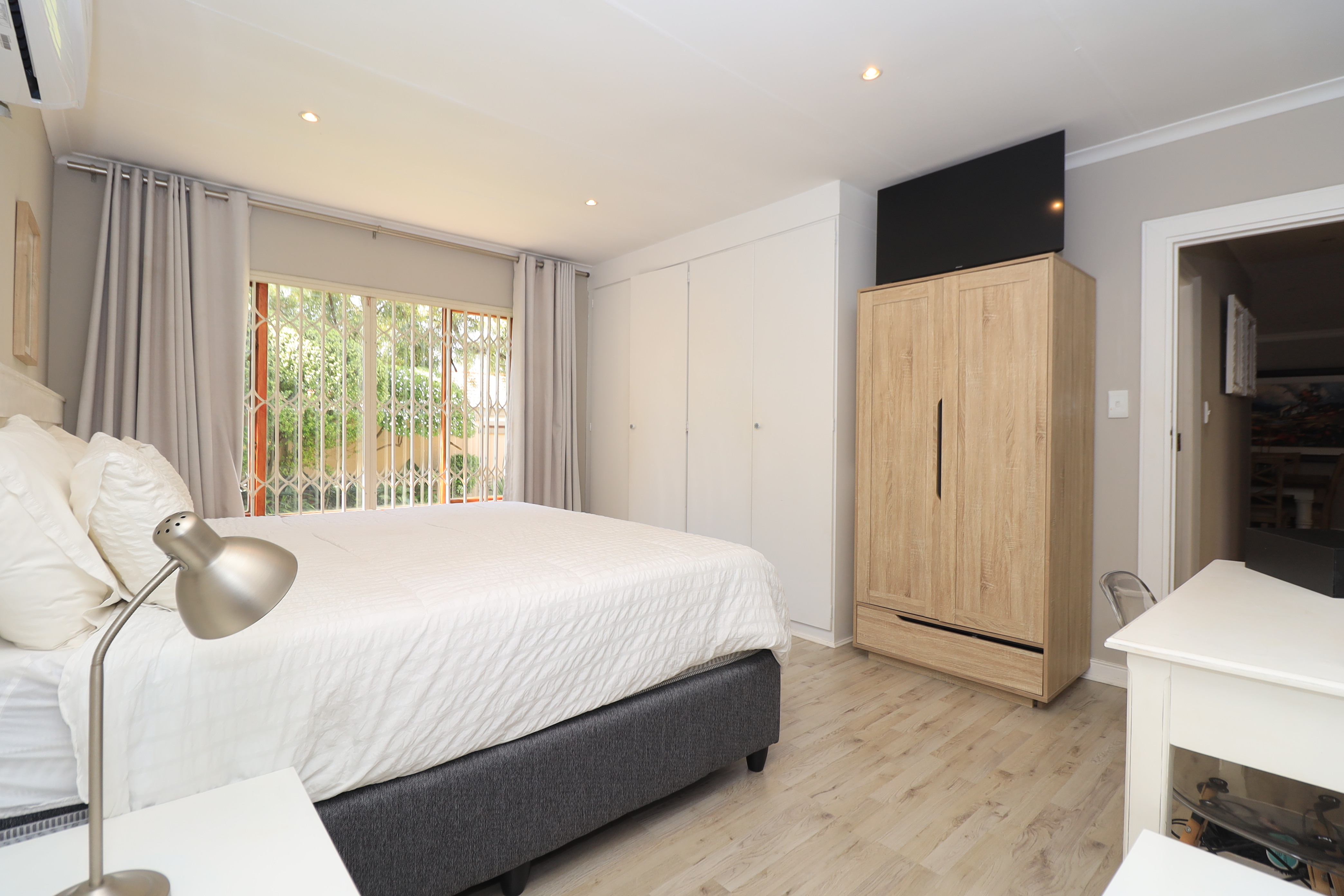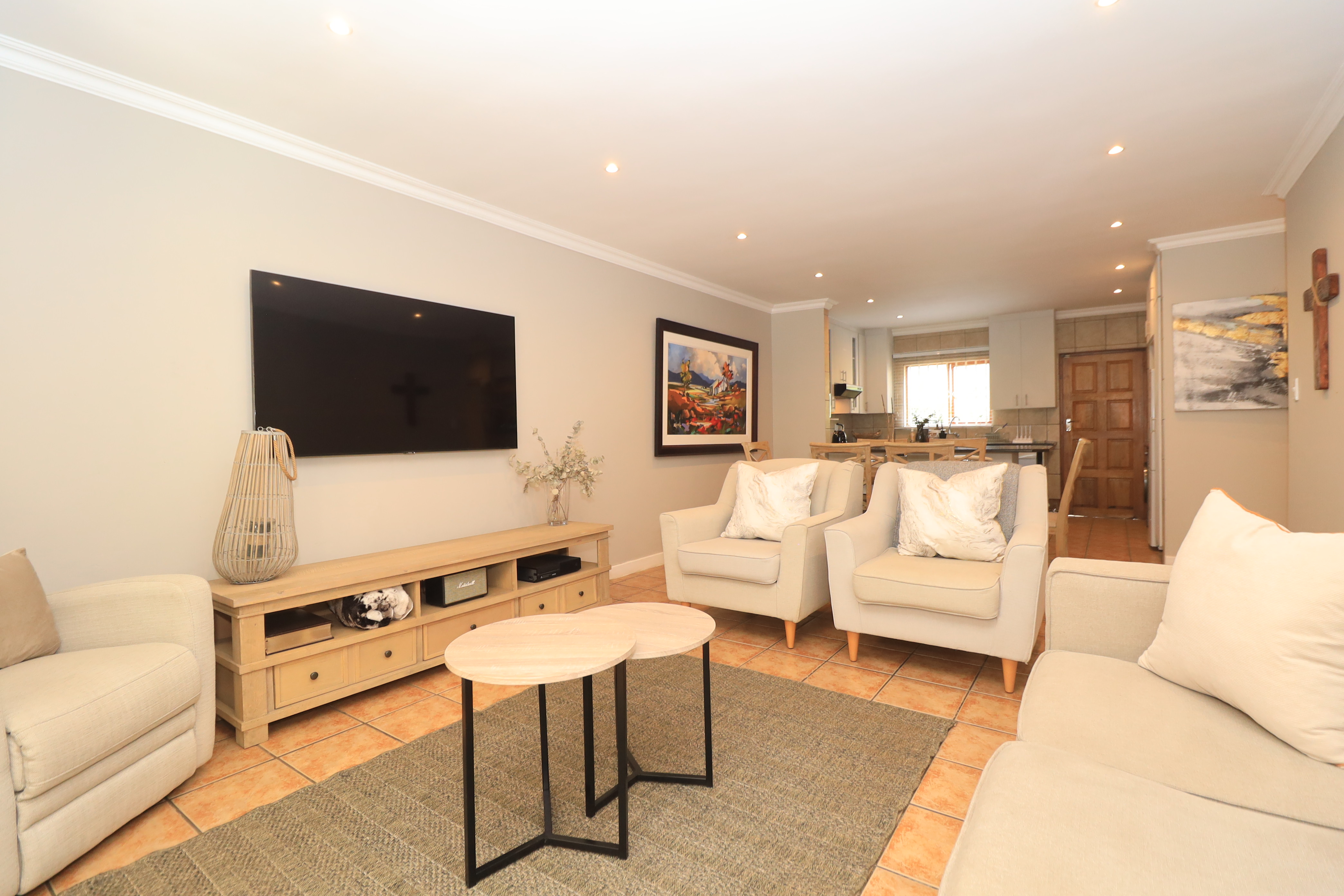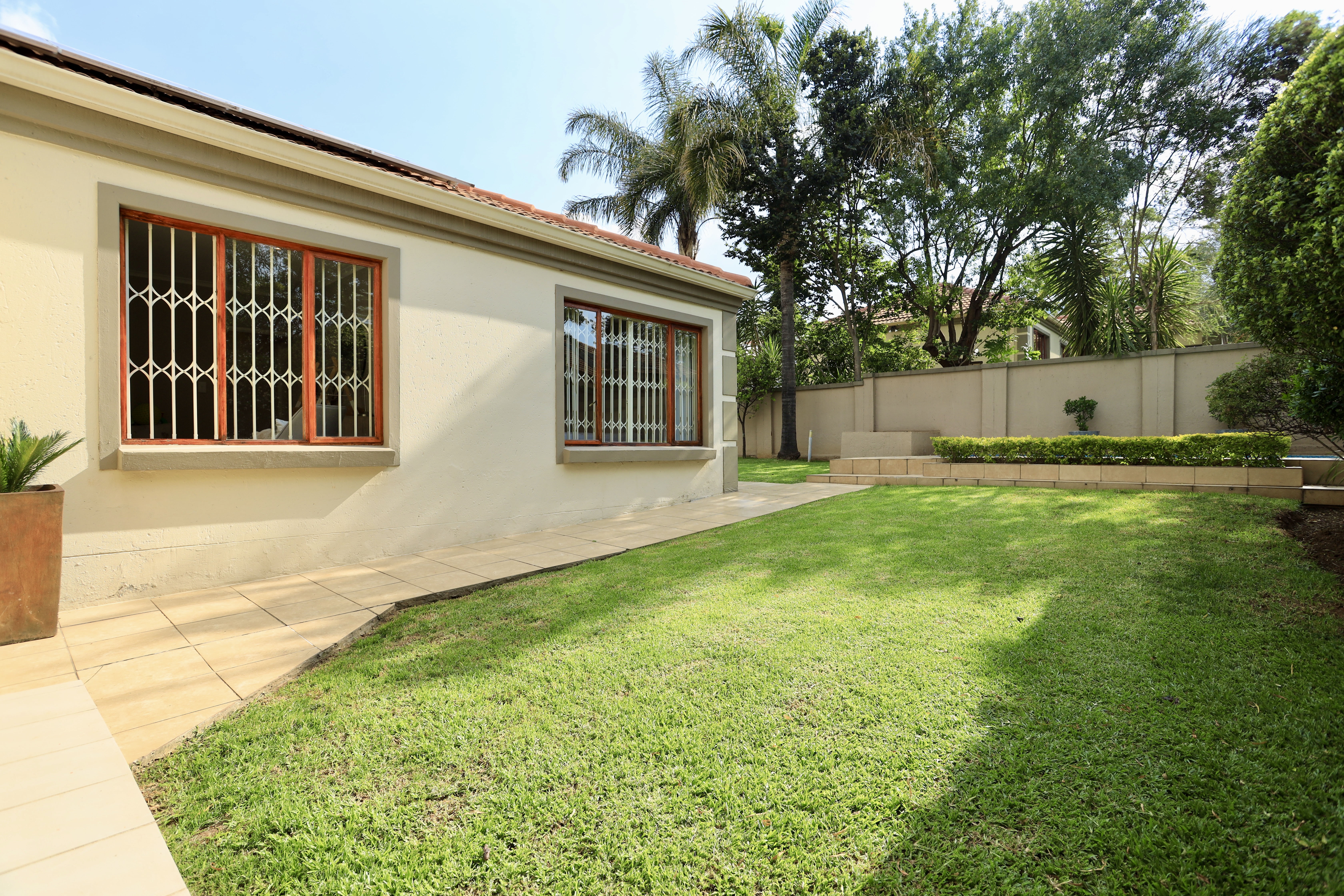 The kitchen seamlessly flows into the dining room and lounge, creating an open-plan living area that fosters connection and togetherness. The lounge, designed for relaxation, leads directly out to a delightful patio, perfect for alfresco dining or simply unwinding after a long day. The patio features a built-in braai, making it the ultimate spot for weekend barbecues, and overlooks a lush landscaped garden that provides a picturesque backdrop for both play and leisure.