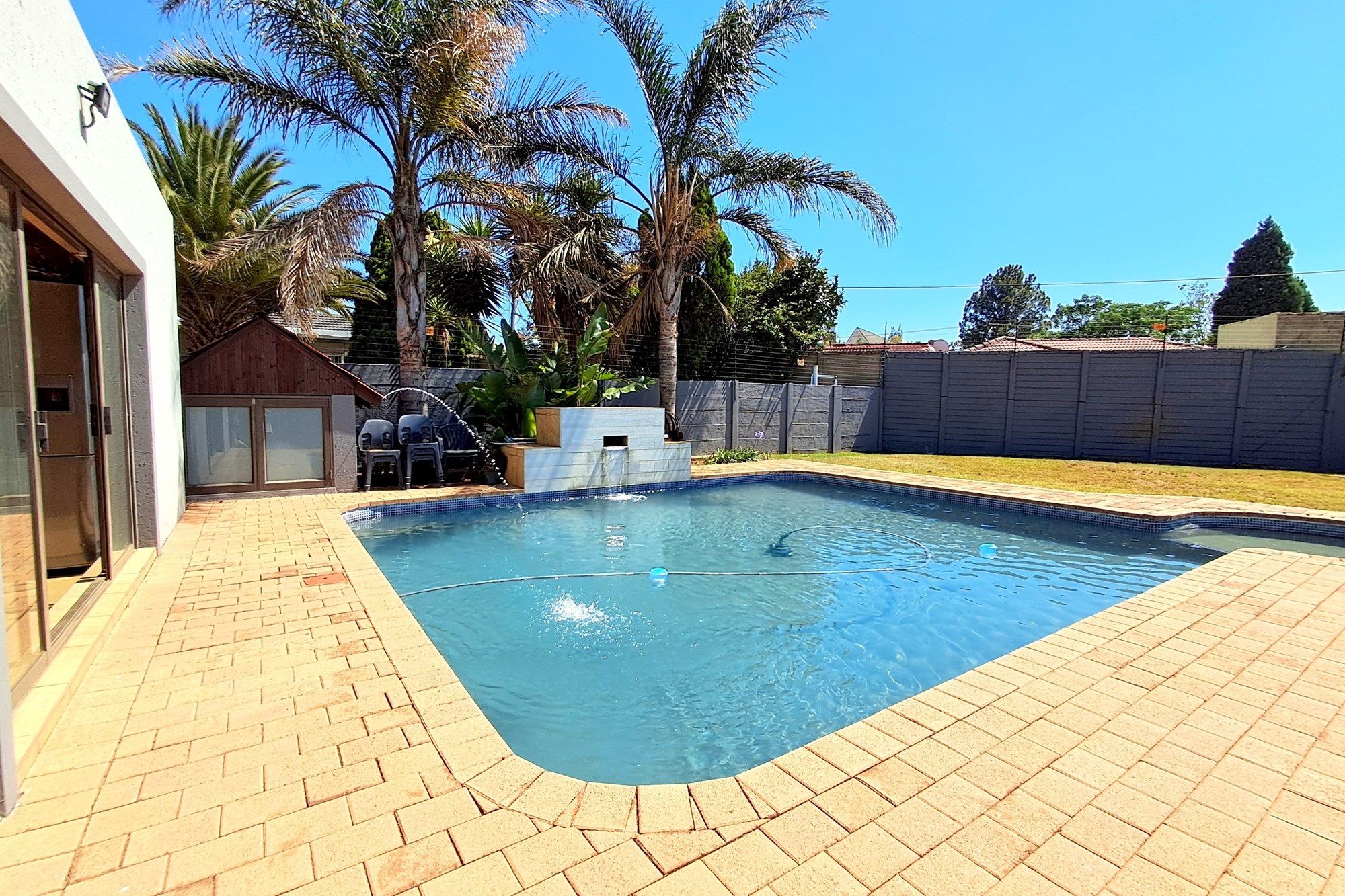 Outside the back door is the most amazing back garden. A paved pathway leads you down. To the left is a large entertainment room and pub, with doors opening out to a view of the swimming pool. Tons of lawn for children to play. On the right is a store room, a bathroom with shower, toilet and basin that is there for the entertainment area or the room currently being used as an office which could easily become a cottage.