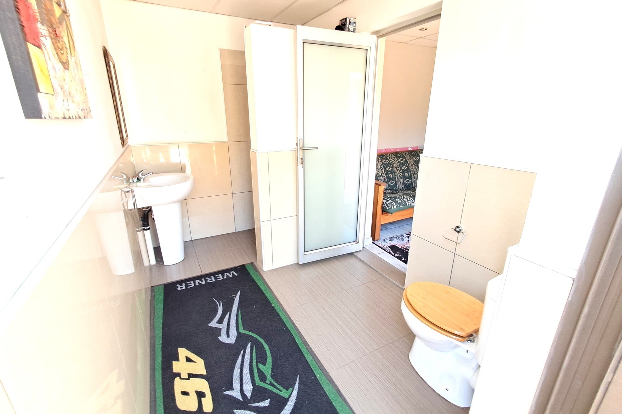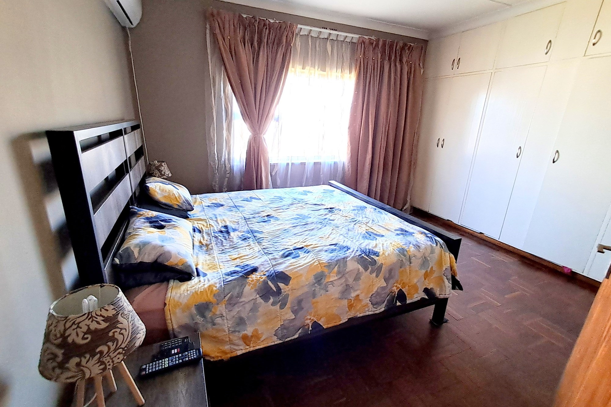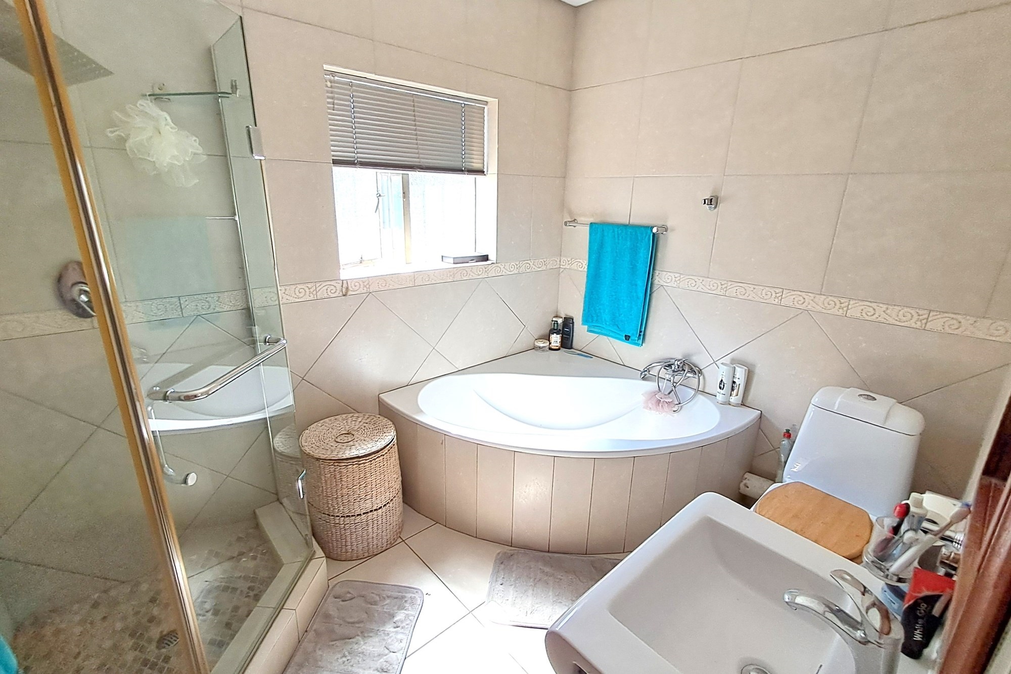 On the left of the house is the spacious main bedroom and two smaller bedrooms. All the bedrooms have wooden parkay flooring and plenty of built-in cupboards. The family bathroom is newly renovated with floor to ceiling tiles, a corner bath and a glass enclosed shower, basin and toilet. Neutral tiles with white porcelain.