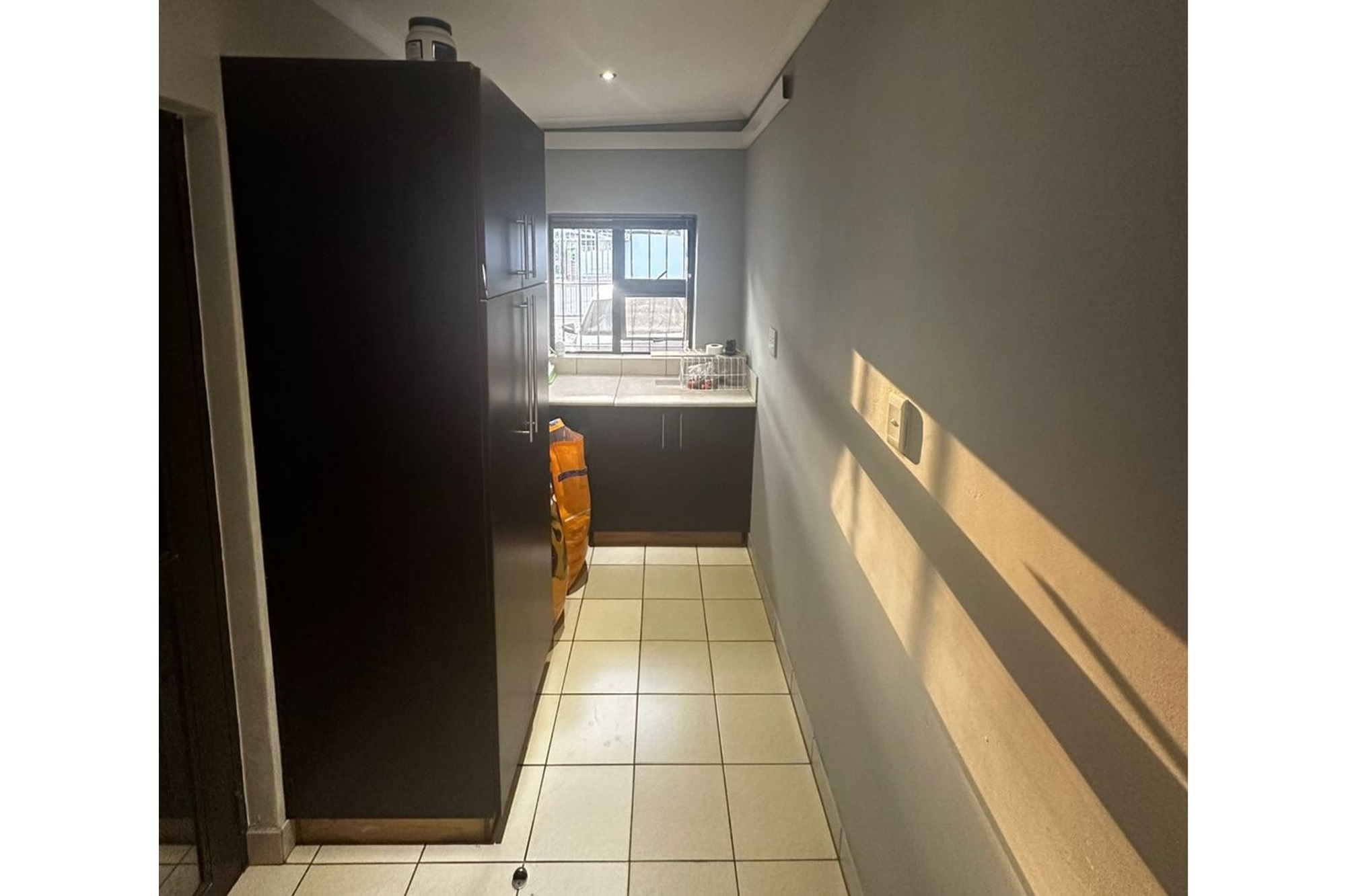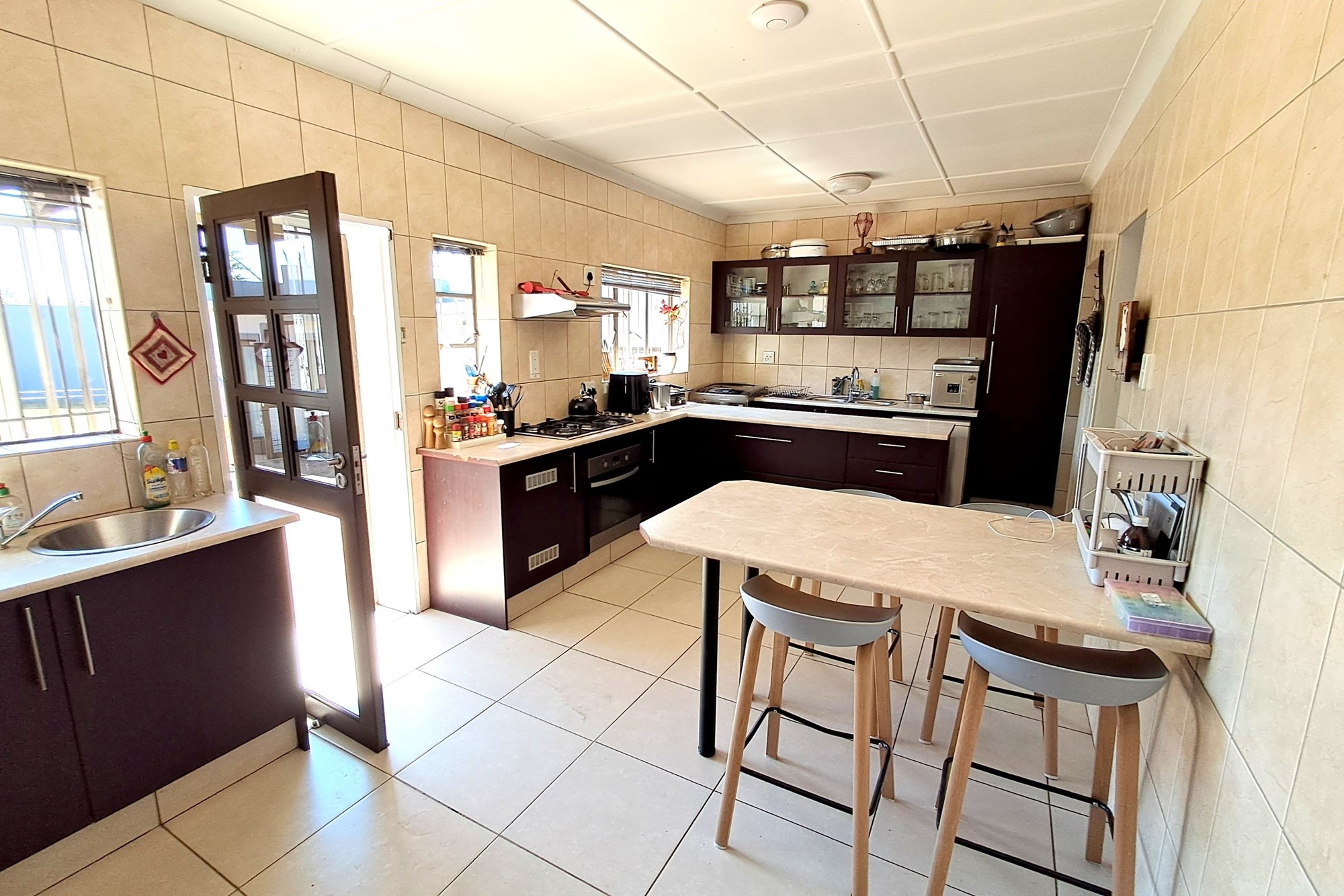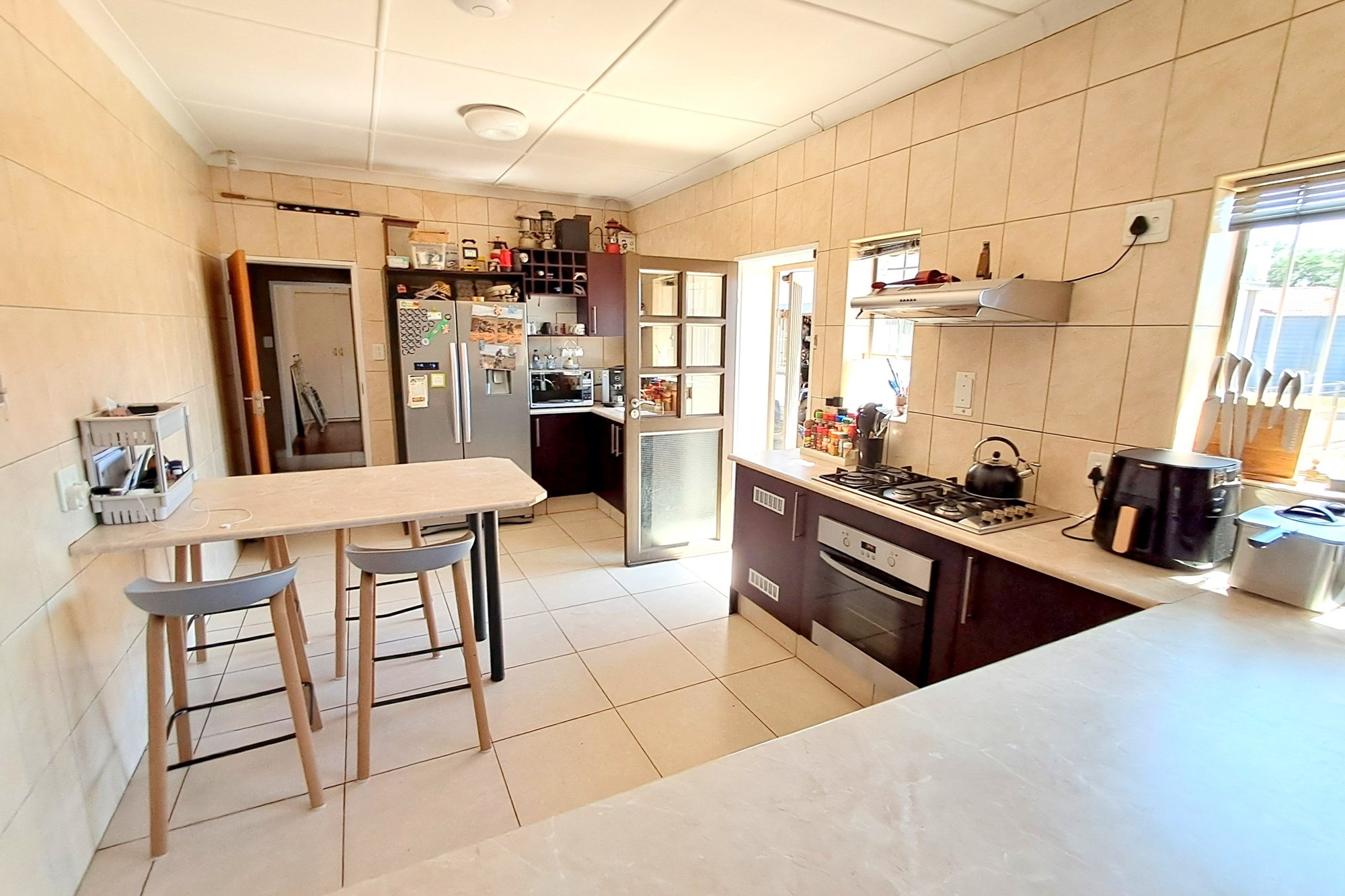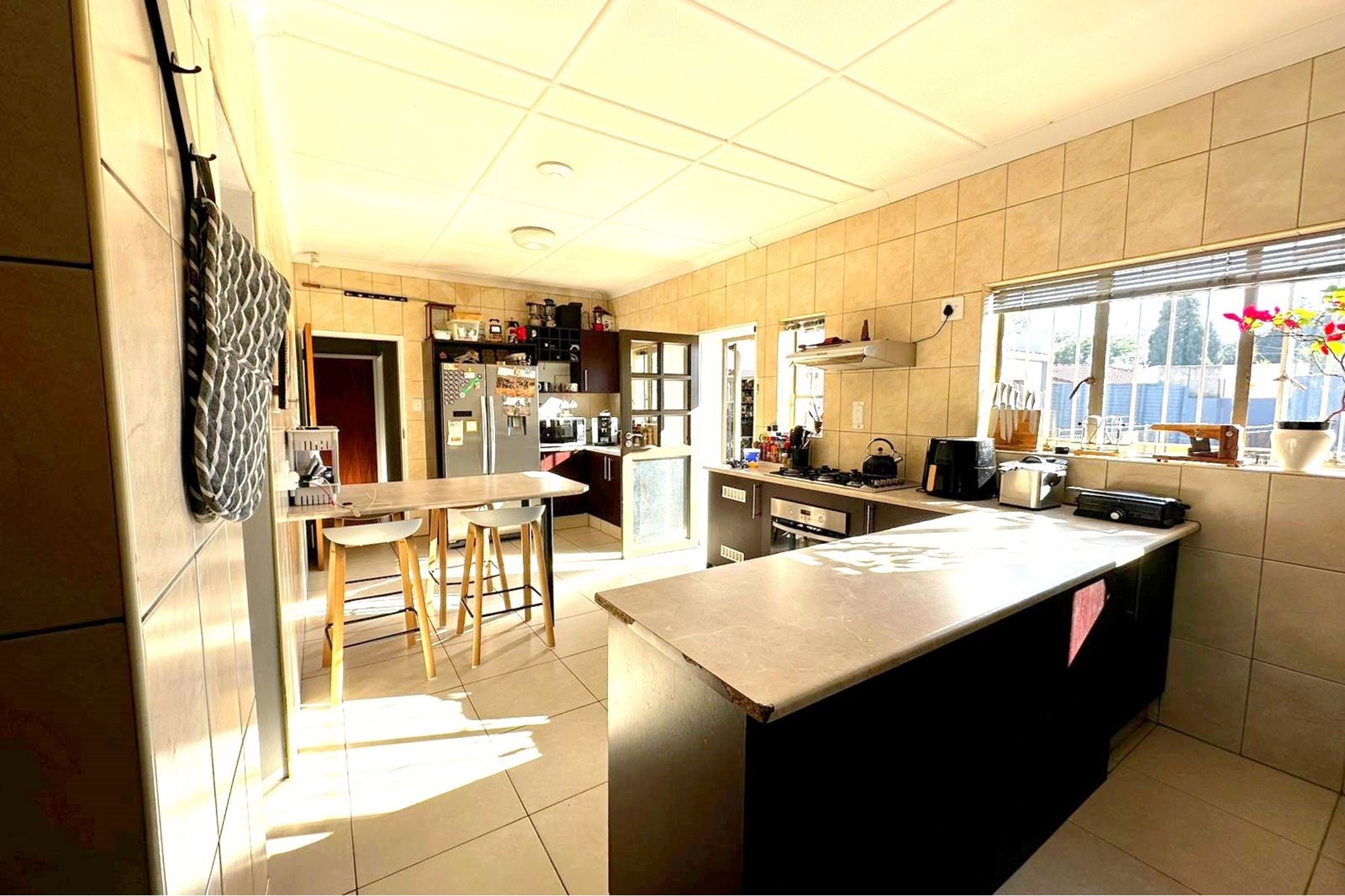The kitchen would suit any master chef in the family, with white counter tops and dark mahogany cabinetry. A breakfast counter as well as a large prep counter provide plenty of space for family meals. A large 5 burner gas hob and electric oven take centre stage. Space for the double door fridge, a neat scullery/laundry area and a totally separate room as a pantry with floor to ceiling cupboards. The pantry leads straight out to the inside of the garage, perfect for dropping off the groceries.