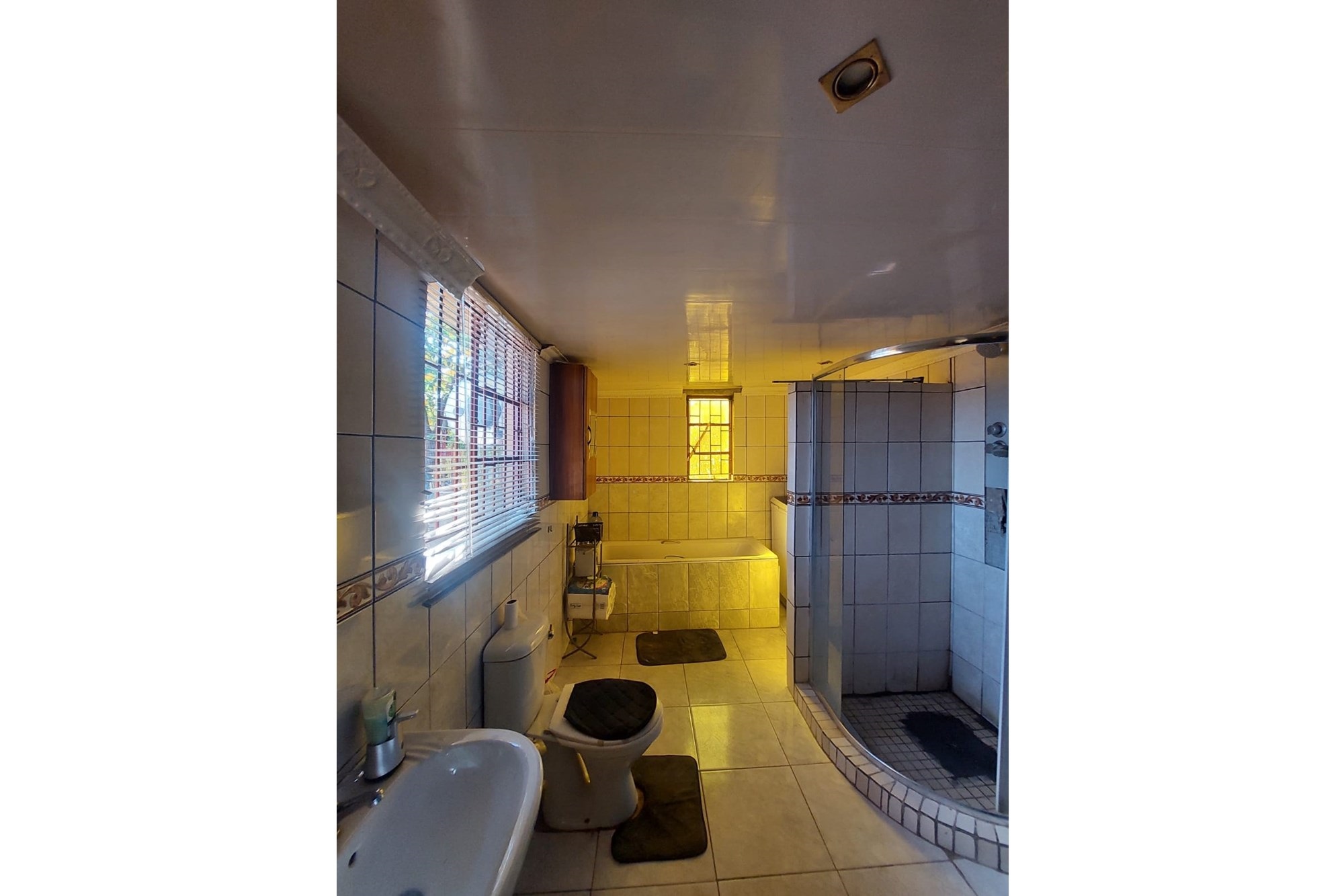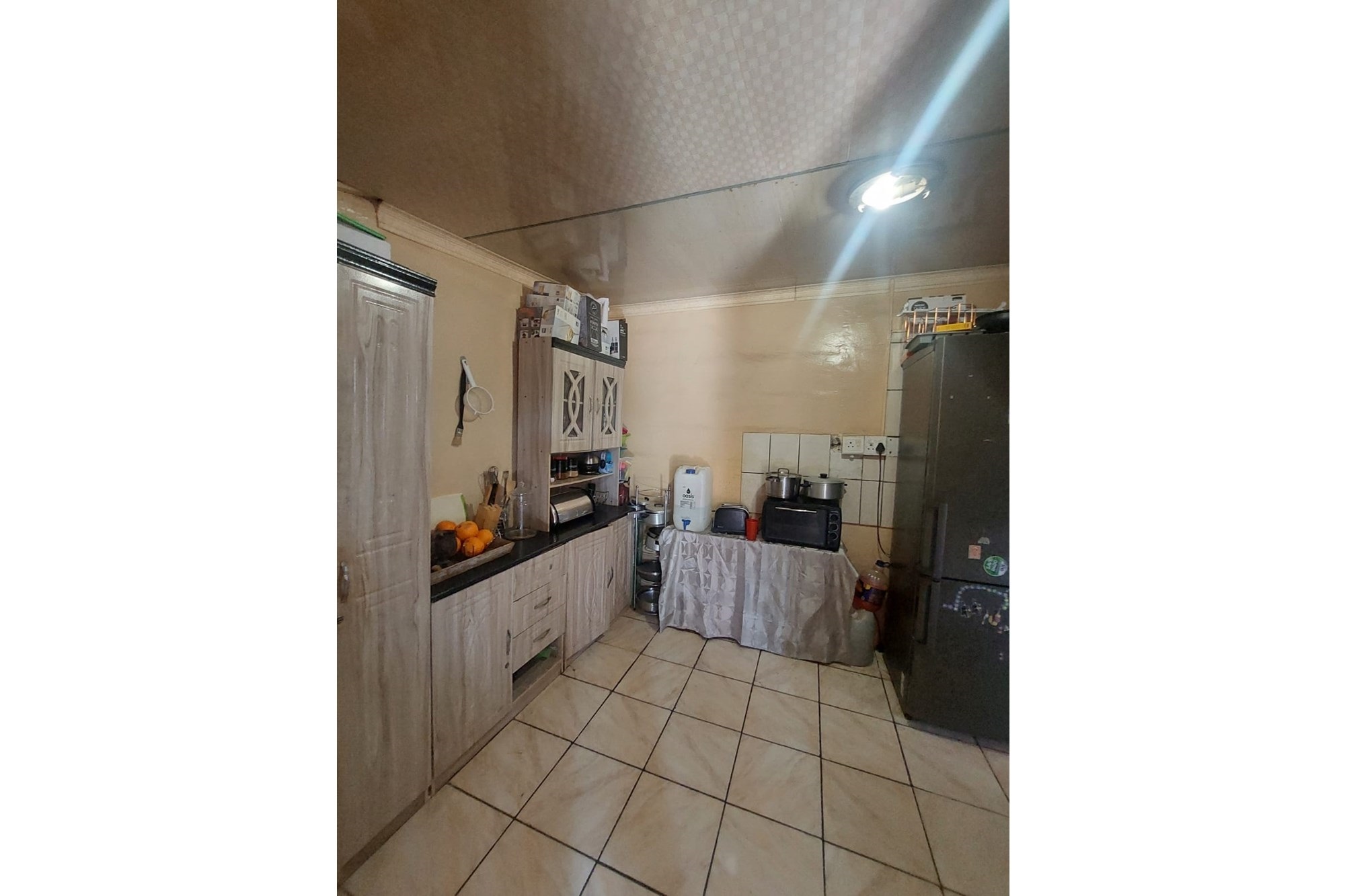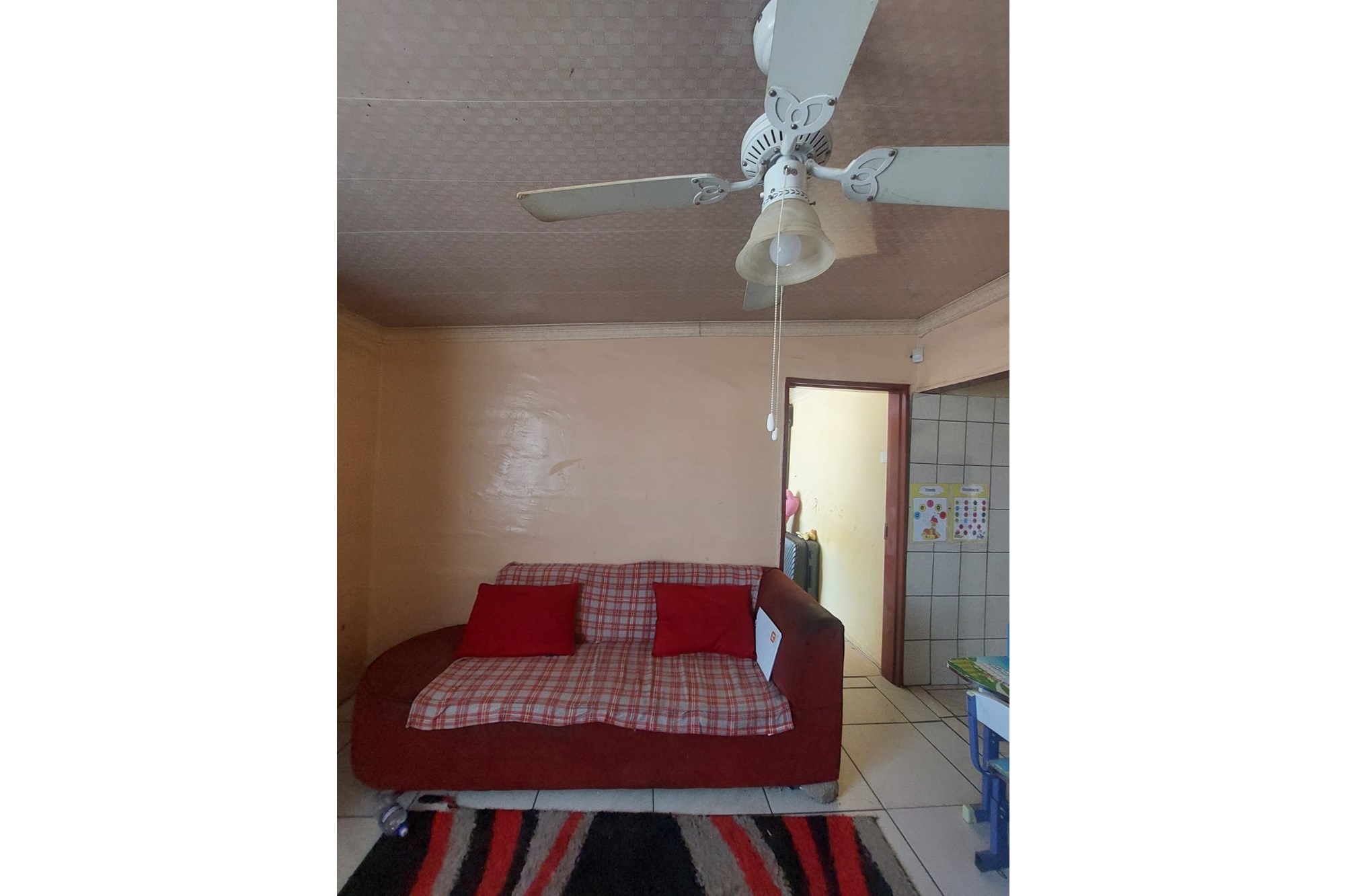 The lounge, equipped with a ceiling fan, offers a welcoming space to relax, while the tiled kitchen with built-in cupboards provides a functional and modern area for meal preparation.