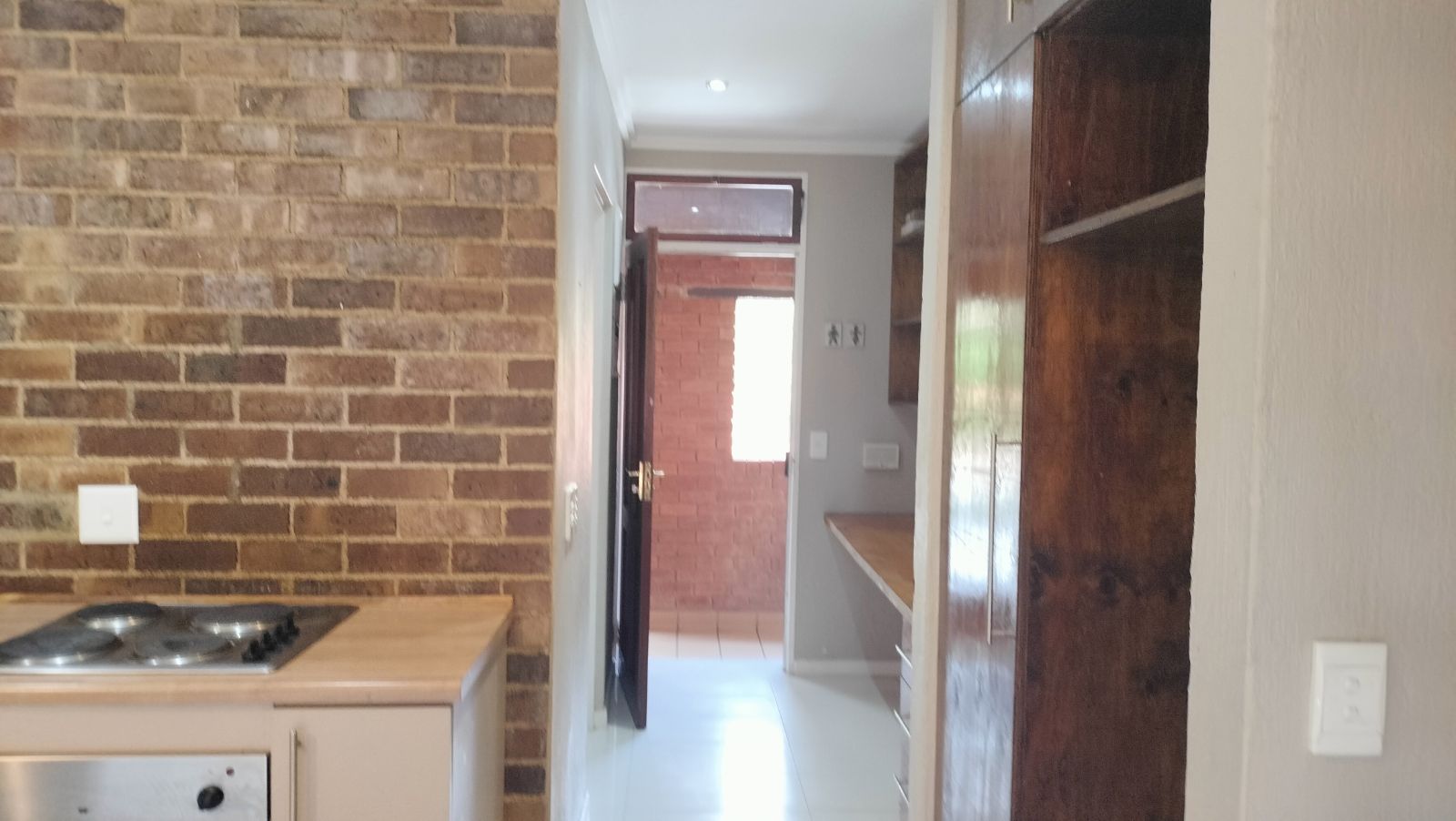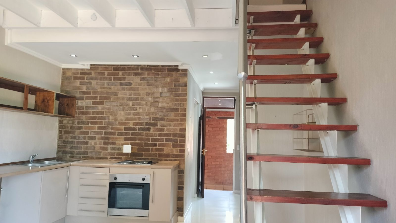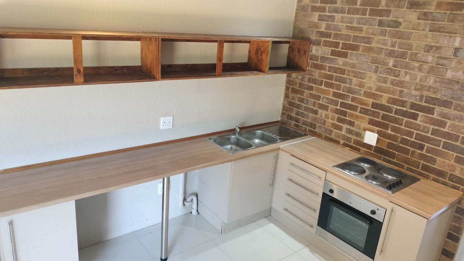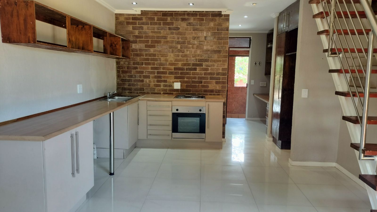Downstairs, the open-plan living area is designed for functionality and style. The entrance area includes built-in shelves and a desk, ideal for use as a study or workspace. The kitchen boasts a modern face brick feature wall, built-in cupboards, and space for two under-counter appliances as well as a double-door fridge.