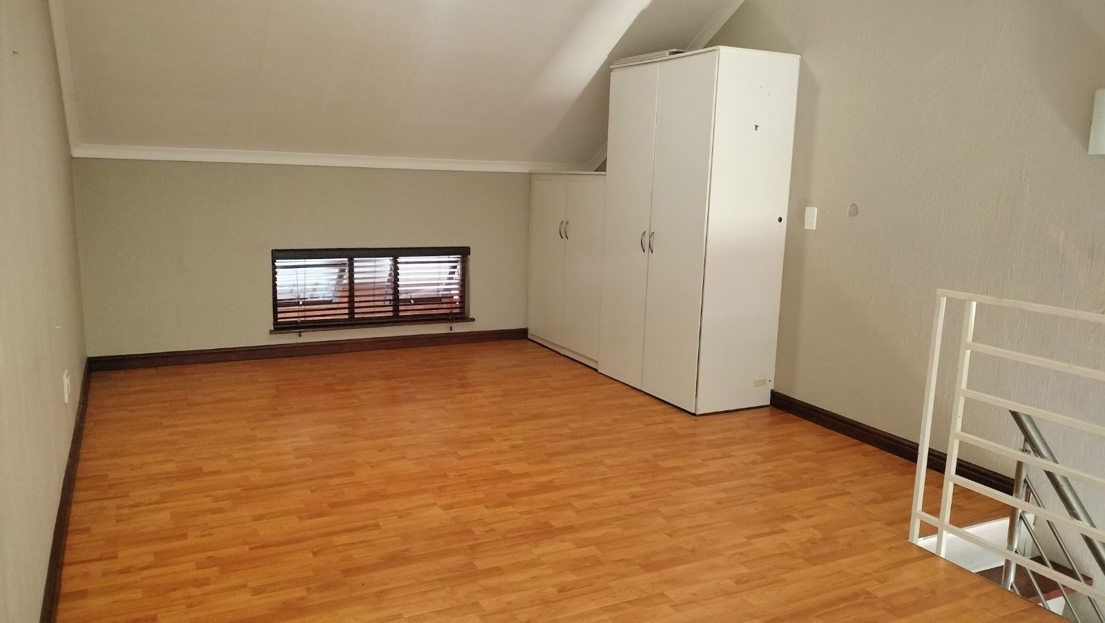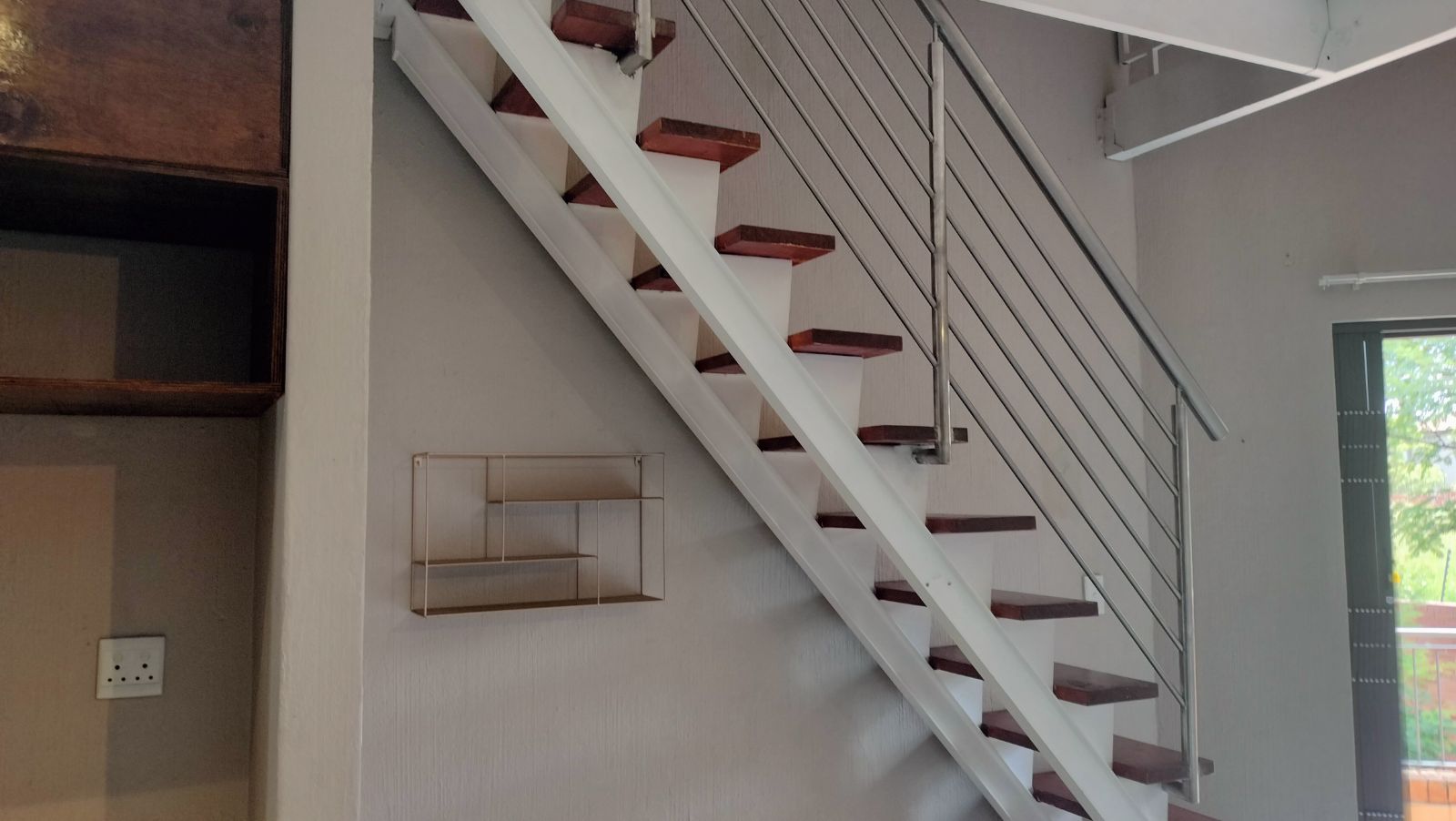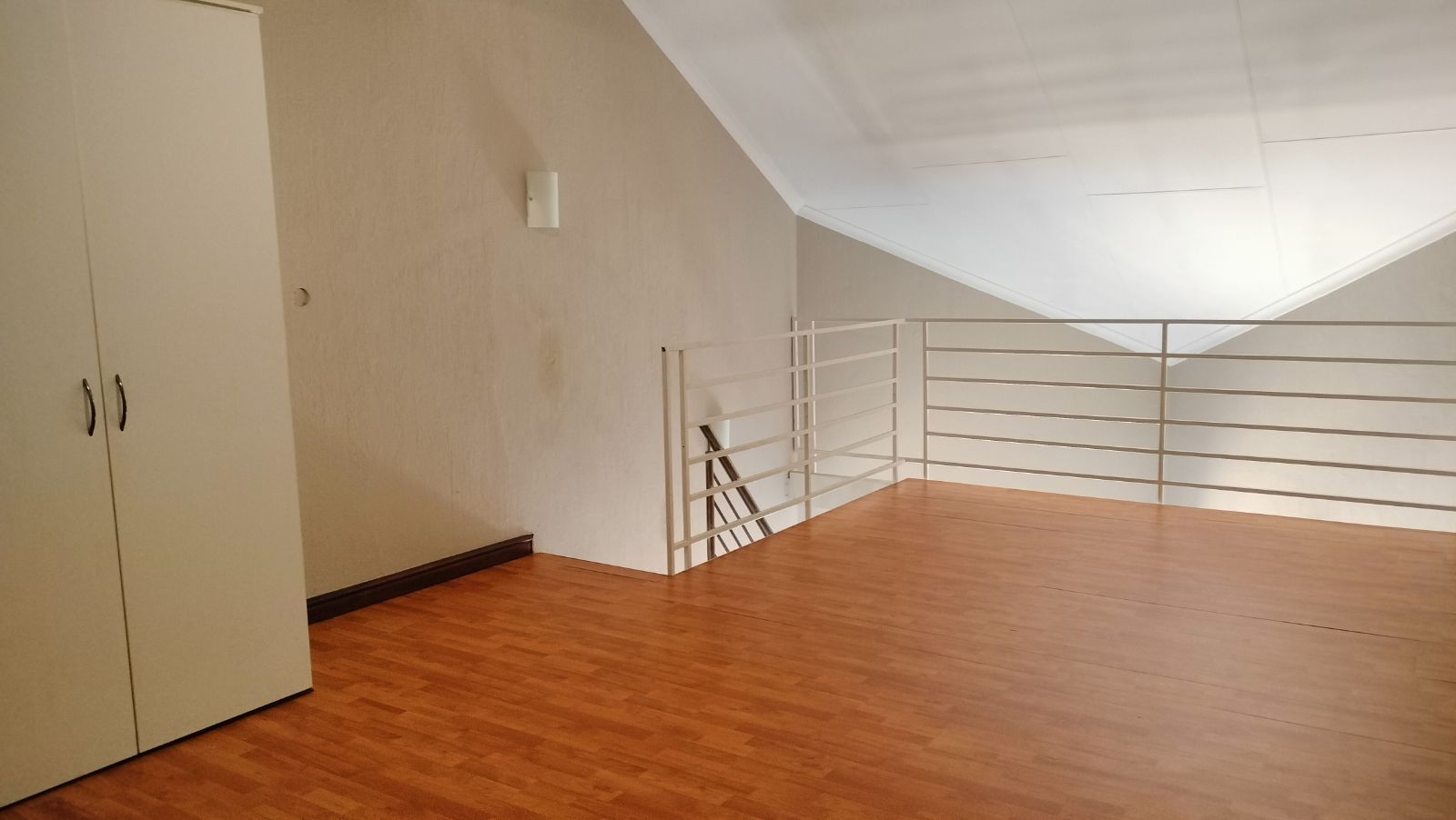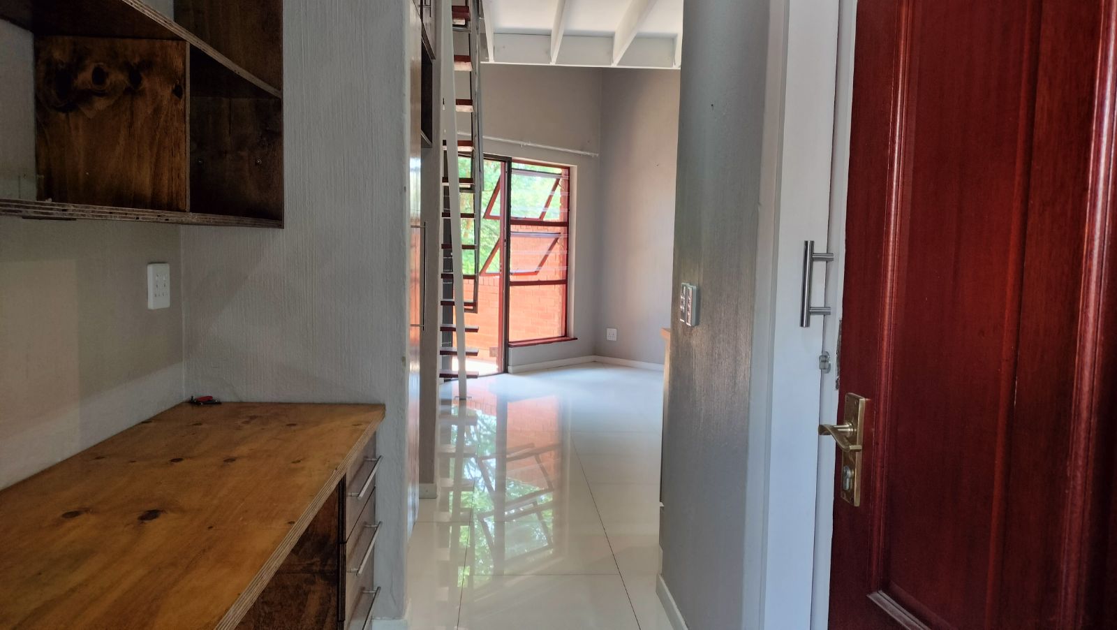 Downstairs, the open-plan living area is designed for functionality and style. The entrance area includes built-in shelves and a desk, ideal for use as a study or workspace. The kitchen boasts a modern face brick feature wall, built-in cupboards, and space for two under-counter appliances as well as a double-door fridge.