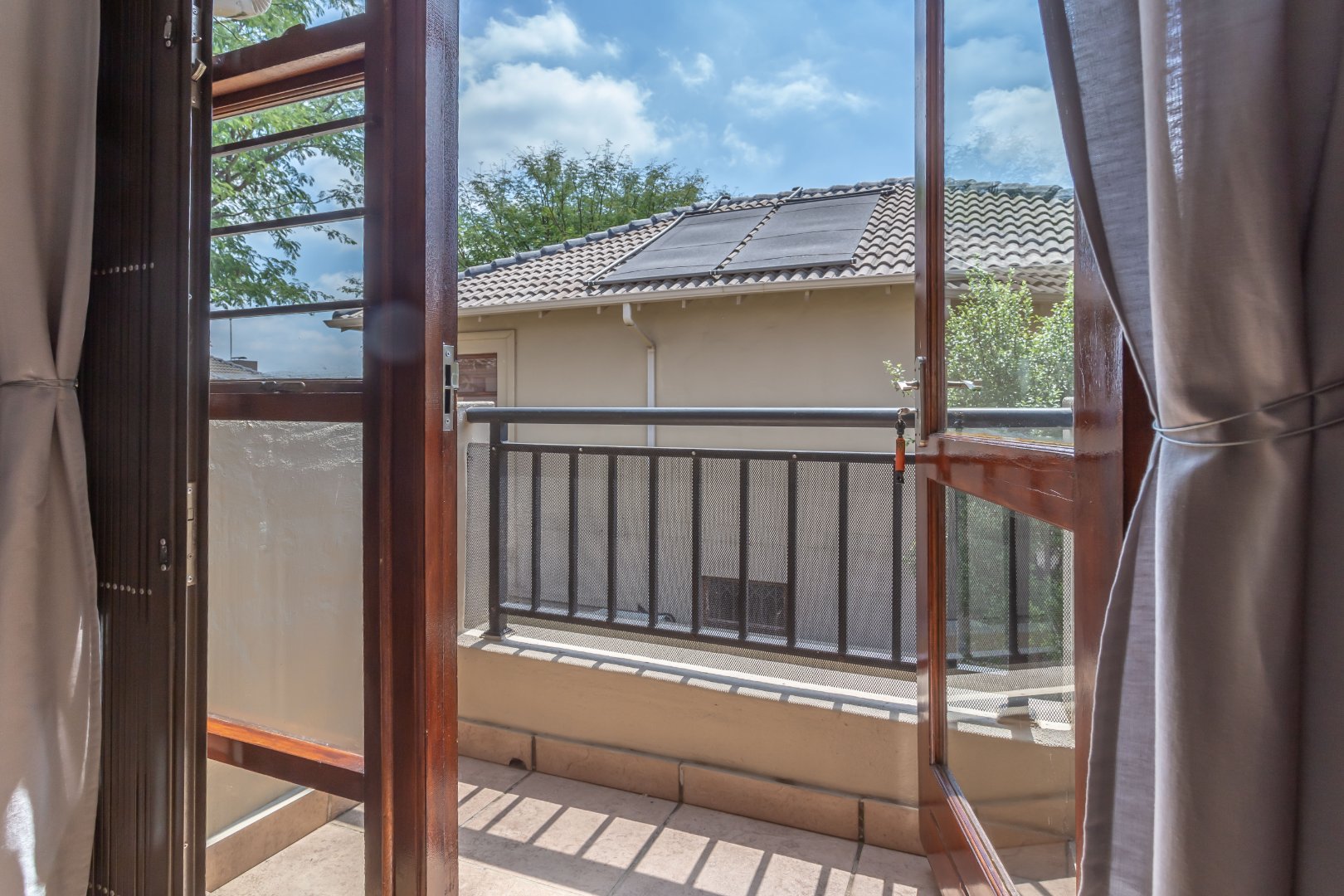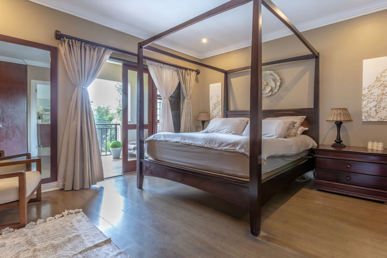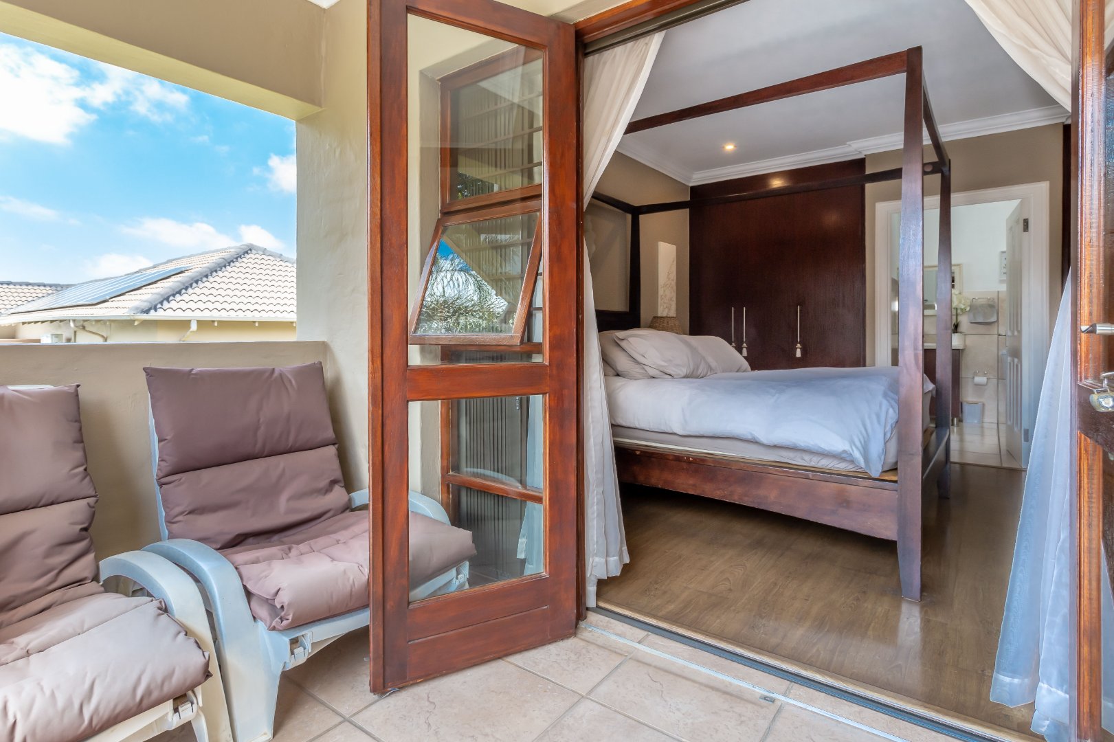 The main bedroom enjoys its own private patio, as does one of the additional bedrooms, offering tranquil spaces to relax. The third bedroom has been thoughtfully converted into a study, ideal for working from home or a quiet retreat.
