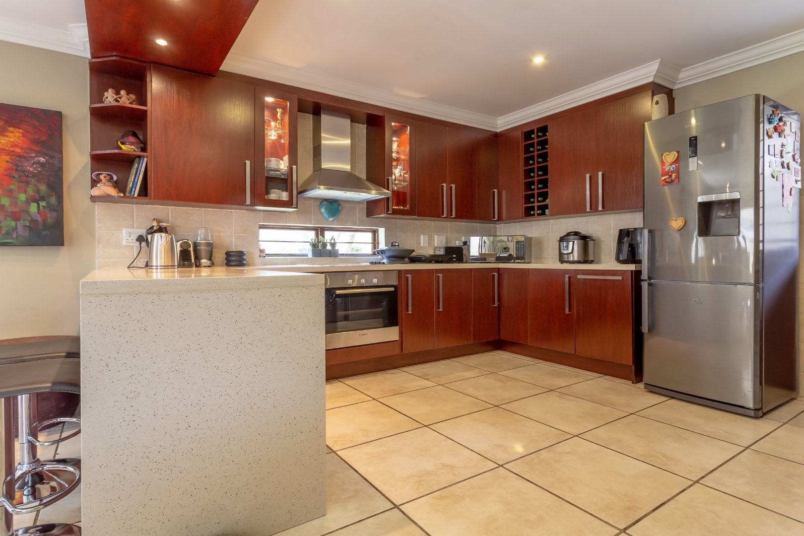 The stylish kitchen boasts Caesarstone countertops that complement the space perfectly and flows seamlessly into the open-plan lounge and dining area, creating an inviting environment for everyday living and entertaining. Sliding doors from both the lounge and dining room open onto a lush, manicured garden, bringing the outdoors in.