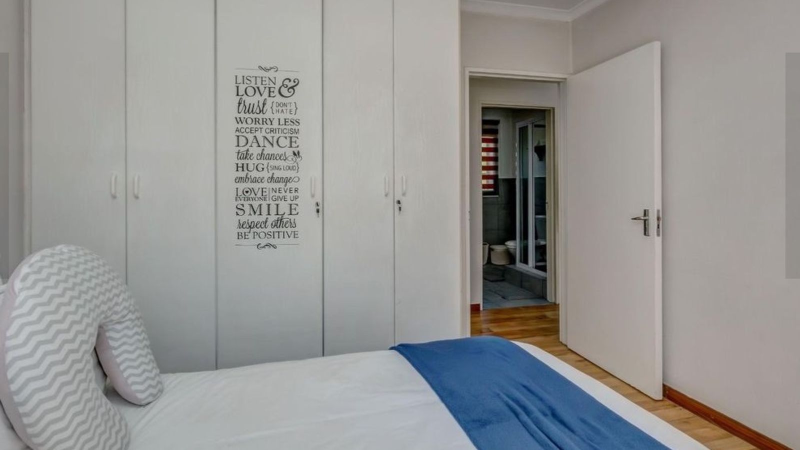 Neatly tiled and wall decorated with nice finishing touches.