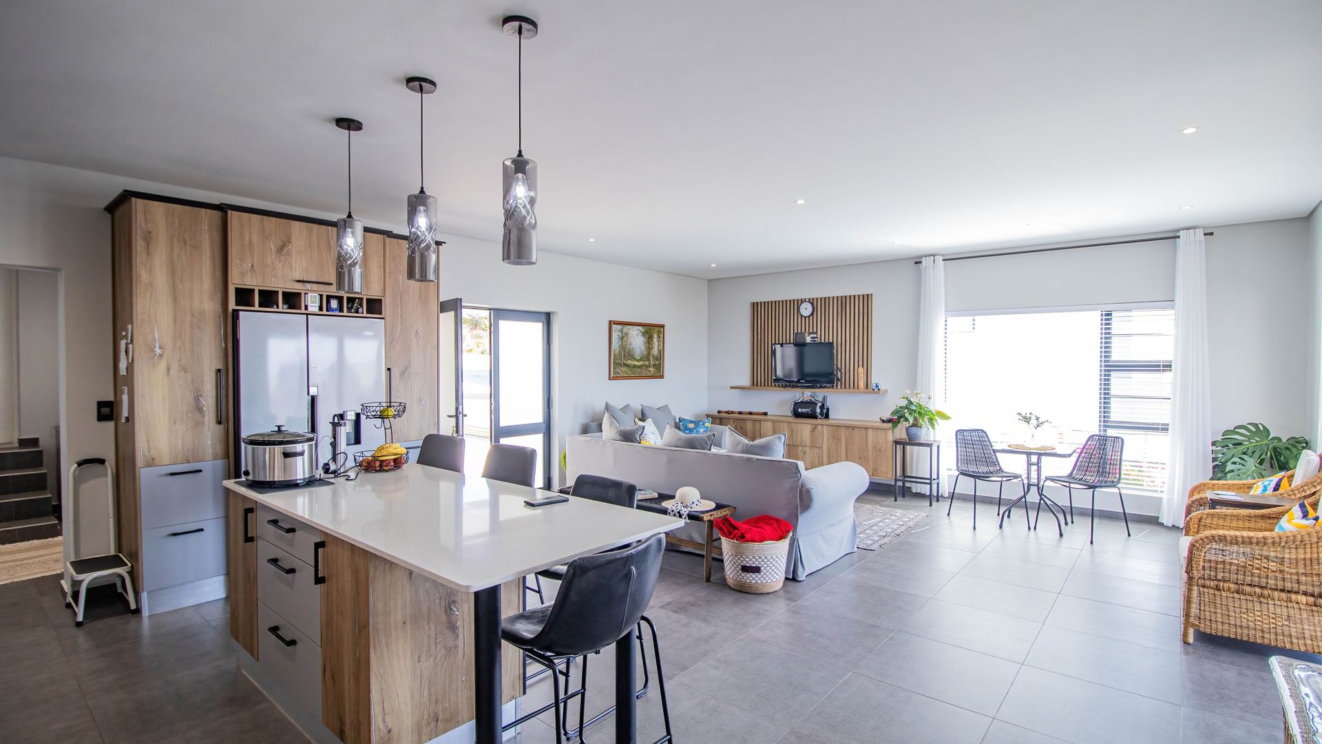 This sun-drenched family haven with its expansive glass walls brings the beauty of the landscape indoors. Don't be alarmed when you notice the occasional Springbuck, Rooibok, mongoose and a variety of bird species casually paying you a visit.
