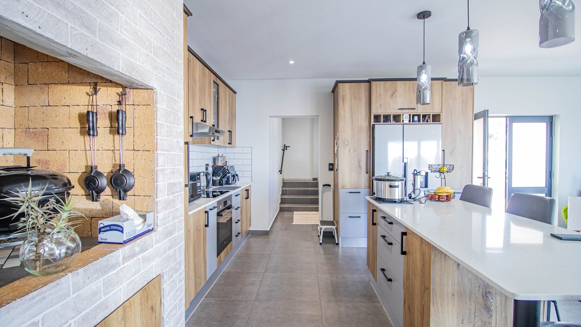 The living area is an entertainers delight providing an open plan lifestyle experience with a functionally designed island come dining area, a neatly tucked away scullery with easy access to the extra large 6m x 7m double garage, fully automated, offering ample storage space and a side door leading out to a shaded carport with space for another vehicle, trailer, boat or caravan. The living area also boasts a well thought-out indoor braai creating a cosy environment where many a story will be told and remembered.