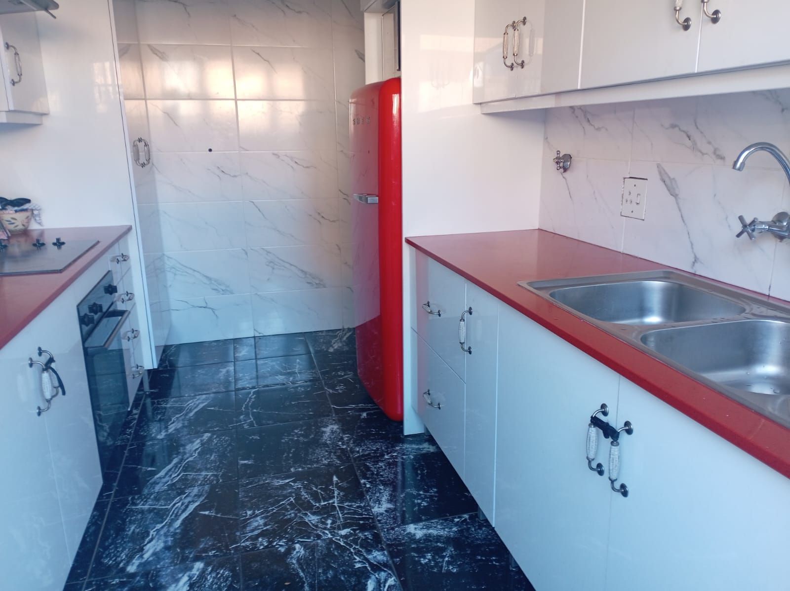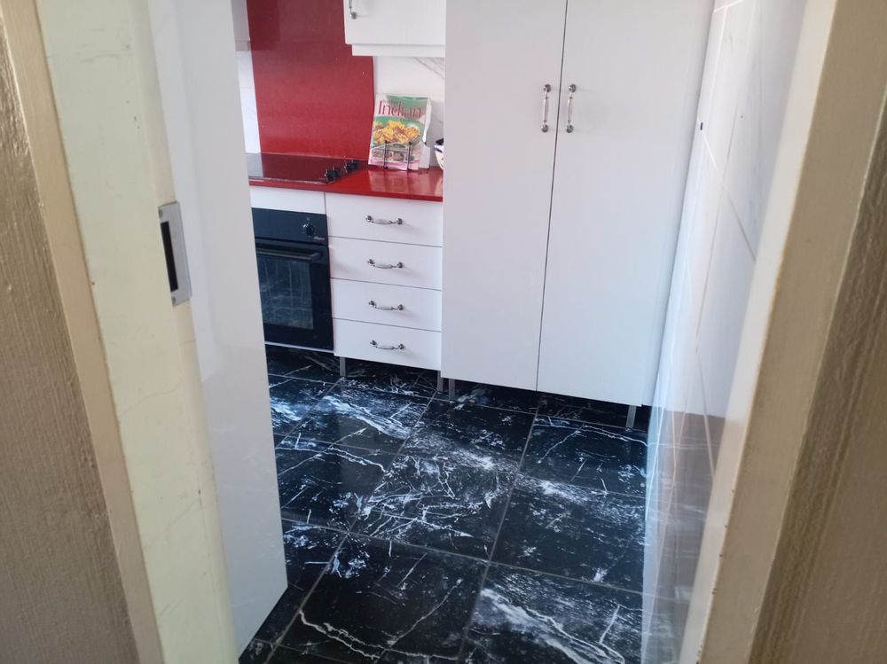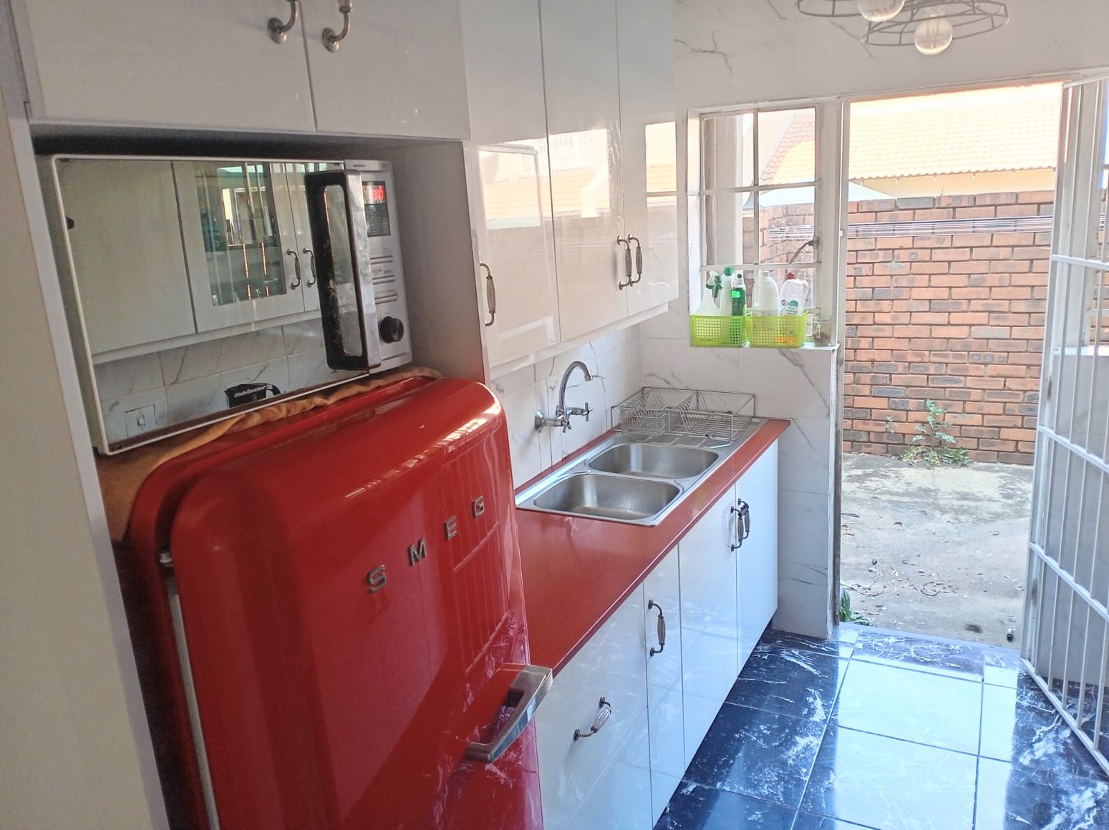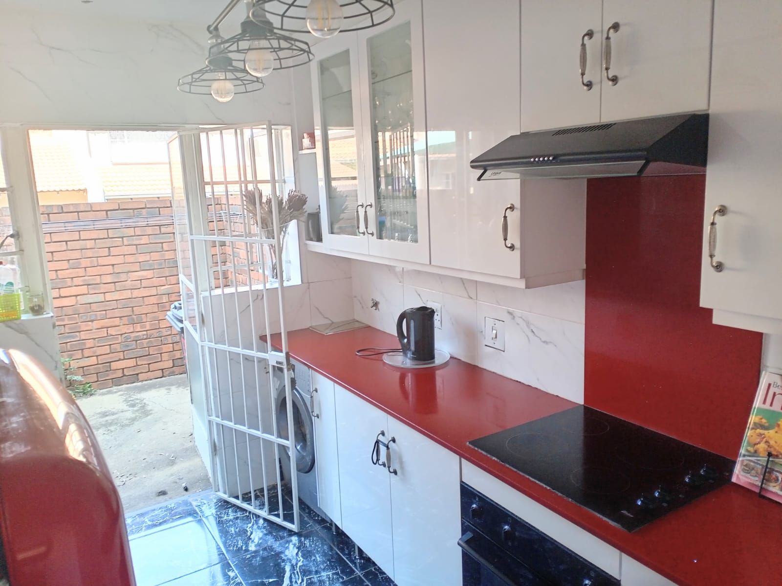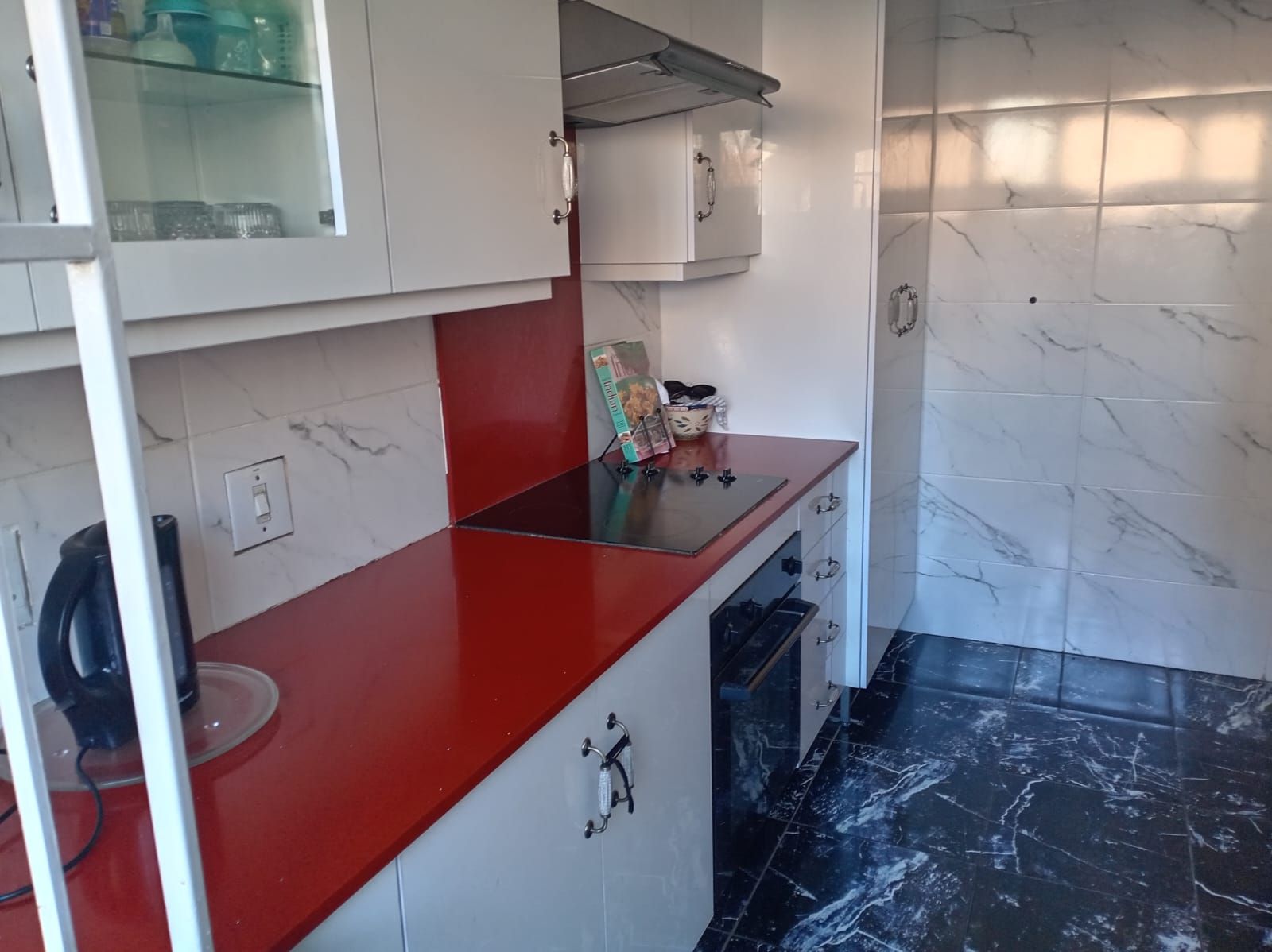 The heart of this home features striking red granite tops, glossy ceramic floor tiles, and a modern glass-top stove. A door opens to a private back courtyard — perfect for a quiet morning coffee or evening breeze.
