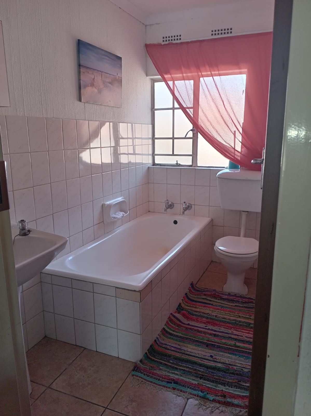 Second Bathroom: Fully tiled with bath, basin, and toilet.