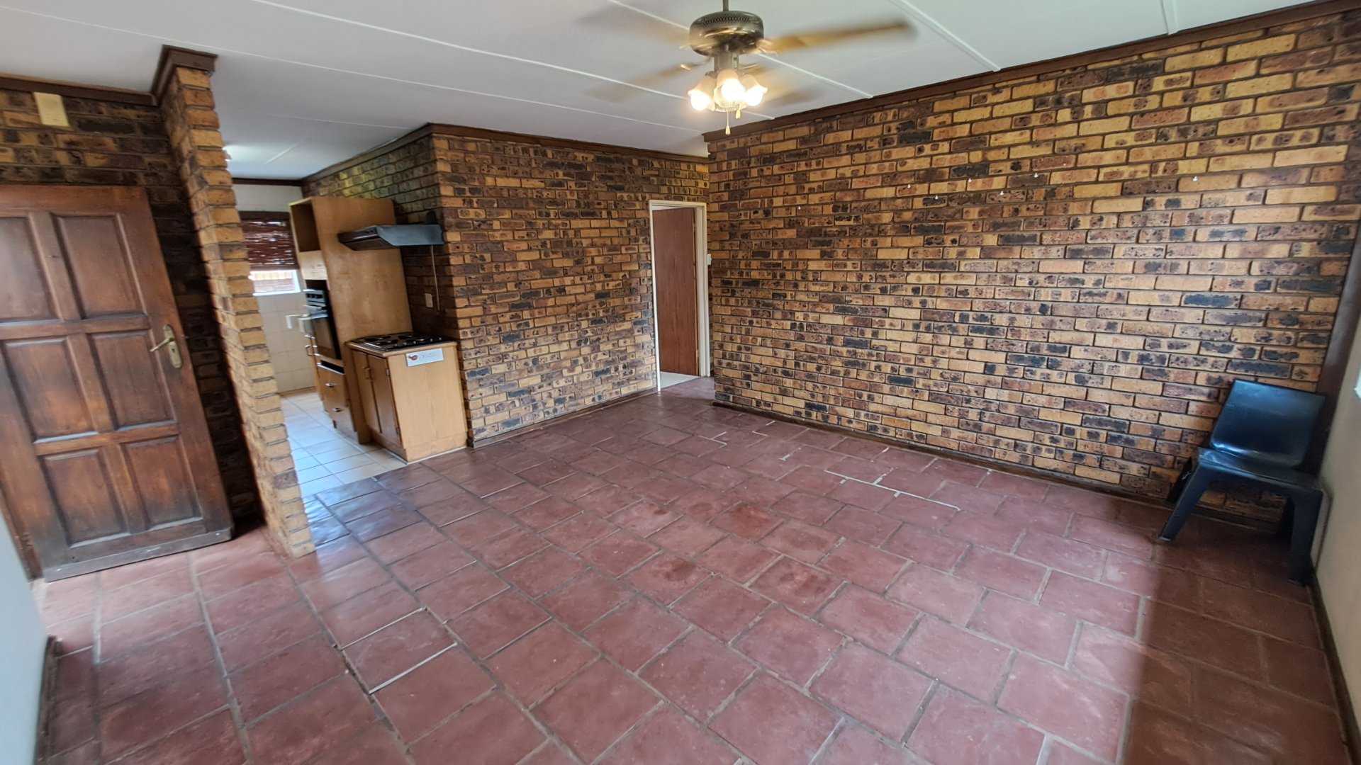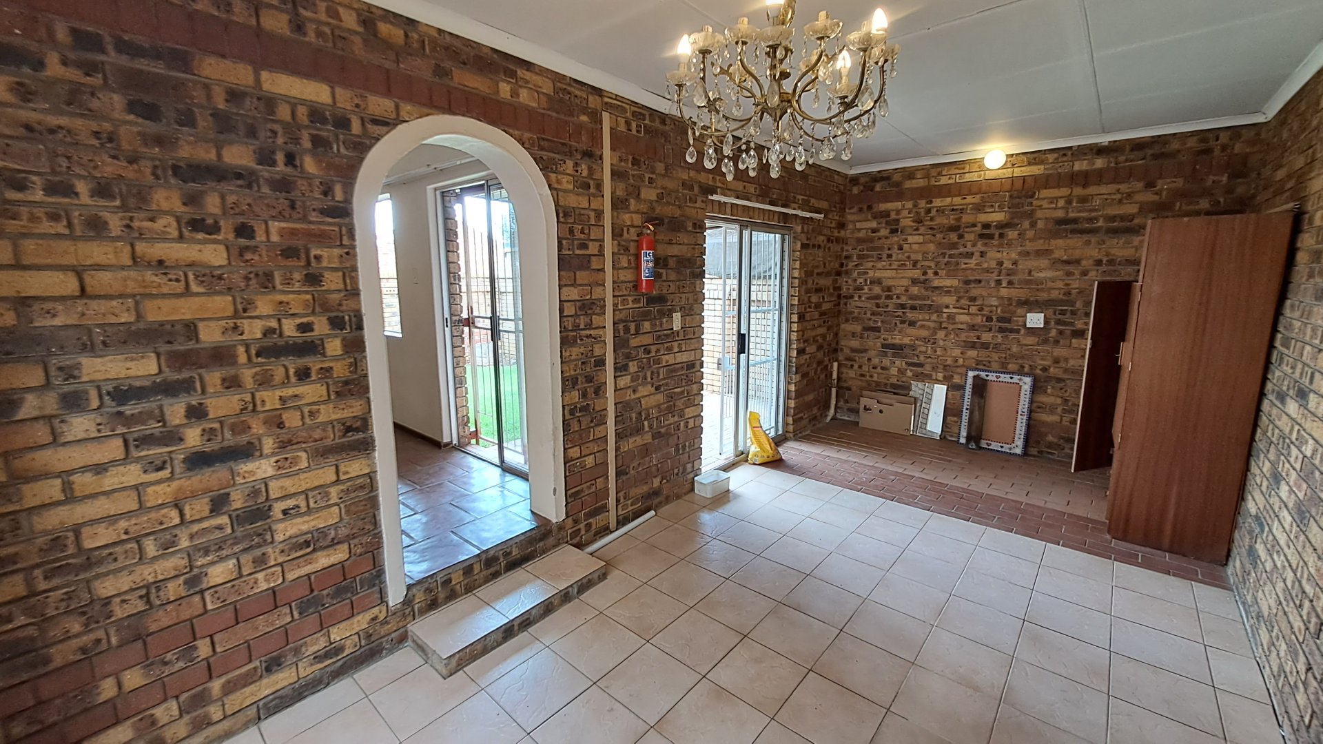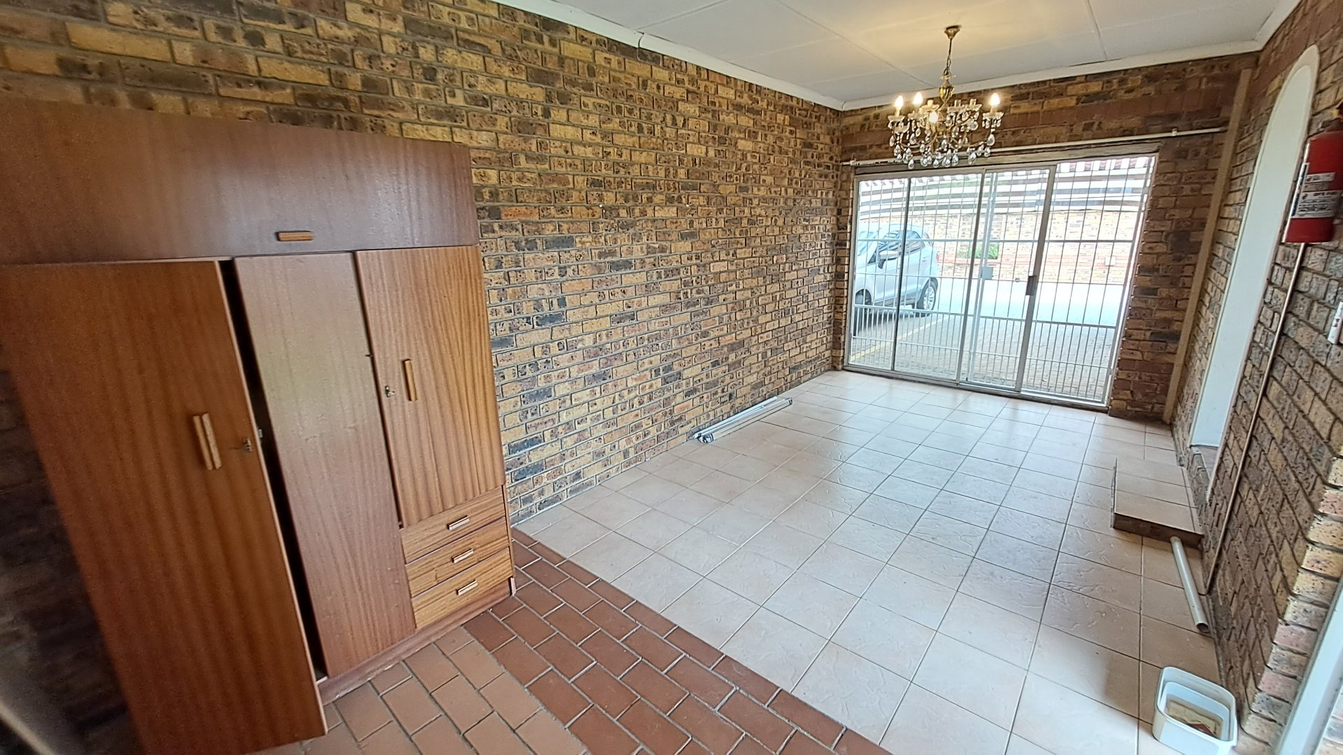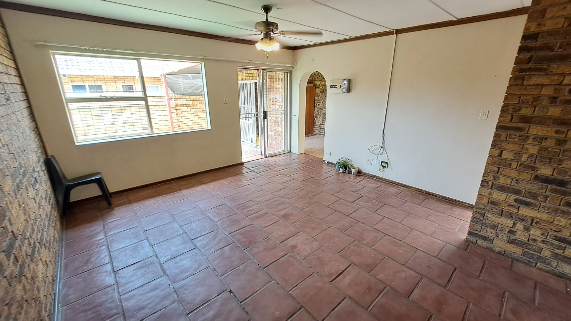 -Spacious living room with tiled floors and facebrick walls, with a security gate leading to the outside area