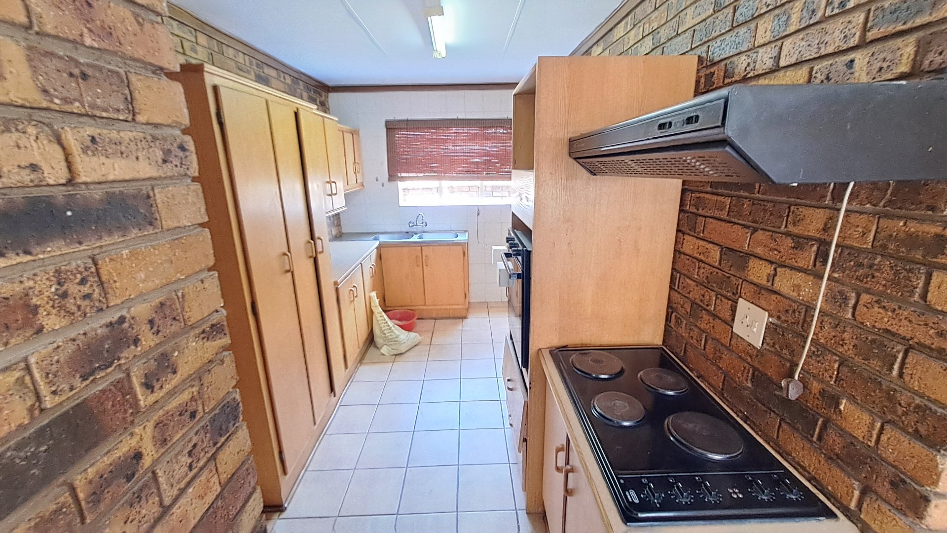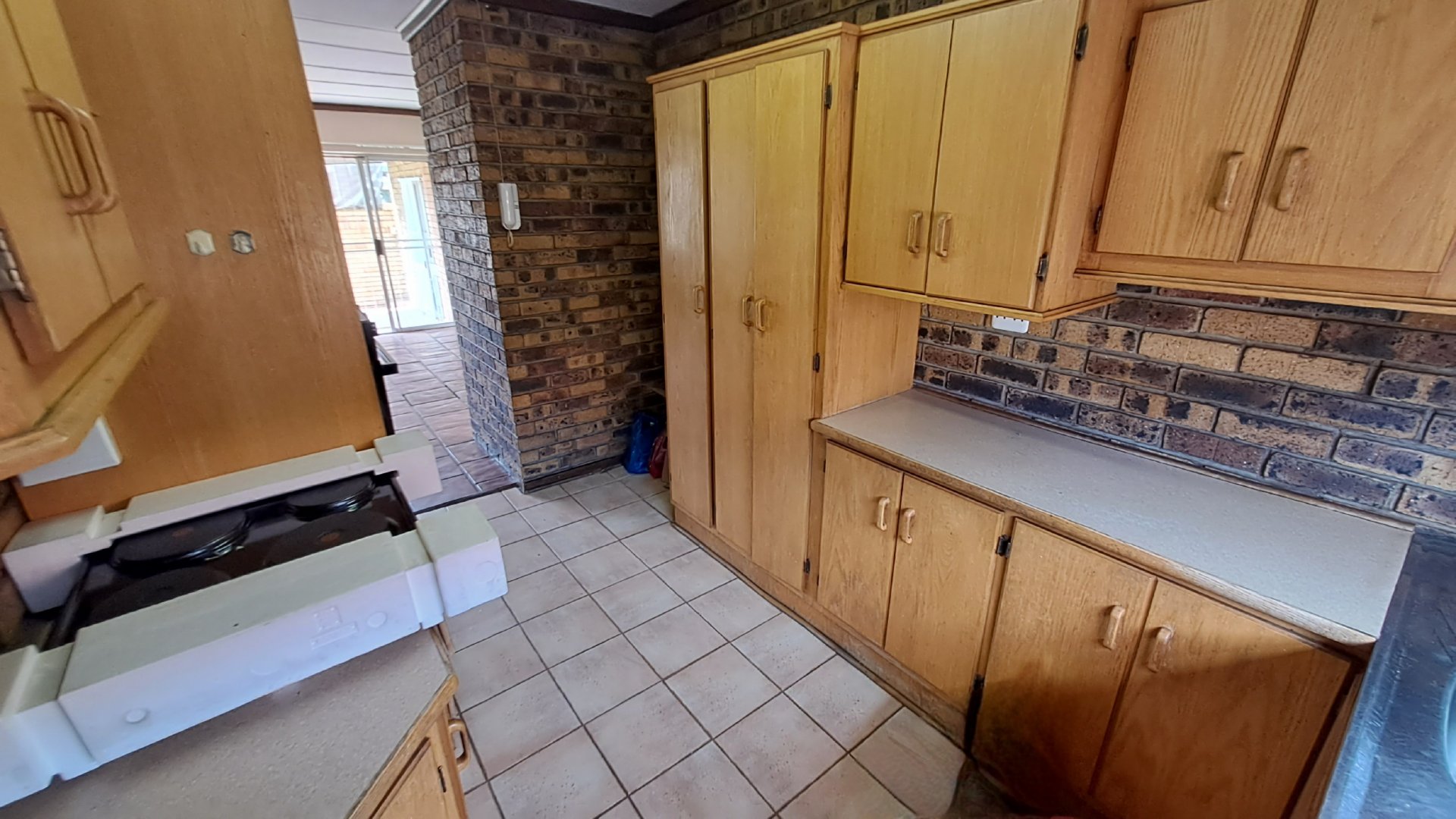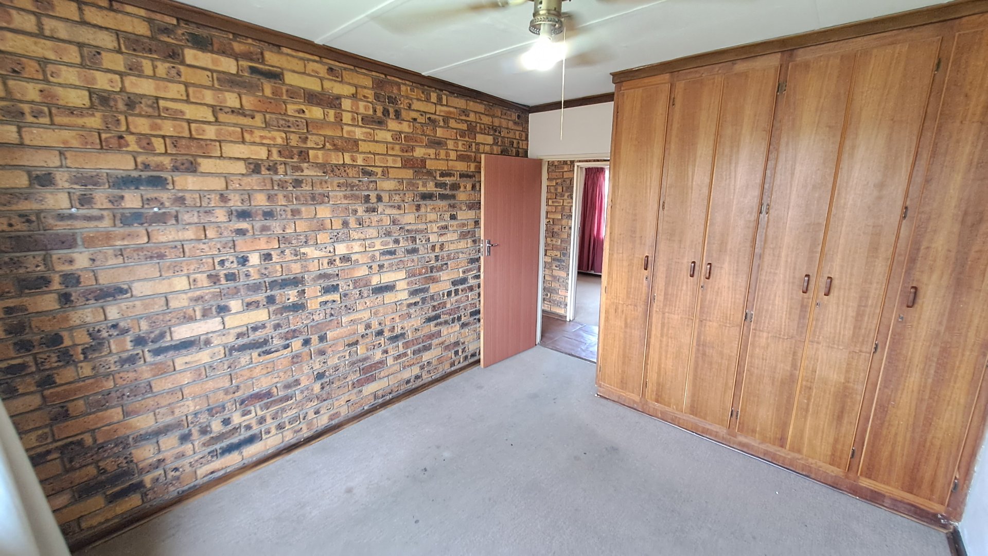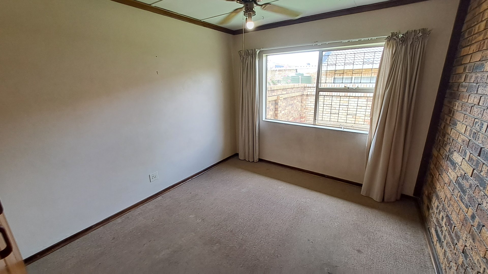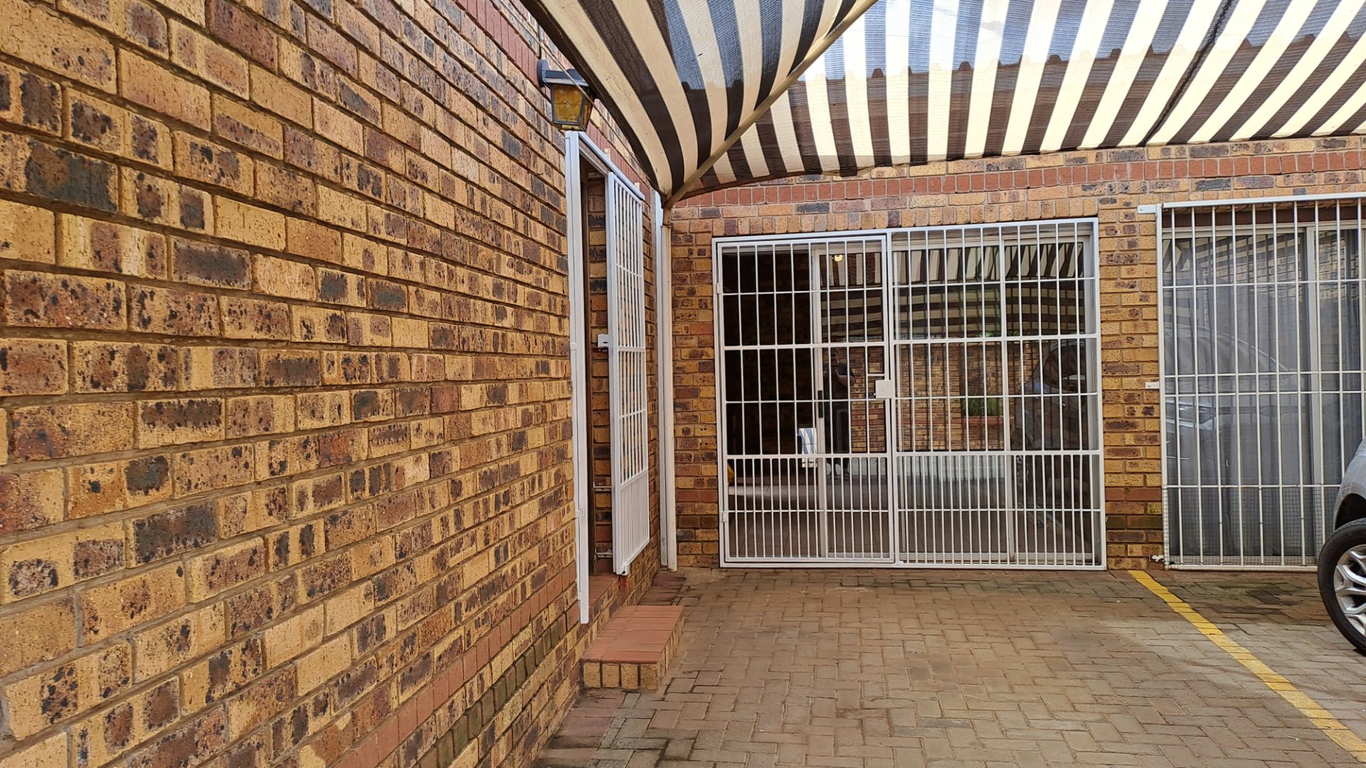 -Spacious living room with tiled floors and facebrick walls, with a security gate leading to the outside area