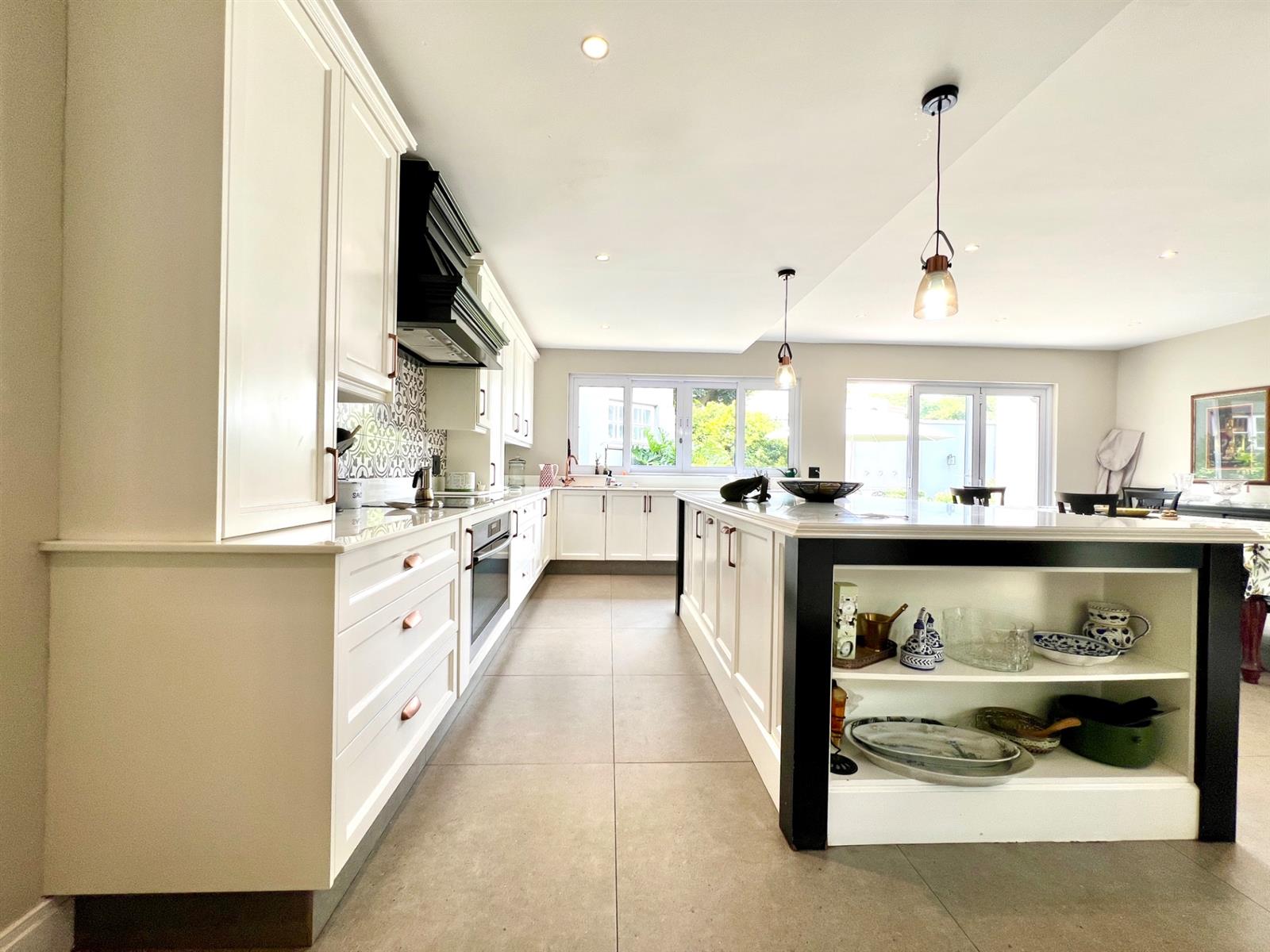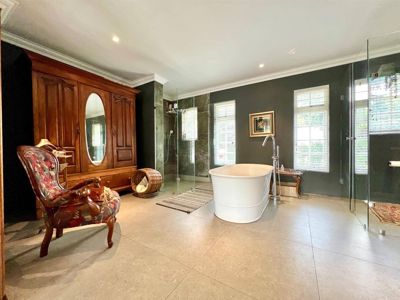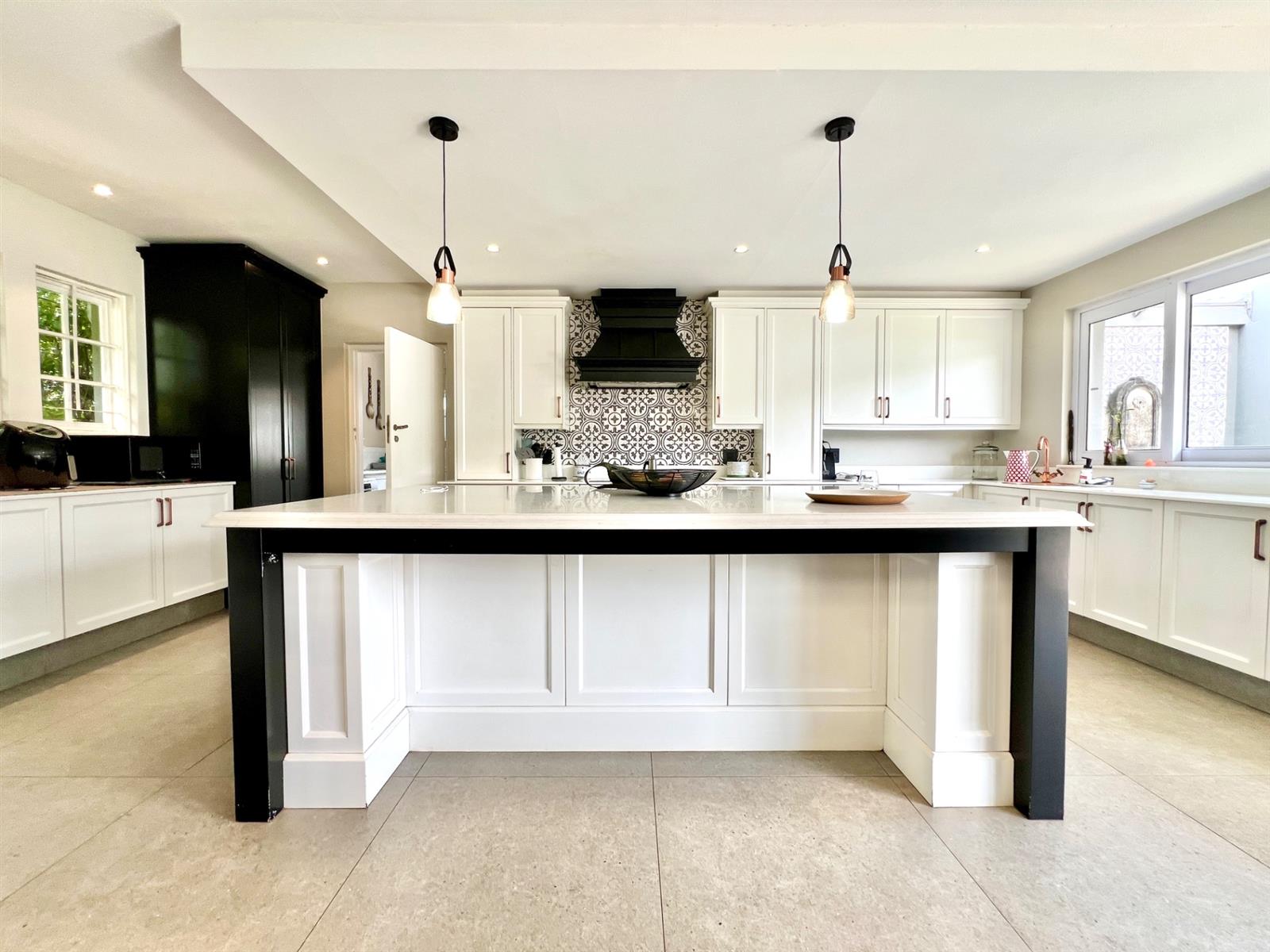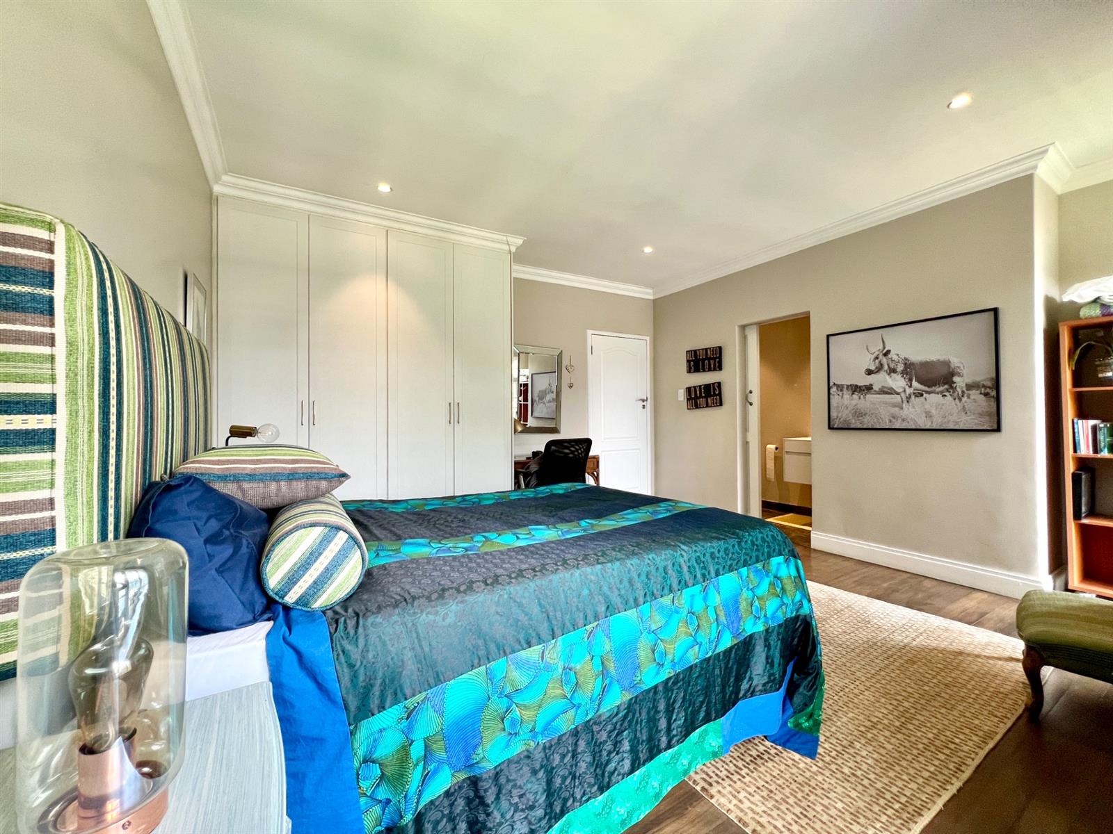 The white kitchen is truly the heart of the home. It features expansive granite countertops, a centre island with downlighting, hob and under-counter oven, as well as a separate laundry and scullery. There is ample space for an eight-seater breakfast table, making it perfect for everyday family living. Sliding stack doors open onto a breakfast patio and garden, and a private courtyard offers a quiet, sun-filled spot for morning coffee. A well-established vegetable garden adds to the home’s charm.