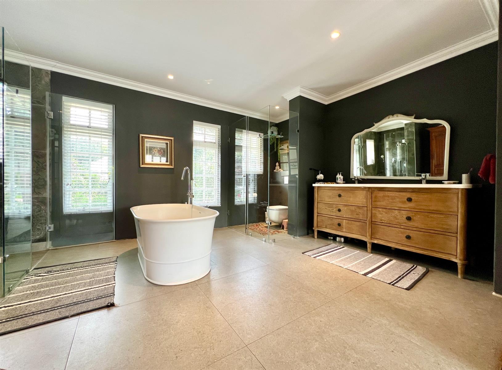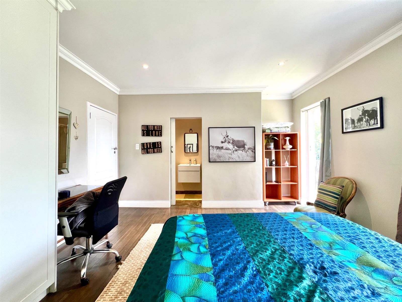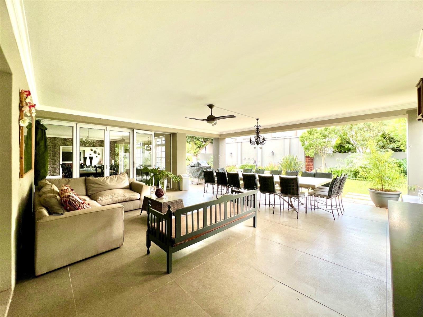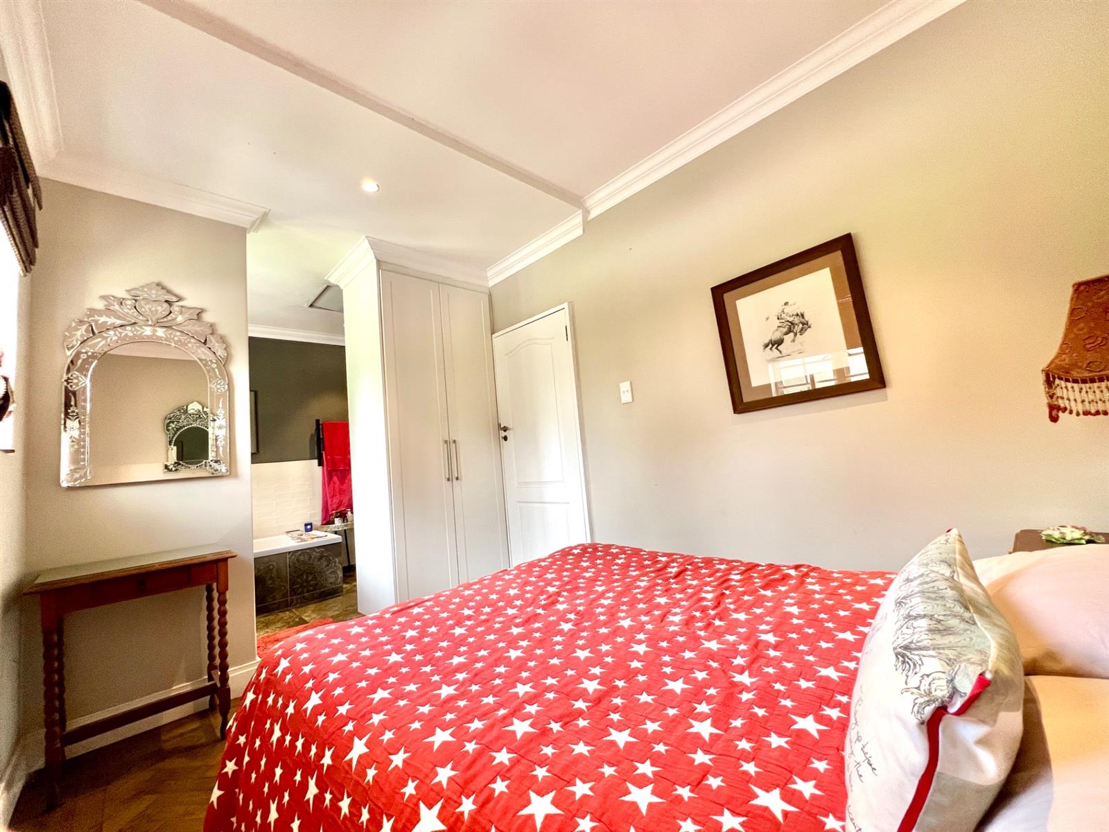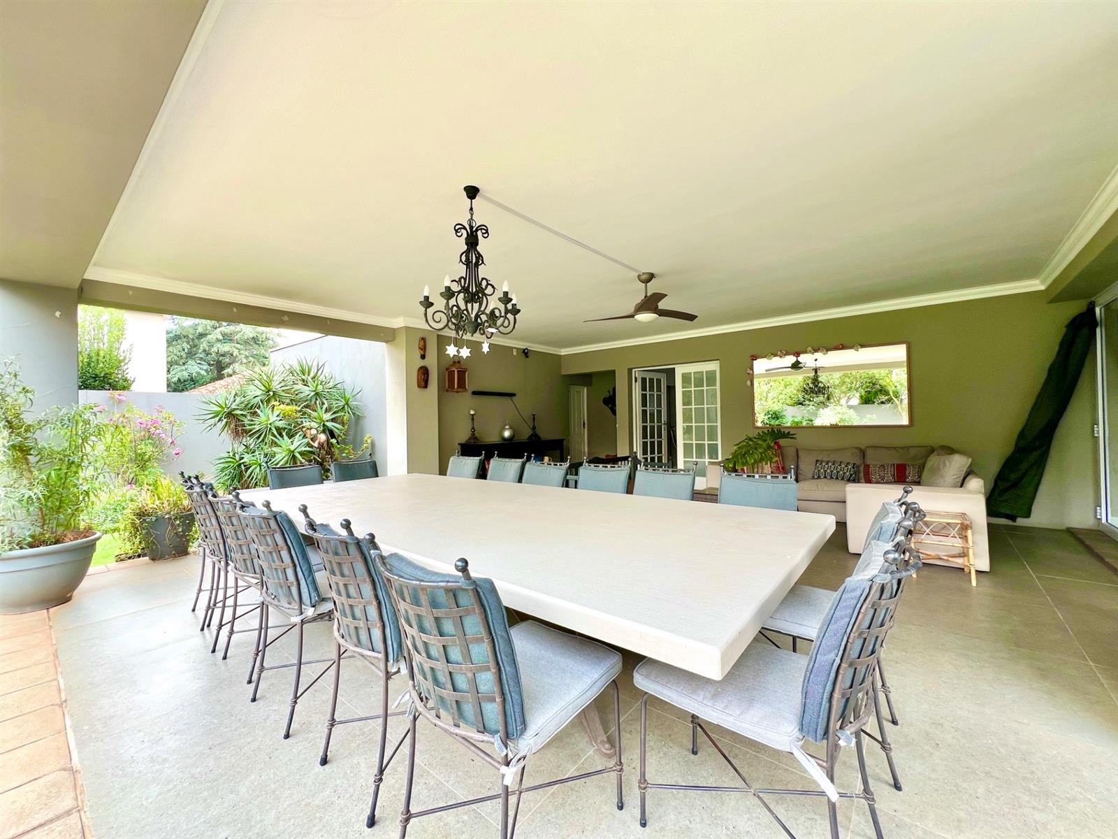 The white kitchen is truly the heart of the home. It features expansive granite countertops, a centre island with downlighting, hob and under-counter oven, as well as a separate laundry and scullery. There is ample space for an eight-seater breakfast table, making it perfect for everyday family living. Sliding stack doors open onto a breakfast patio and garden, and a private courtyard offers a quiet, sun-filled spot for morning coffee. A well-established vegetable garden adds to the home’s charm.