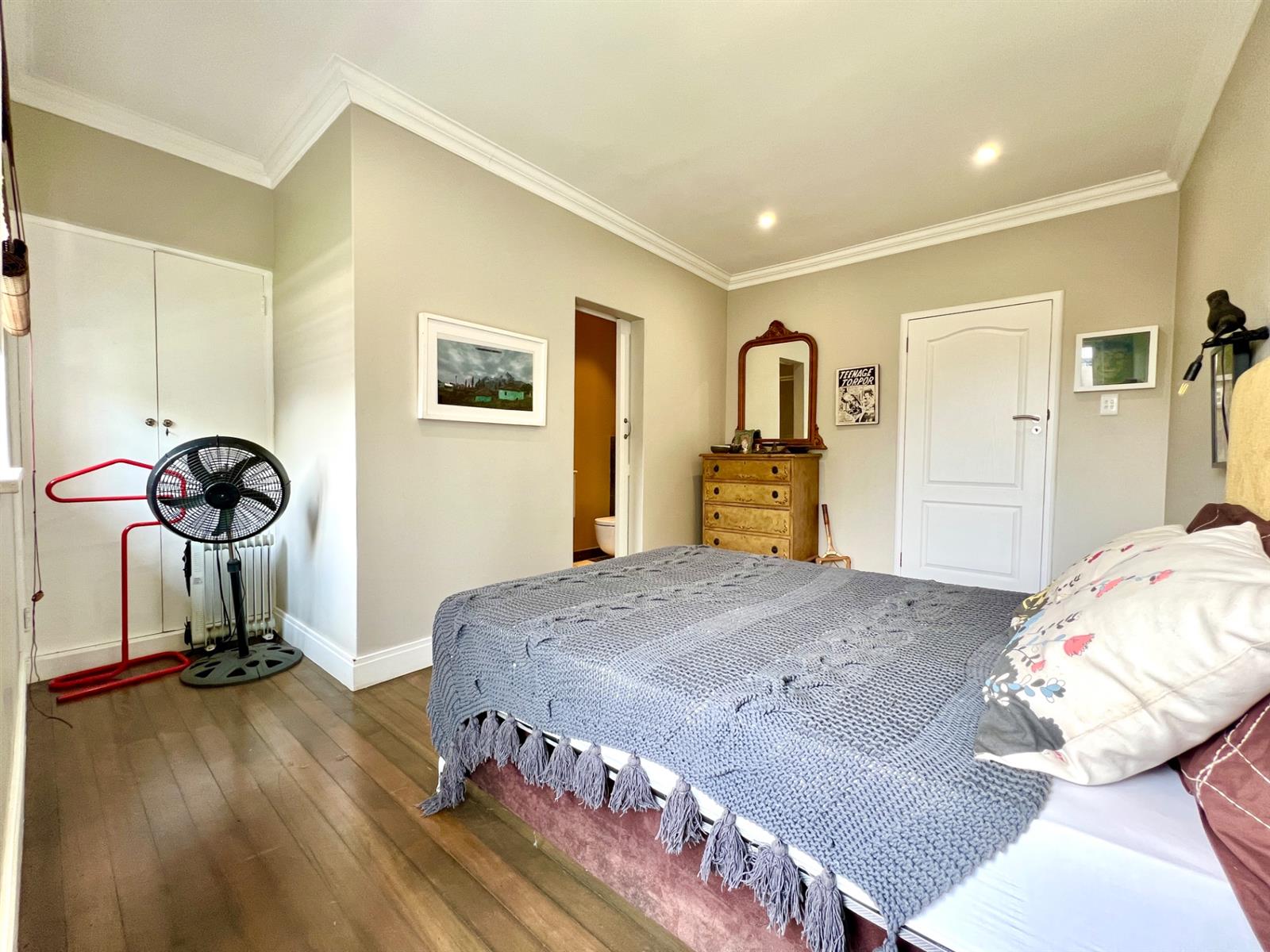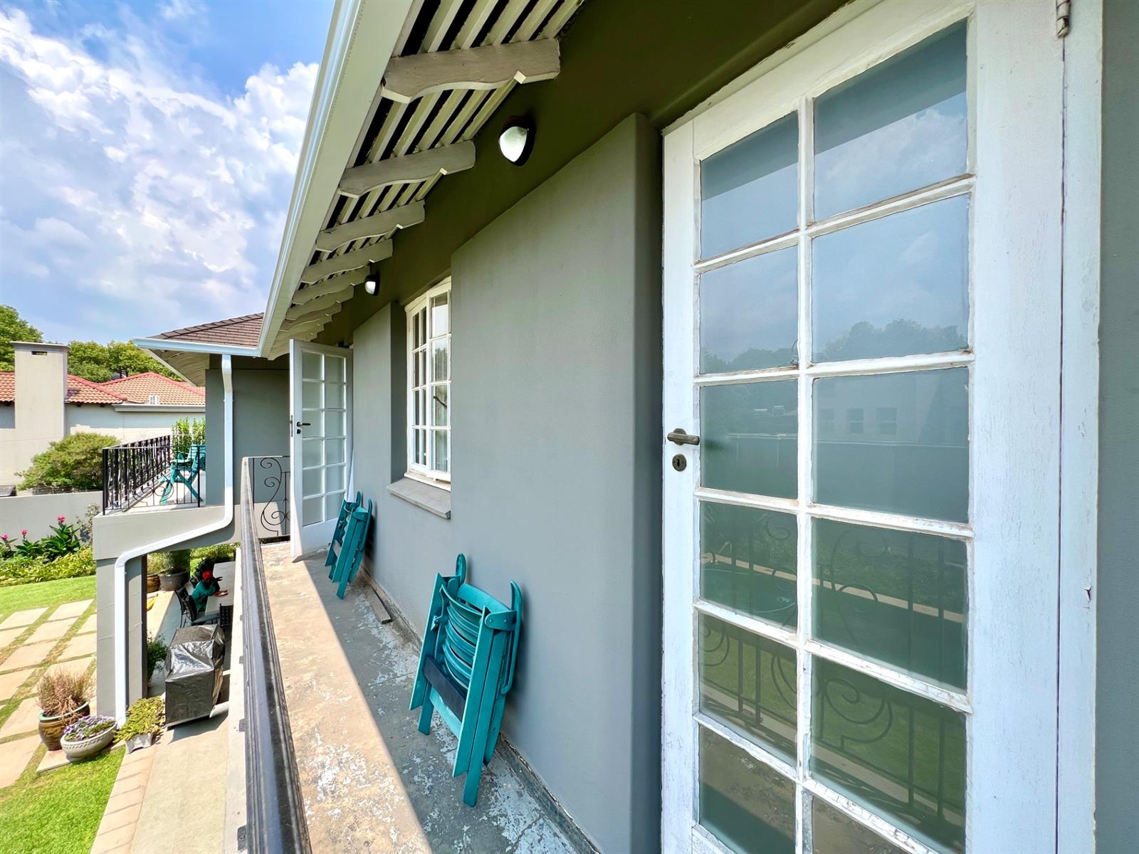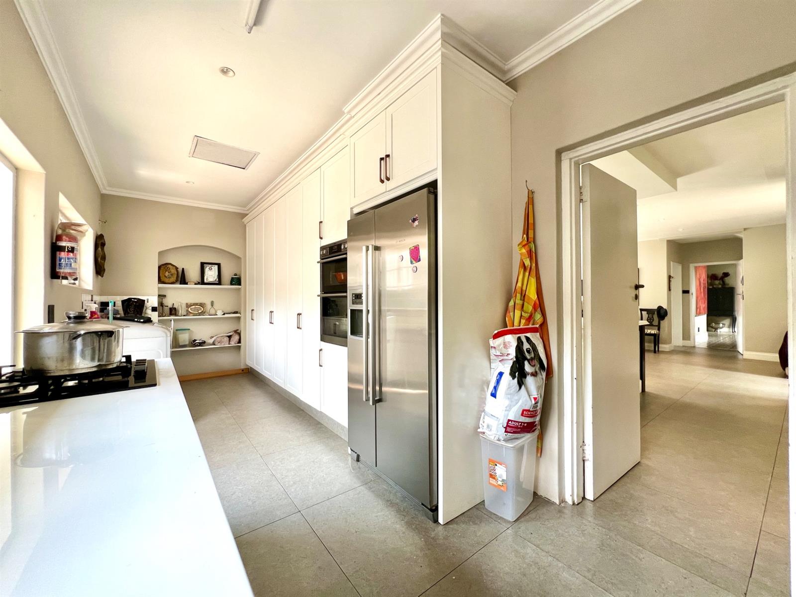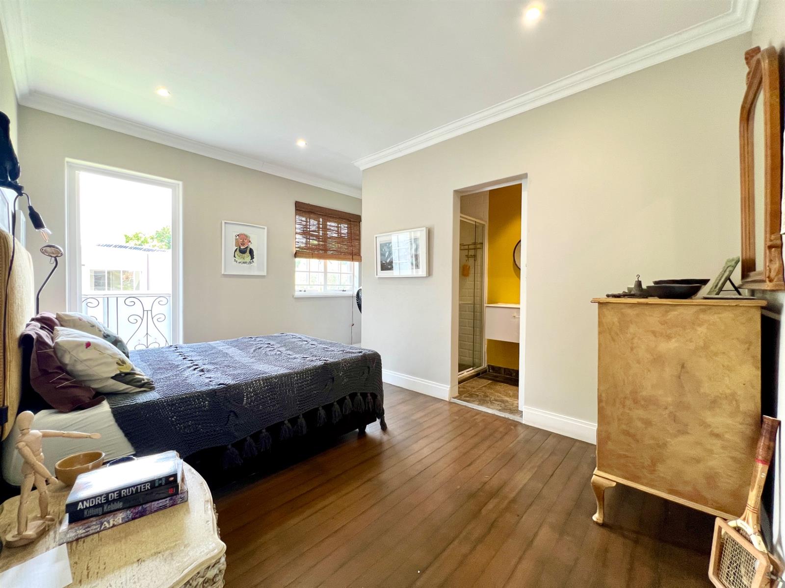 The white kitchen is truly the heart of the home. It features expansive granite countertops, a centre island with downlighting, hob and under-counter oven, as well as a separate laundry and scullery. There is ample space for an eight-seater breakfast table, making it perfect for everyday family living. Sliding stack doors open onto a breakfast patio and garden, and a private courtyard offers a quiet, sun-filled spot for morning coffee. A well-established vegetable garden adds to the home’s charm.